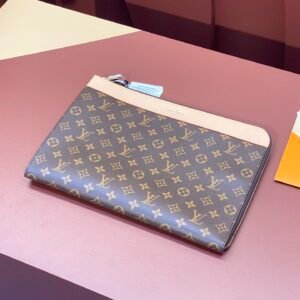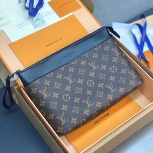 M82540 Presbyopia, a large-capacity « Pochette Jour » that can store a laptop. Monogram Eclipse canvas with black leather trim, finished with black metal hardware. The L-shaped zipper opening allows you to take out the contents immediately, which is also its charm. Can be used as a clutch or bag.