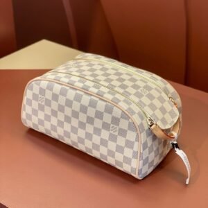 M47528 white grid! (Cosmetic bag) The large toiletry bag has a generous appearance and is made of soft-touch canvas. It is equipped with a large double zipper opening for easy access to items. Holds all your toiletry essentials. -Damier canvas texture, cotton lining-gold metal hardware-double zipper closure, equipped with leather straps-built-in zipper patch pocket-size28x16x13cm.