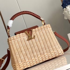 [Exclusive real shot M48865 brown woven bamboo basket/small size] This Capucines BB handbag uses rattan soaked in water to soften it, and then hand-woven for three hours to achieve a classic configuration. It has a calfskin-shaped flap and top handle, and a slim, detachable and adjustable leather strap for easy shoulder or cross-body wear. 27 x 17 x 14 cm (length x height x width)