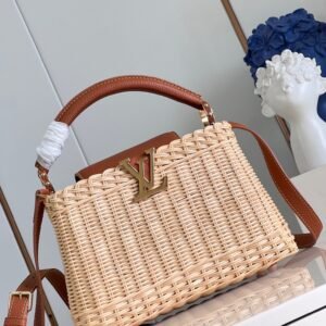 [Exclusive real shot M48865 caramel bamboo basket/small size] This Capucines BB handbag uses rattan soaked in water to soften it, and then hand-woven for three hours to achieve a classic configuration. It has a calfskin-shaped flap and top handle, and a slim, detachable and adjustable leather strap for easy shoulder or cross-body wear. 27 x 17 x 14 cm (length x height x width)