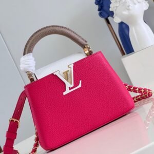 [Exclusive real shot M48865 raspberry red with white chain/mini] Capucines mini handbag French imported calfskin, shiny metal accessories, unique Capucines cover can be stored in the bag to display the letter logo, and can be turned out to display the Monogram Flower Pattern size:21x14x8 cm