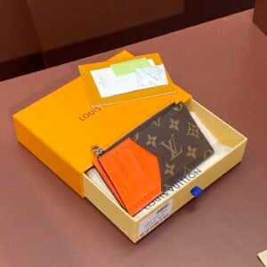 M64038 Orange! COIN CARD HOLDER The Coin Card Holder is made of Louis Vuitton’s signature Taiga leather. It has a slim appearance and is ideal for safely storing coins and bills. There are multiple credit card slots and bill compartments inside, as well as a silver zippered coin pocket.