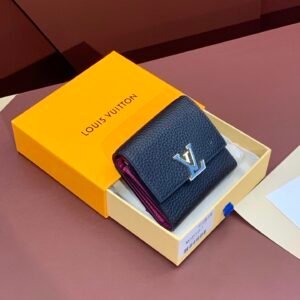 M68587 Black This Capucines XS wallet can be placed in all Capucines handbags, even the small BB style can be easily stored. Crafted from full-grain Taurillon leather and lined with smooth calfskin, this ultra-compact wallet holds a woman’s daily essentials such as bills, change, credit cards and receipts, and features a snap closure with classic leather accents. LV logo on face.
