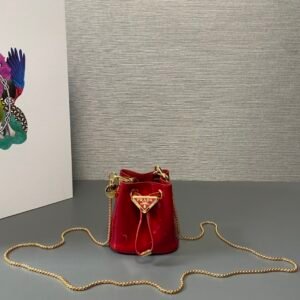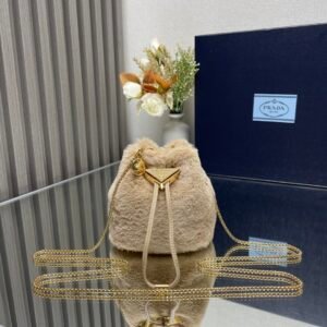 [Top original order] Mini mini bucket bag????1NR016????This small bag is equipped with soft shearling, showing modern elegance and full of winter charm. It has a chain shoulder strap and a drawstring top decorated with an enameled metal triangle logo. The upper body effect is fashionable and cute, size: length 9x height 9.5x bottom 6cm