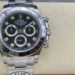 Case Diameter 40mm Thickness 12.5mm Bezel SS Bezel Case Material High Grade Solid Stainless Steel 904L Dial Black Dial with Diamond Markers – Genuine Diamond Strap High Grade Solid Stainless Steel 904L with New Design Flip Lock Clasp Crystal Sapphire Crystal, Same Thickness and Height above bezel as per Genuine (Etched Rolex emblem at 6:00 on the sapphire glass) Caseback Solid case back Movement Super Asia Clone 4130 Slim Chronograph Automatic with Fully Functional Chronograph and fully decorated Rotor & Bridges/Plates like Rolex Genuine Calibre 4130 for Daytona Chronograph (Super Clone 4130 with Full Functional Chronograph) Function Hours, minutes, sub-seconds display and chronograph Water Resistance >50M -