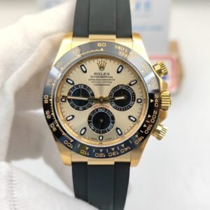 Case Diameter 40mm Thickness 12.2mm Bezel Latest Clean Factory Ceramic tachymeter bezel, same shape and depth as genuine bezel (Best aftermarket replica Daytona bezel) Case Material 18K Yellow Gold Plated Solid 904L stainless steel case Dial Yellow Gold Dial with Black Subdials, Super Lume Hands Set and Markers Strap Oysterflex Black Rubber Strap with Rolex Flip-Lock Clasp Crystal Scratch-proof sapphire crystal with semi-invisible crown etched at 6:00 position of the crystal Caseback Solid Case Back Movement Asian Super Clone4130 movement 28800vph, 1:1 replicated from the genuine movement, fully functional. Blue spring same as genuiine Function Hours, minutes, sub-seconds display and chronograph Water Resistance > 30m -