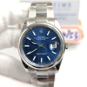 Case Diameter 41mm Thickness 11.7mm Bezel Fluted Bezel Case Material Solid Stainless Steel 904L Dial Blue Patterened Dial with Stick Markers Strap Solid Stainless Steel 904L Oyster Bracelet with New Style Rolesor Deployant Buckle Crystal Sapphire Crystal, Same Thickness and Height above bezel as per Genuine (With etched crown at 6:00 position) Caseback Solid case back Movement Asia Clone 3235 Automatic Movement, 28800bph with Fully Decorated Rotor and Bridges & Plates like Genuine Rolex Calibre 3235 Function Hours, minutes, seconds and date display Water Resistance >50M -