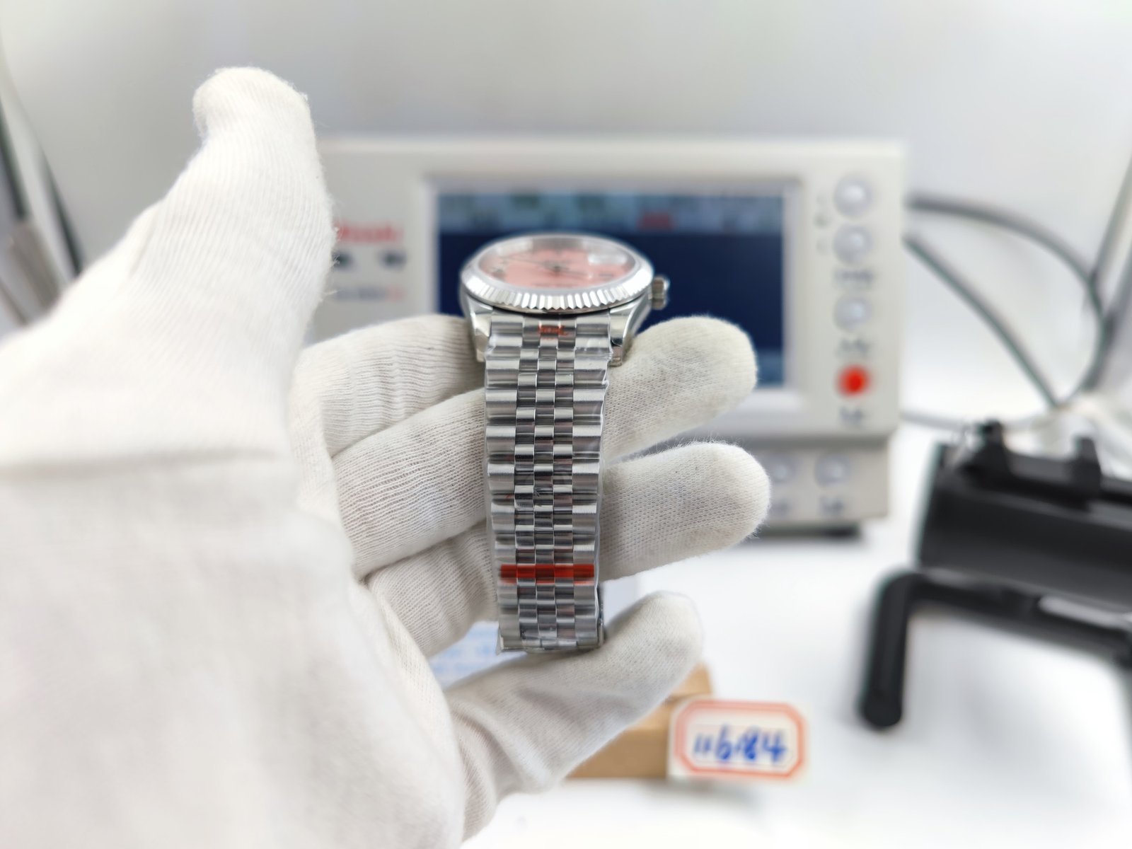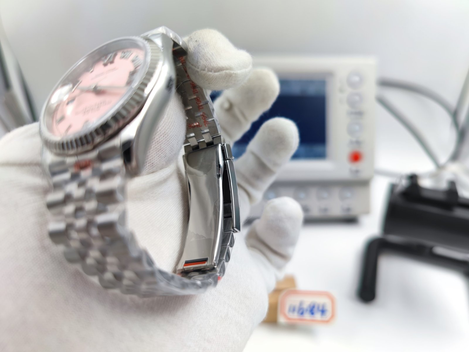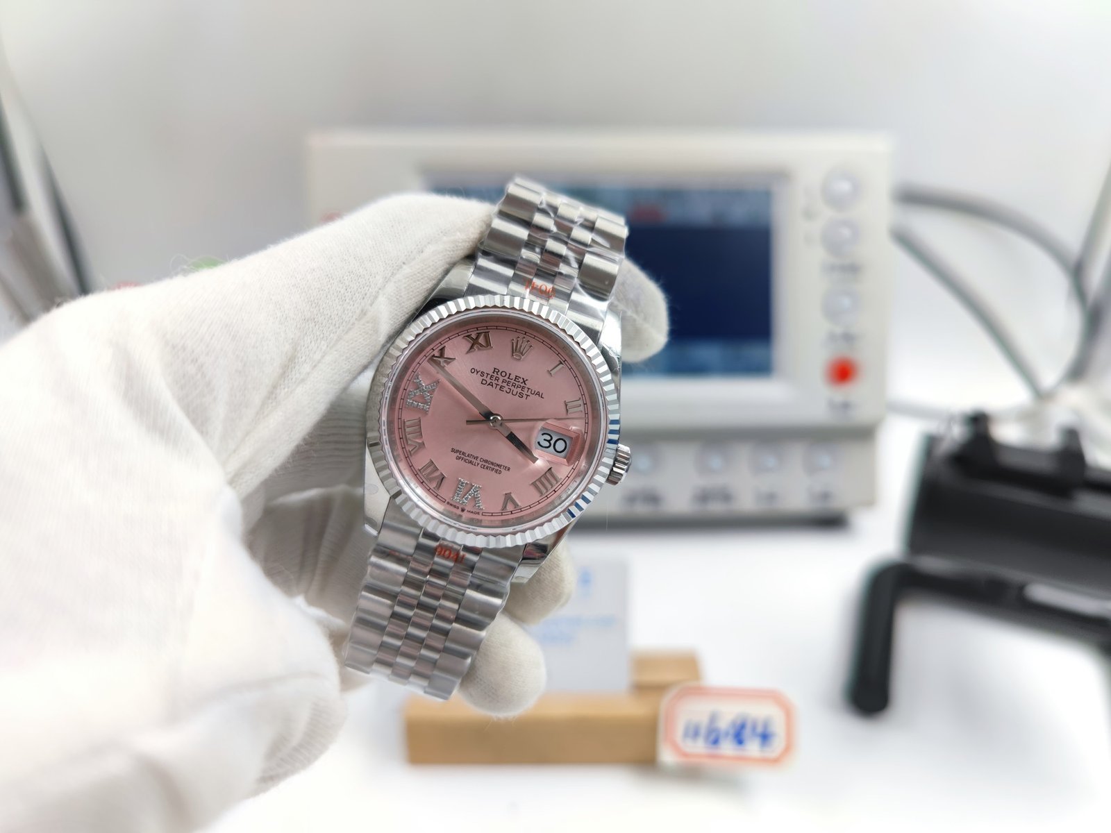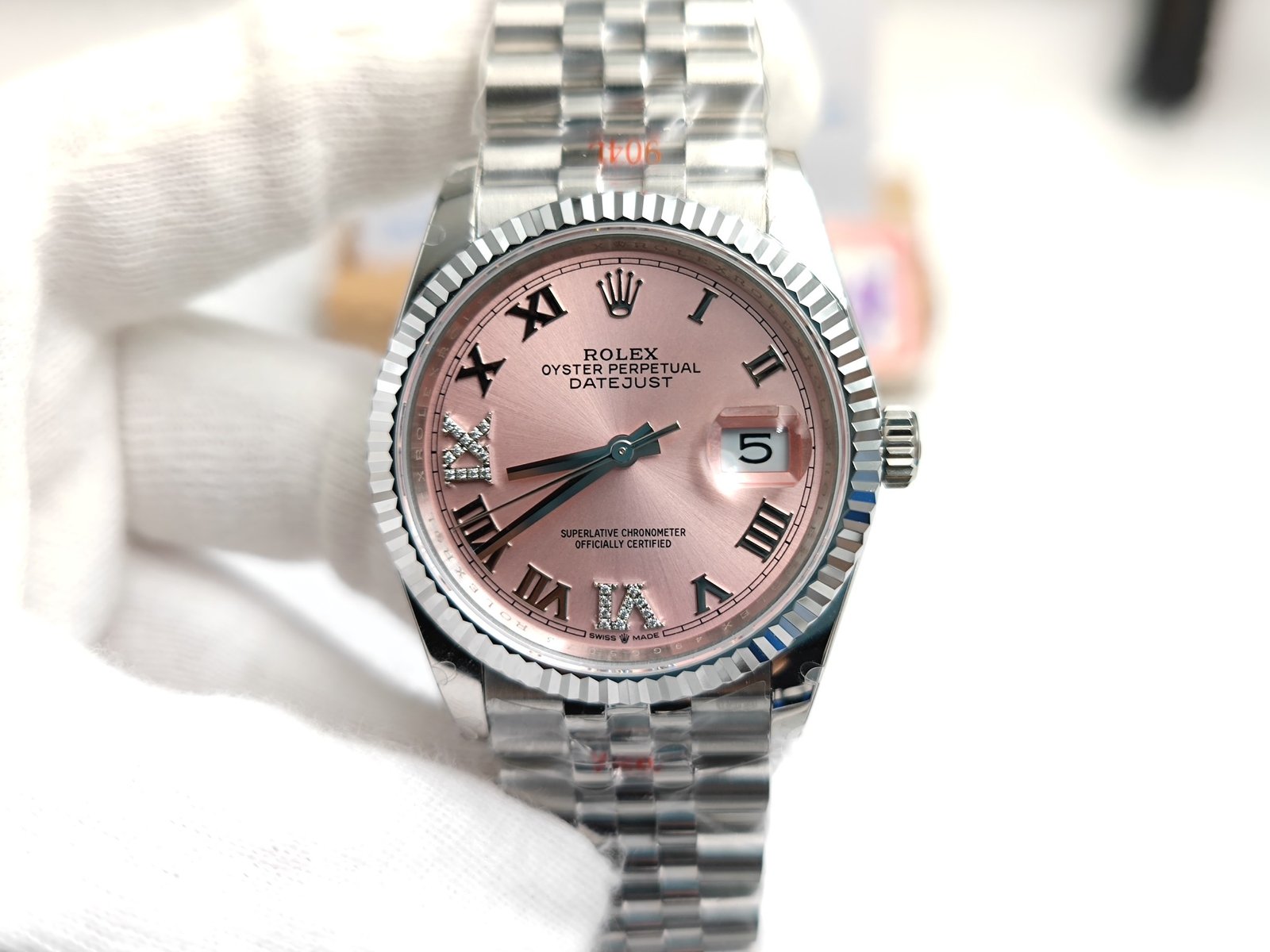 DIAL COLOR: Pink Dial with Roman Markers and Diamond Markers at 6 & 9