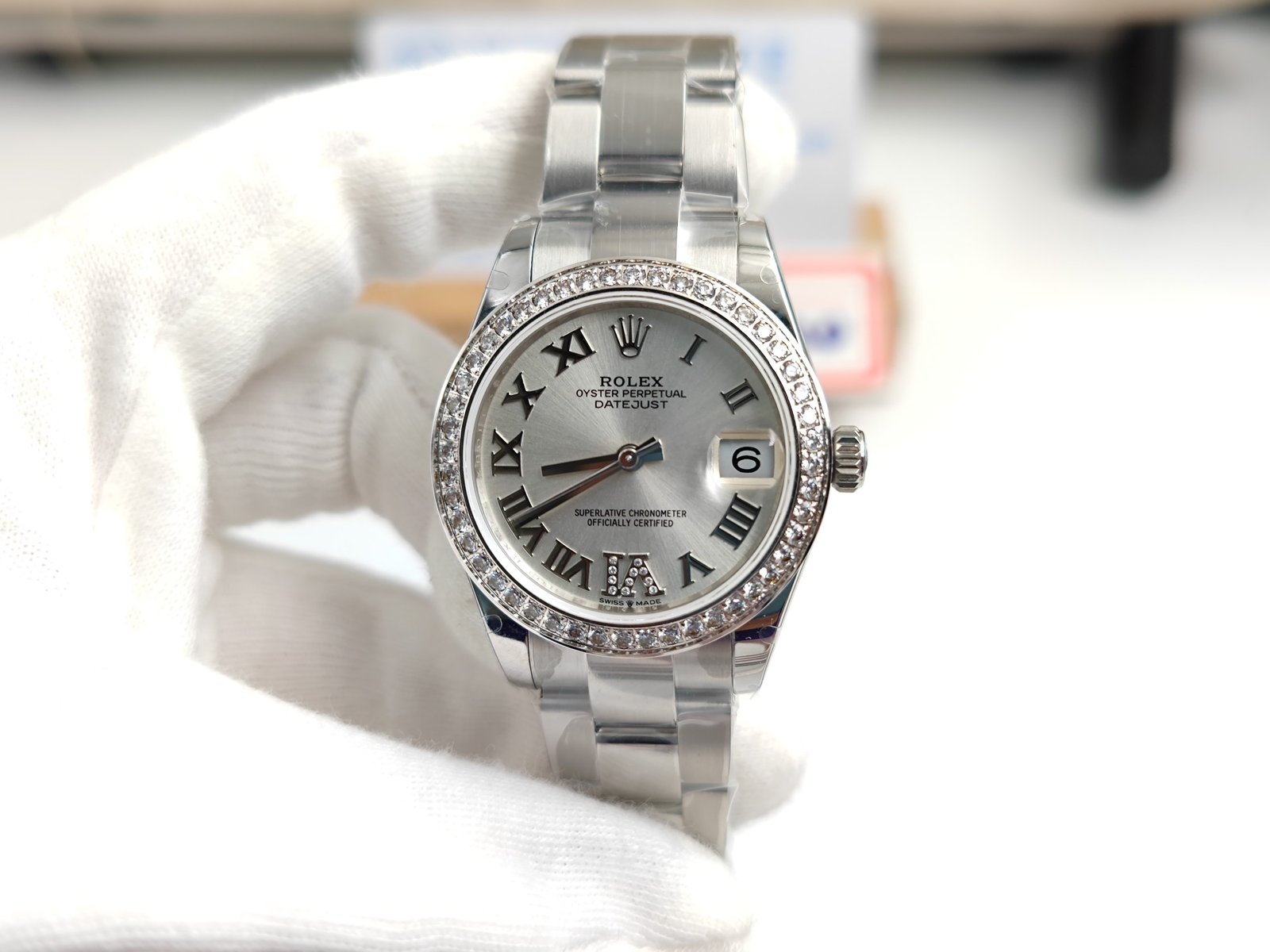 DIAL COLOR: Silver White Dial with Roman Markers and Diamond Crested on 6 Marker