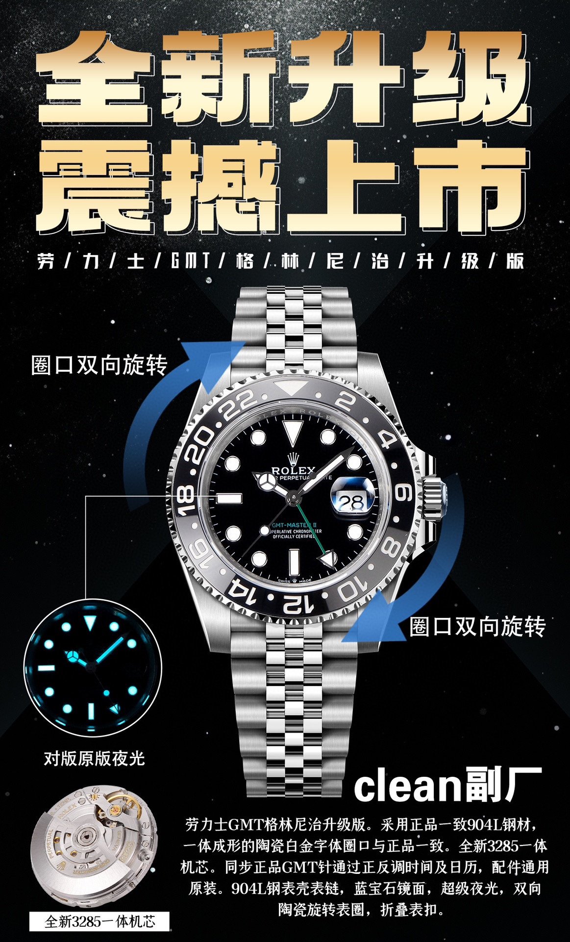 MOVEMENT: Asia Clone DD3285 Automatic GMT movement with decorated bridges & rotor with correct hand stack (Hour Hand Adjustable) – Functions 1:1 like the Genuine Rolex Calibre 3186