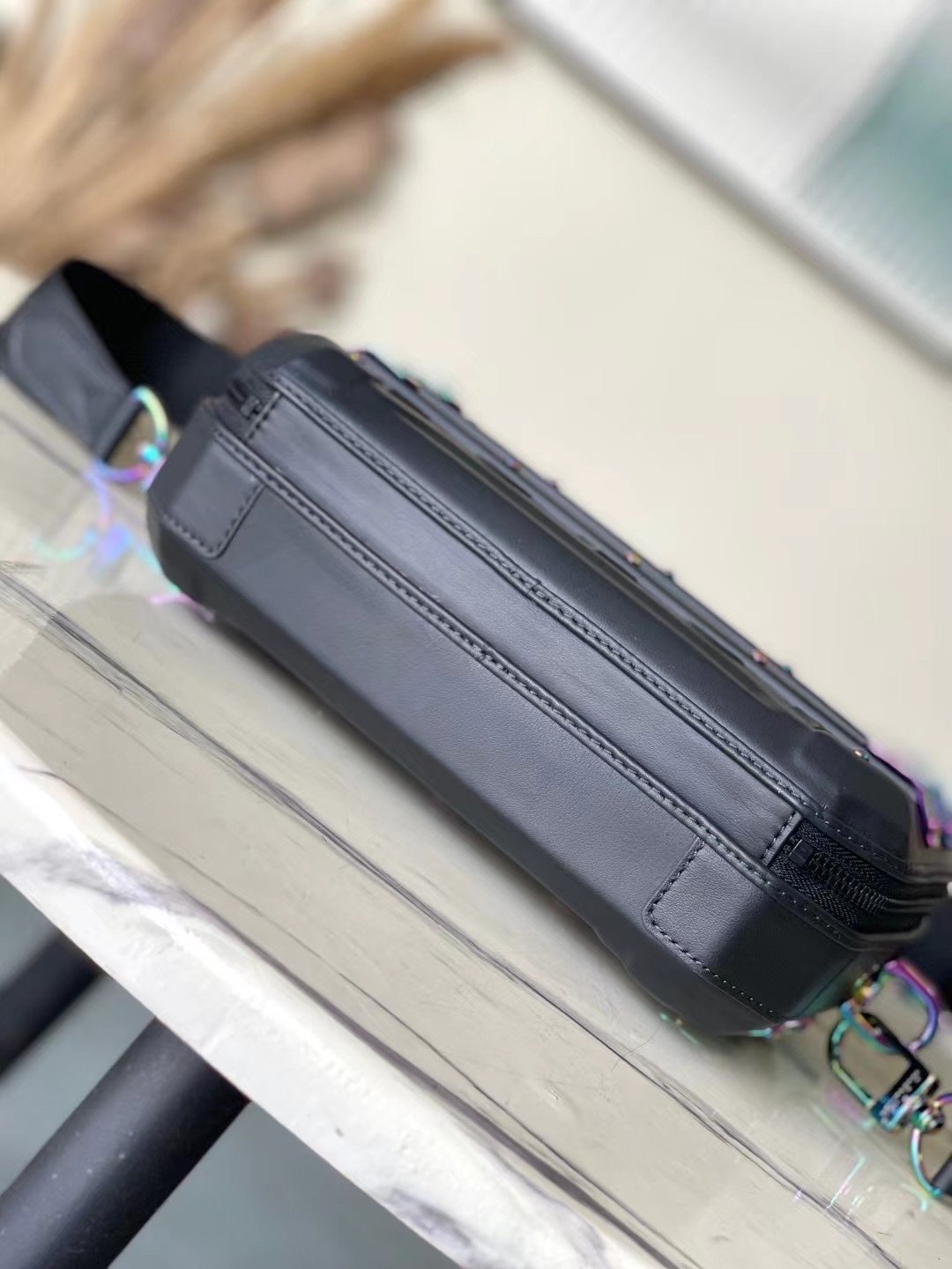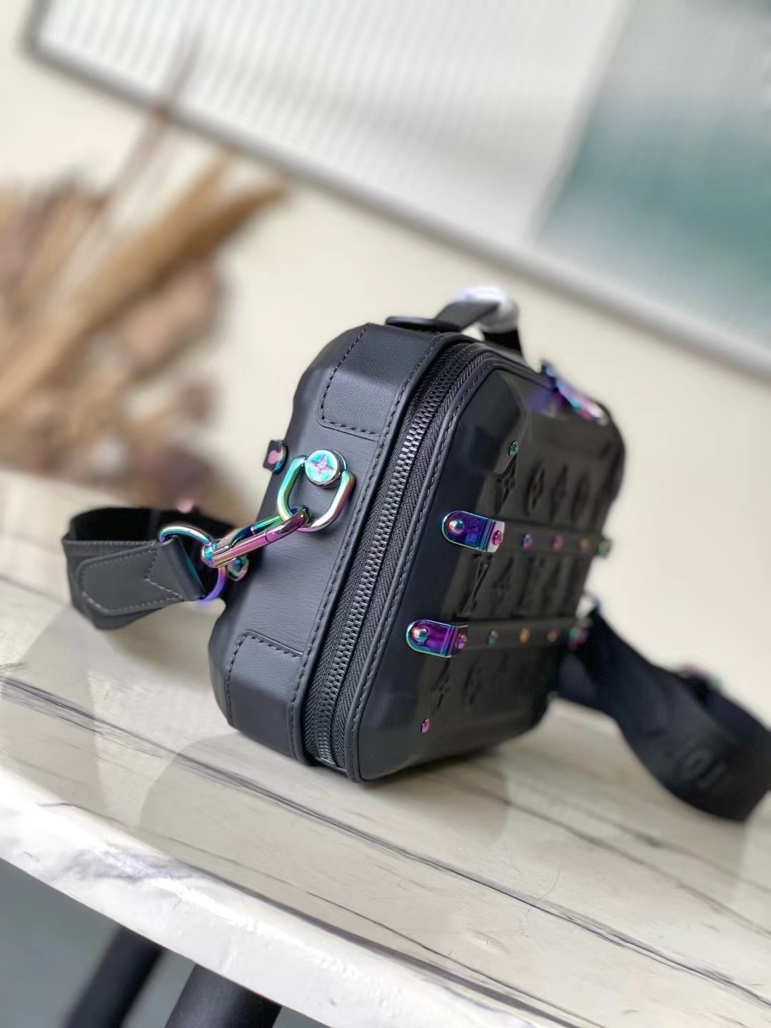 Top Original M21935 Black Future Trunk Bag is a surreal reinvention of the traditional hard trunk. The hard yet lightweight design of cowhide leather is complemented by cowhide trimmings and hardware, complete with top handles and a wide removable shoulder strap with a jacquard logo woven into the latter. Dimensions: 25 x 15 x 8 cm (length x height x width)