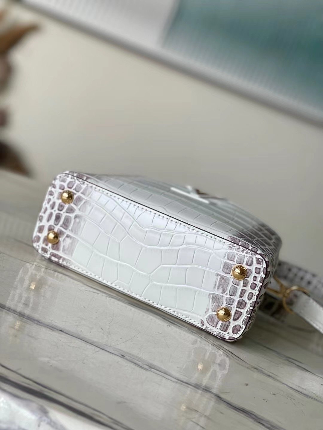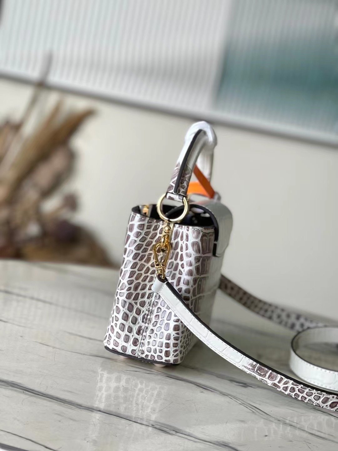 The Capucines mini bag is crafted from crocodile-effect leather for a luxurious feel. Lined with premium sheepskin leather and equipped with dazzling hardware. The chic Capucines flap can be stored inside the bag to reveal the brand’s logo, or flipped out to reveal the Monogram floral pattern. Its compact size makes this extraordinary bag perfect for evening events. Detailed features 21x14x8 cm (length x height x width)