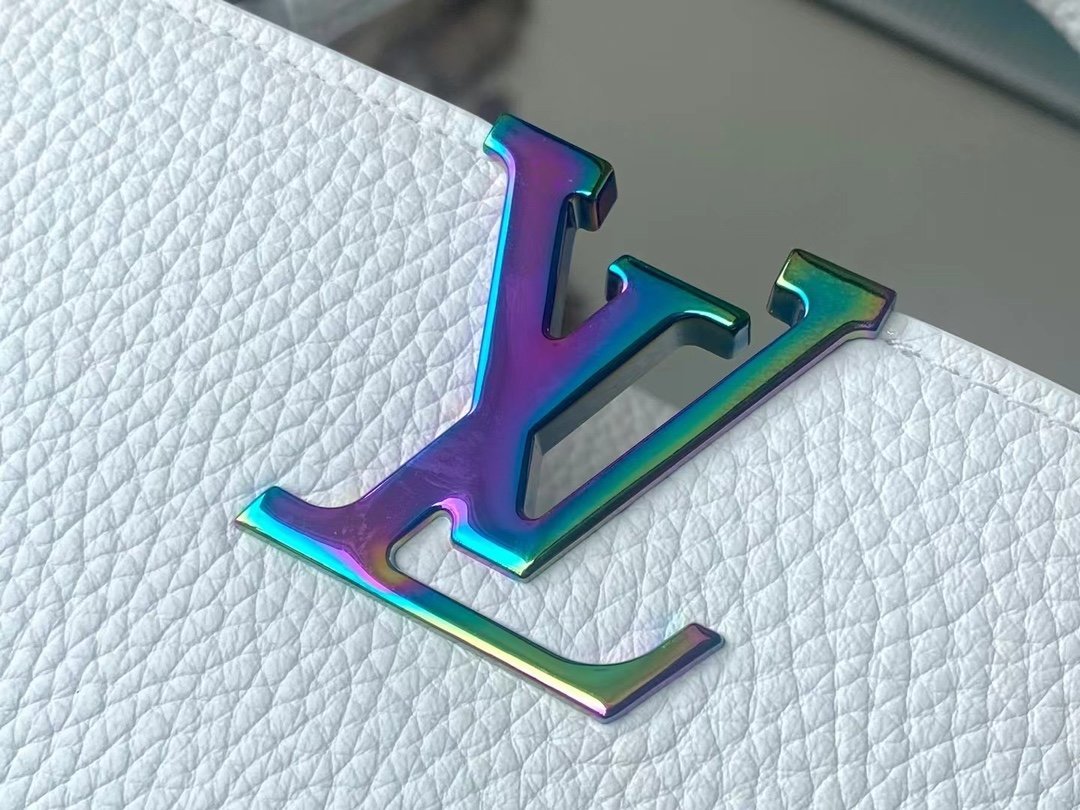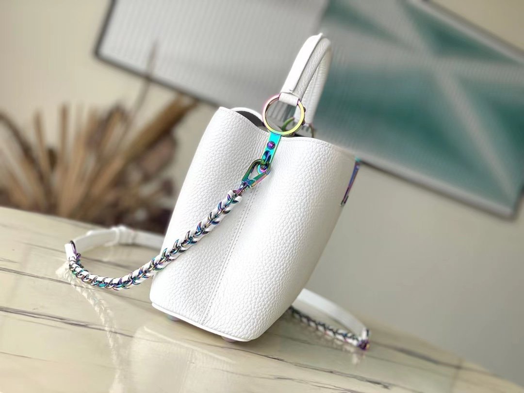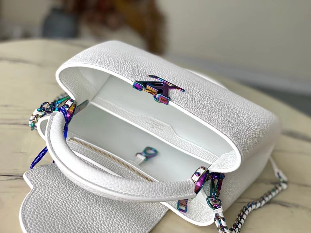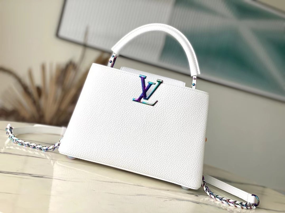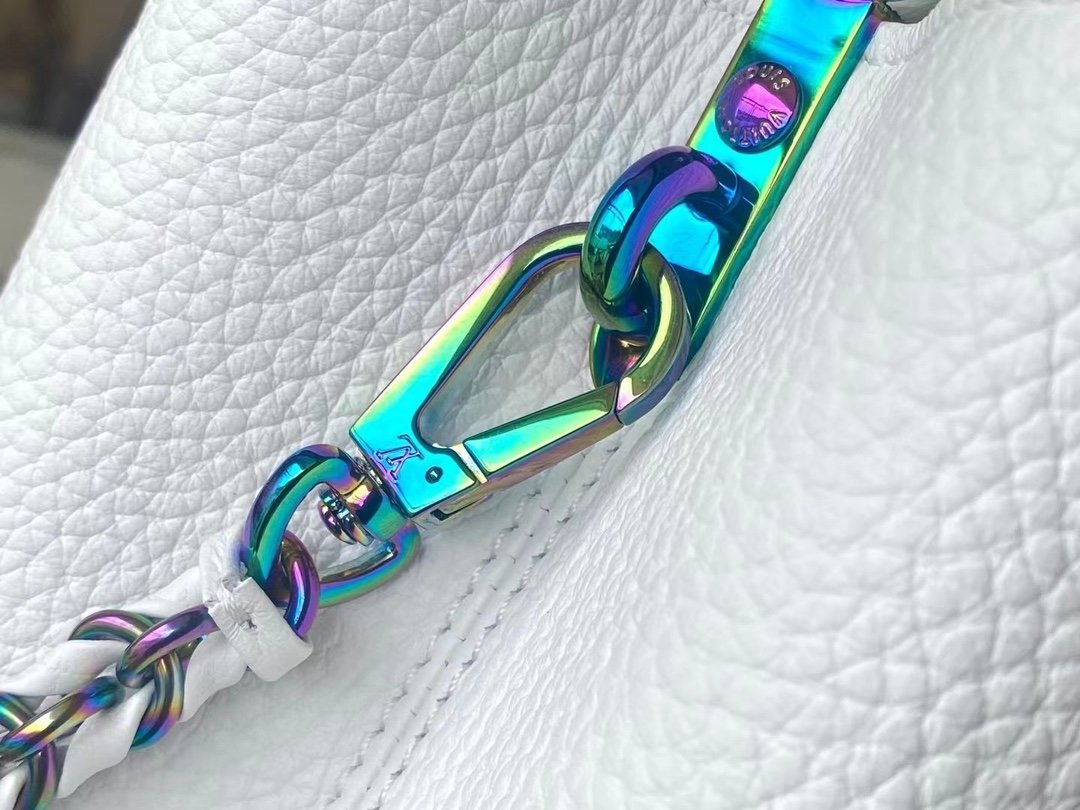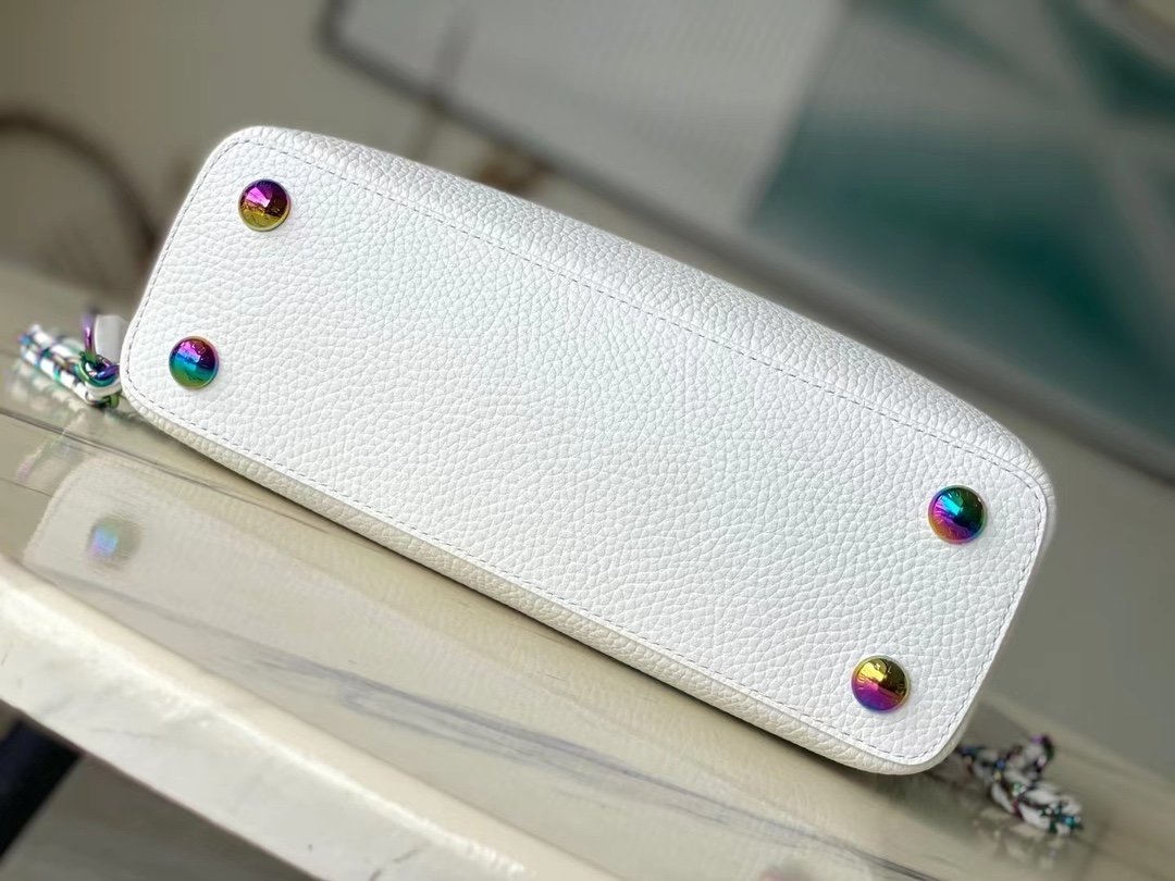 The special high-quality original leather M22054 white colorful gold buckle small Capucines BB handbag gives colorful colors to the LV letters and woven chain, which contrasts with the simple and elegant style of the Taurillon leather bag. The jewelry-like handle rings and rivets continue the lustrous color, while the metal hardware adds bright details. Detailed features 27 x 18 x 9 cm (length x height x width)