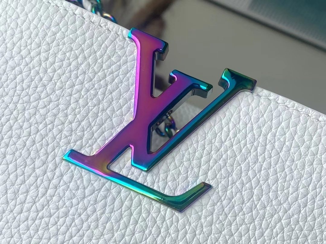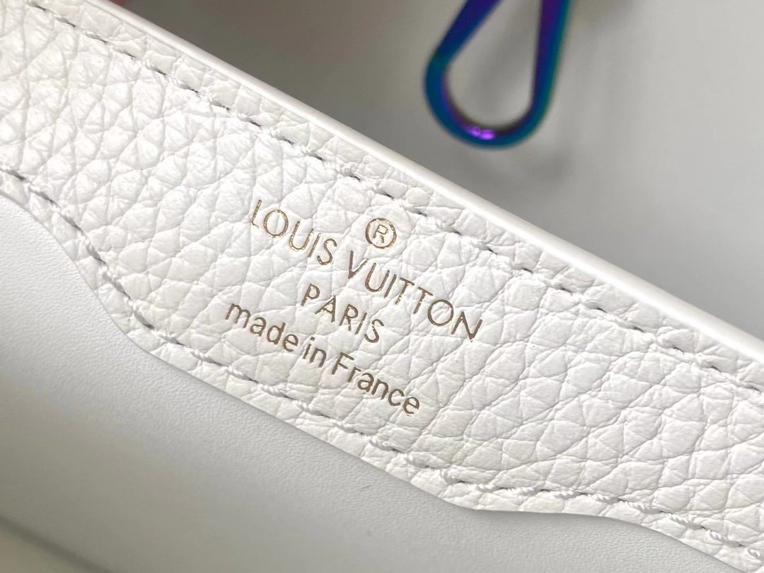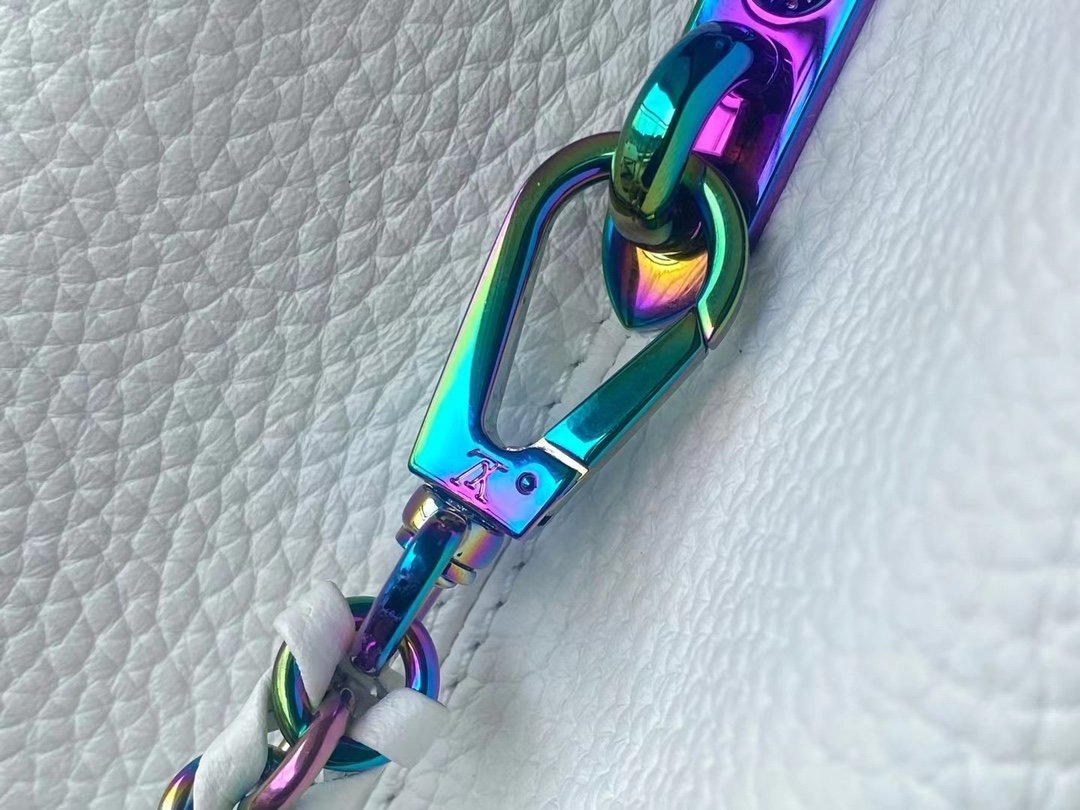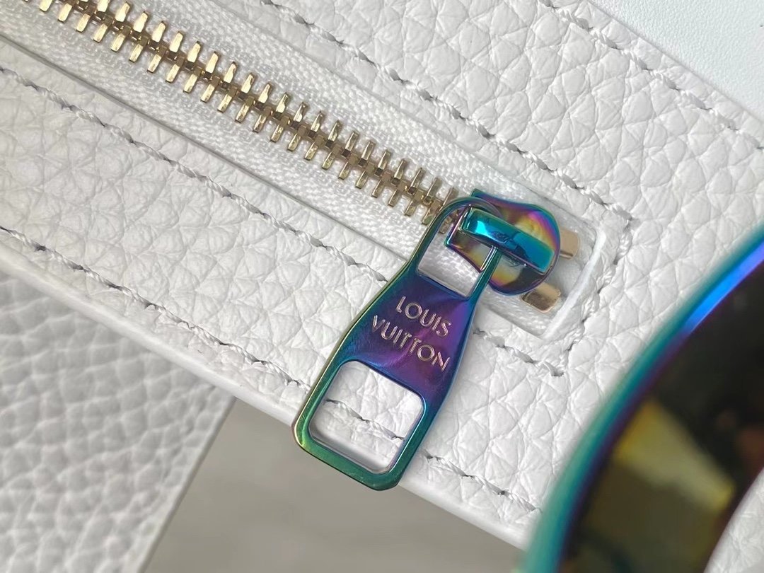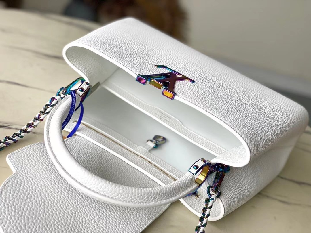 Premium quality original leather M22055 white with colorful gold buckle. This Capucines Mini handbag gives the LV letters and woven chain colorful colors, which contrast with the simple and elegant style of the Taurillon leather bag. The jewelry-like handle rings and rivets continue the lustrous color, while the metal hardware adds bright details. size: 31.5×20×11cm (length x height x width)