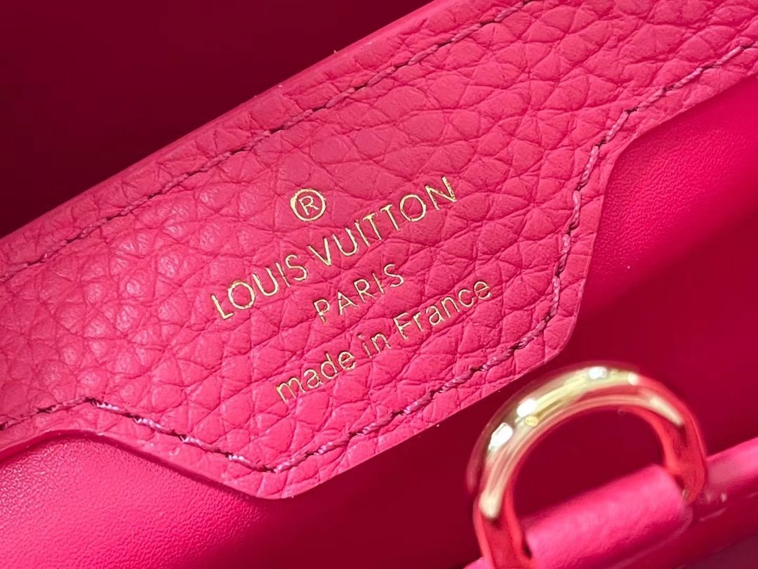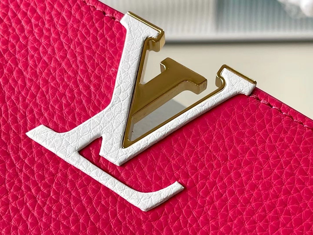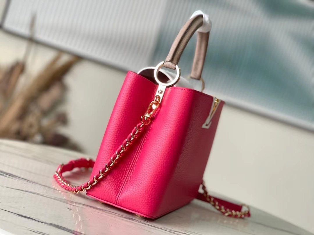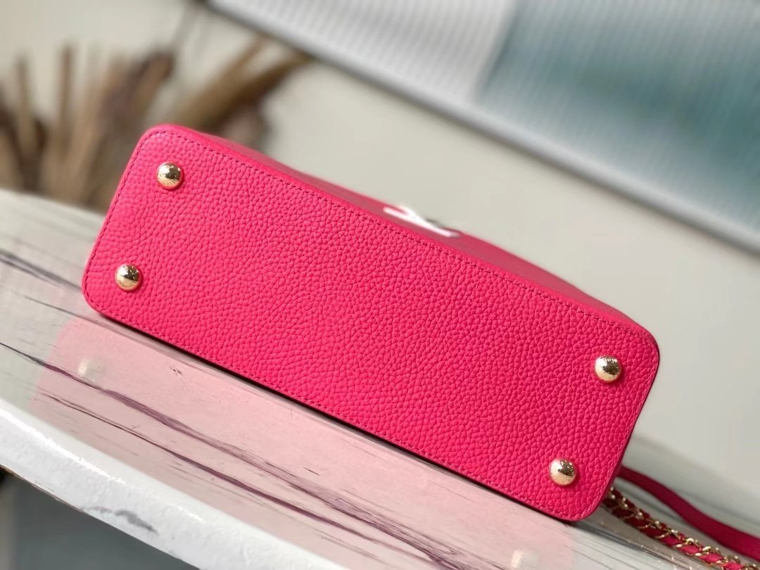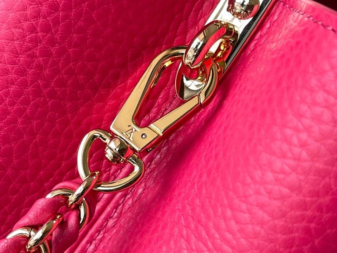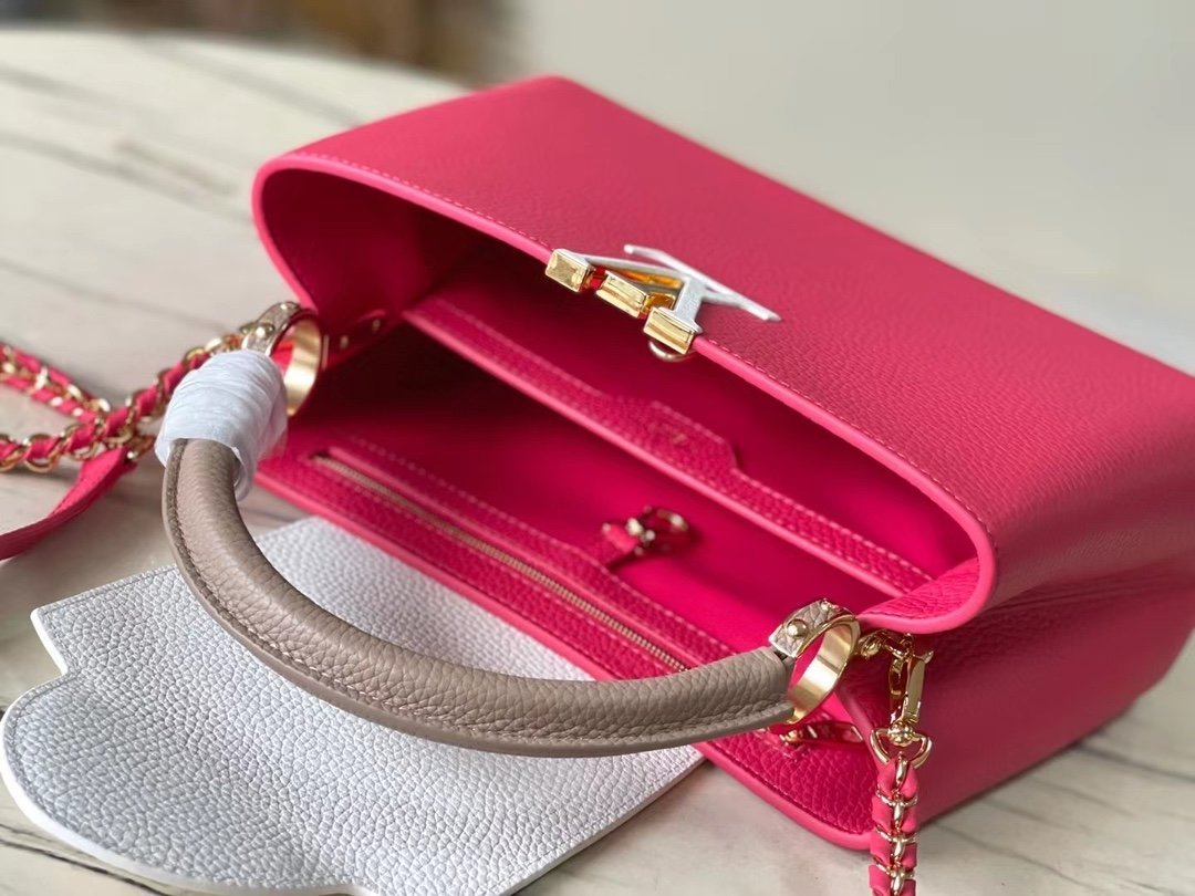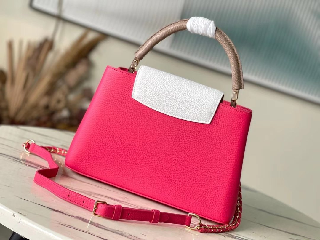 Top original order M22752/M48865 Medium size raspberry red with white chain. This Capucines handbag is dip-dyed in Taurillon leather with bright tones, with contrasting handles and flaps to inject vitality. It has an adjustable woven chain shoulder strap and can be worn as a shoulder or crossbody. Size: 31.5 *20*11cm