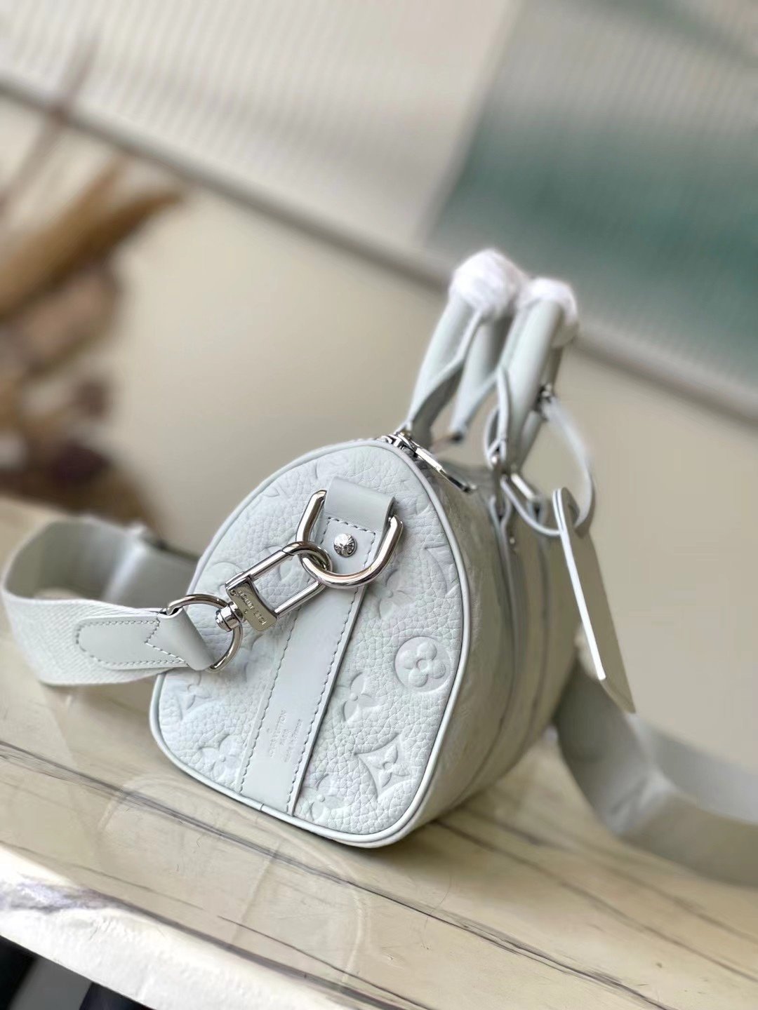 Top original order M23163 Gray full leather This Keepall Bandoulière 25 handbag is made of Monogram embossed grain Taurillon leather to create an urban travel design. Leather side straps and leather top handles are signature elements of the Keepall collection, while wide textile shoulder straps in the signature texture can be removed or adjusted at will. Detailed features25 x 15 x 11 cm (length x height x width)