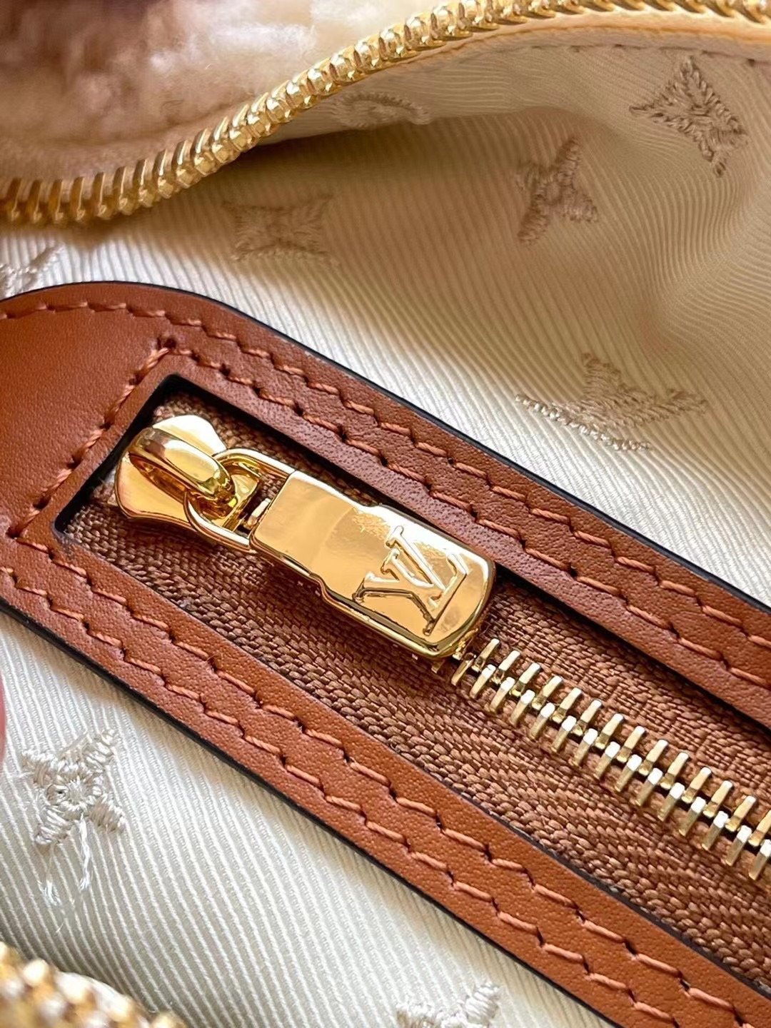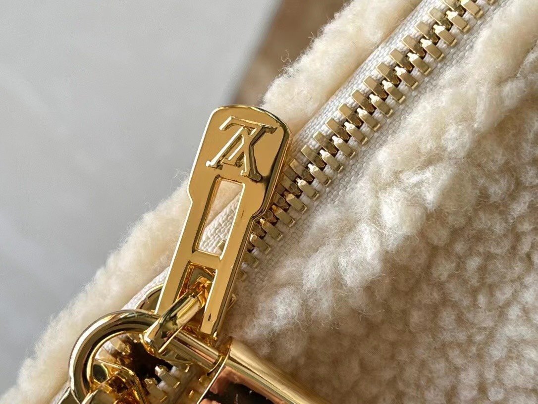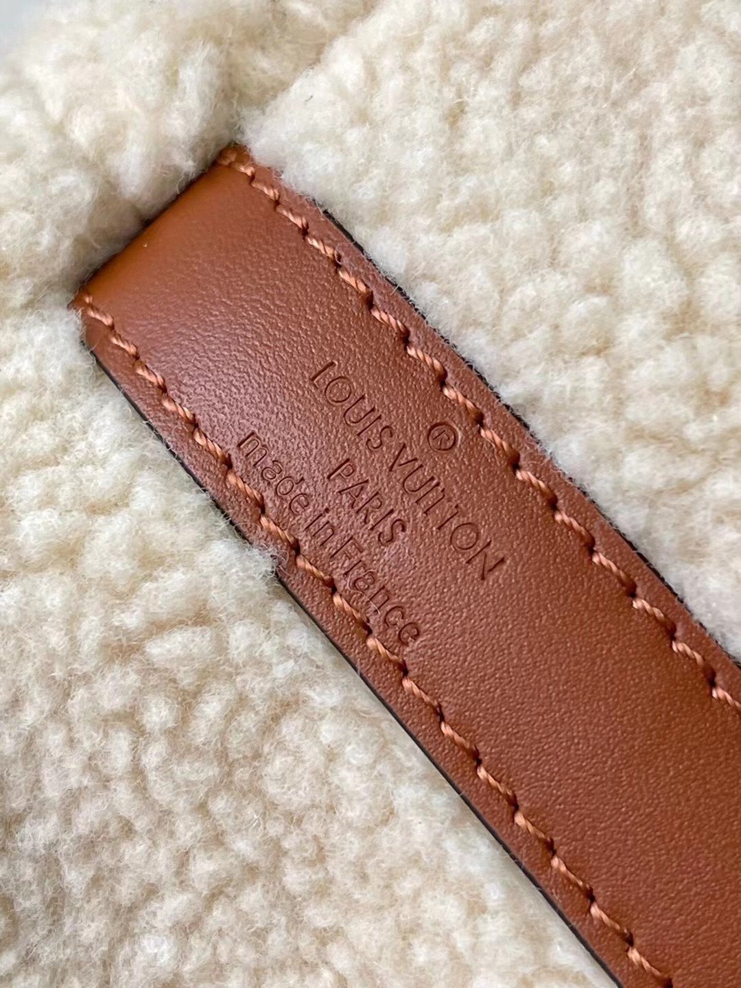 The top original M23468 white lamb velvet is made of soft wool leather with grained leather trimmings, and relies on complex intarsia technology to outline the PPGiant Monogram pattern, showing the trend of the winter series. Rolled leather top handles and removable and adjustable leather shoulder strap allow for a variety of carrying options. Dimensions: 25.0 x 19.0 x 15.0 cm