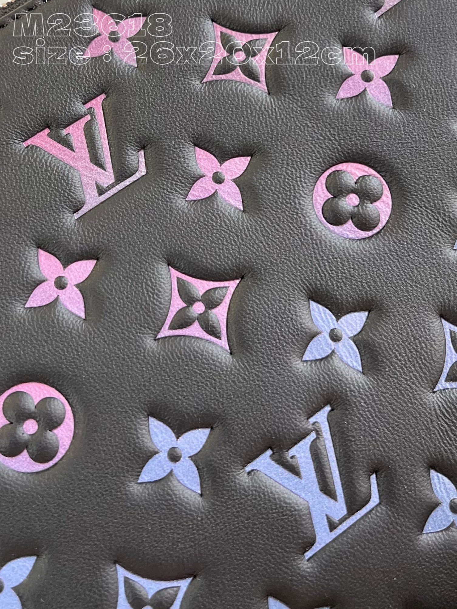 [Exclusive real shot M23618 Black Symphony] This small Coussin handbag is made of slightly shiny fluffy sheepskin, with a Monogram pattern to create an eye-catching holographic effect. The detachable chain is a sophisticated iridescence that changes colors in the light. 26 x 20 x 12 cm (length x height x width)
