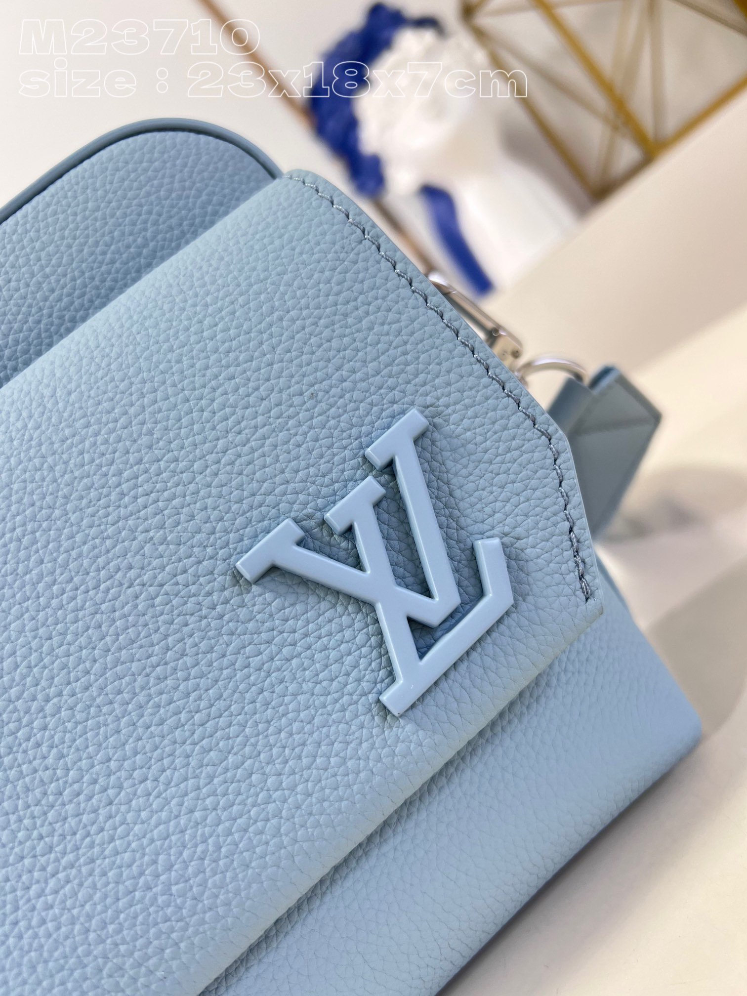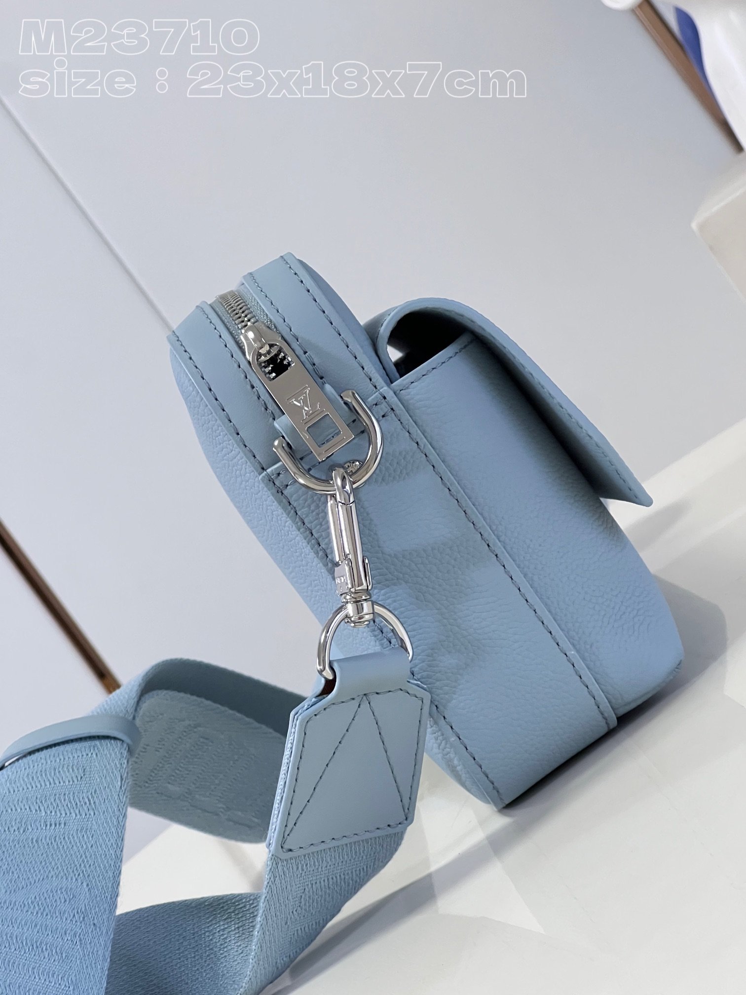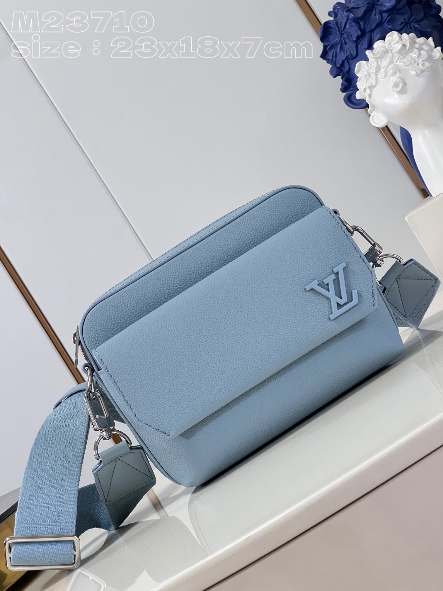 [Exclusive real shot M23710 Glacier Blue] This Fastline messenger bag is made of cow leather and bright metal parts. The metal LV letters and the beveled corners of the flip cover highlight the identity of the LV Aerogram series. The Louis Vuitton logo fabric shoulder strap is removable and adjustable for comfortable carrying. 23.5 x 18 x 7 cm (length x height x width)