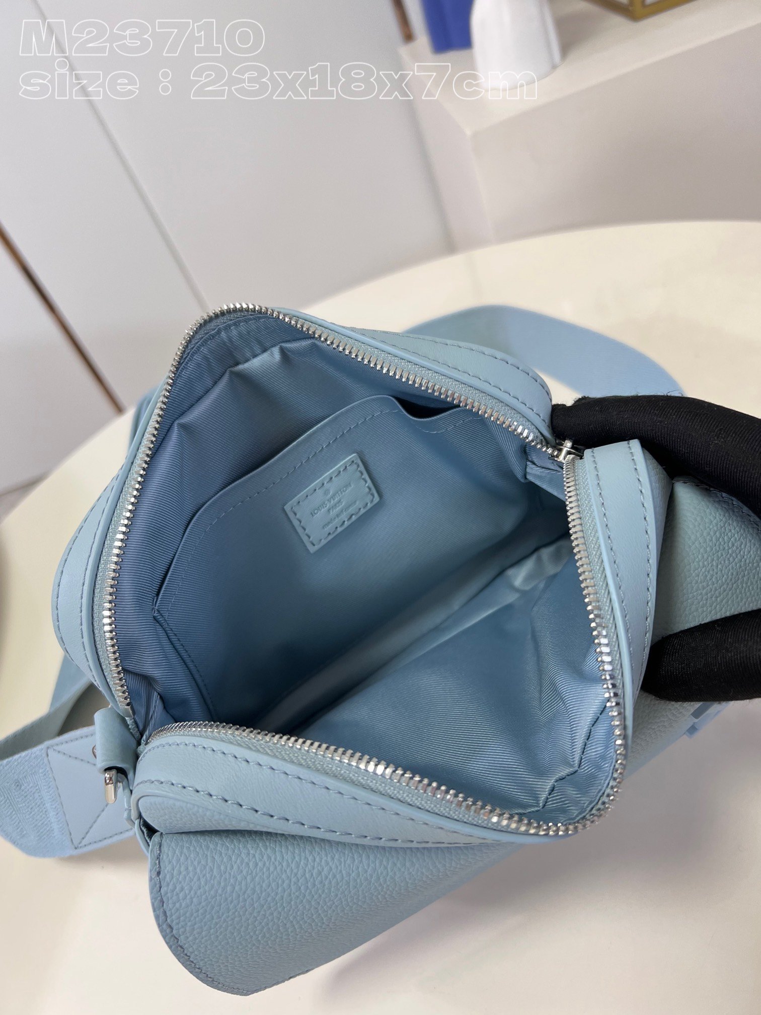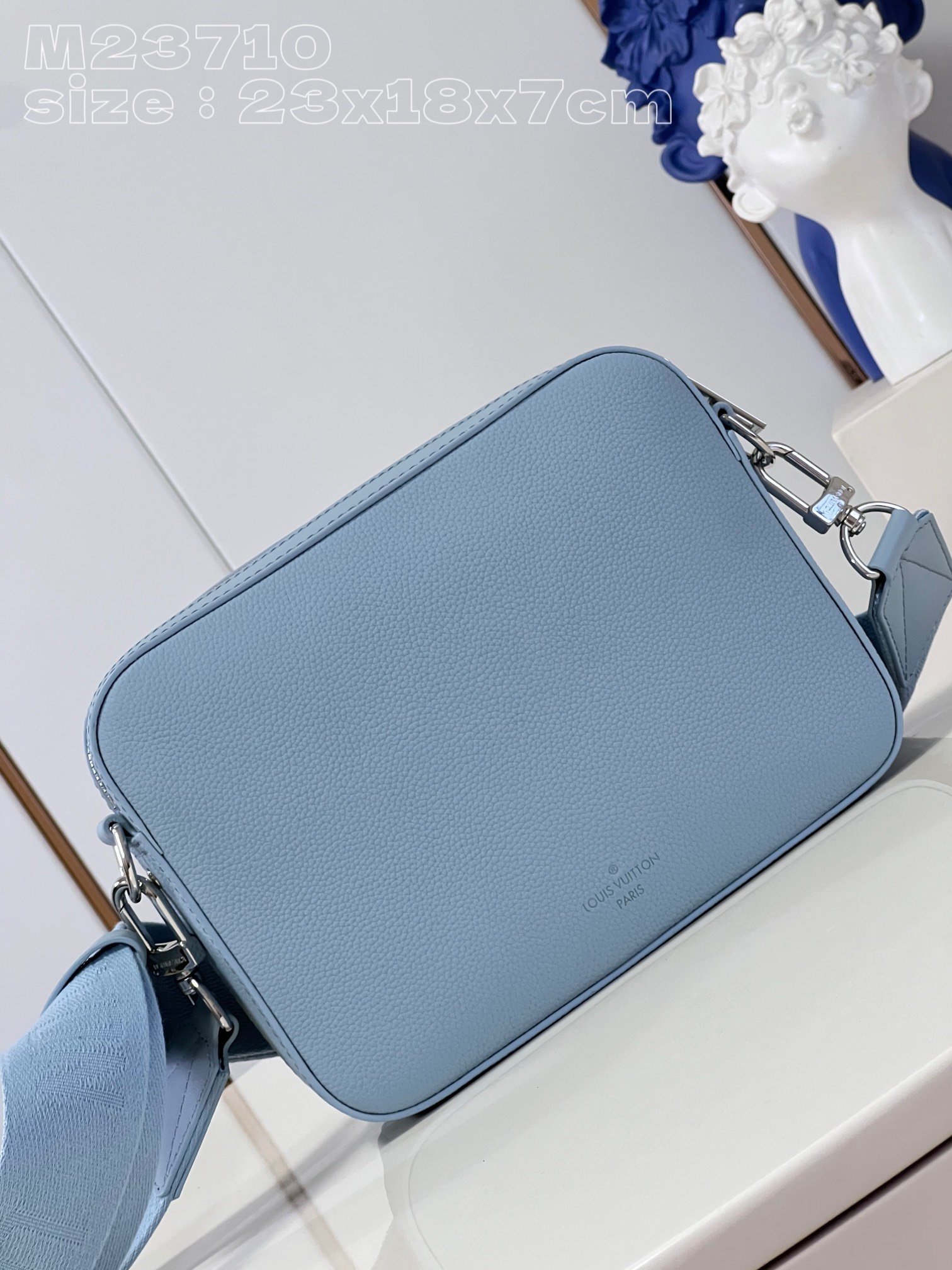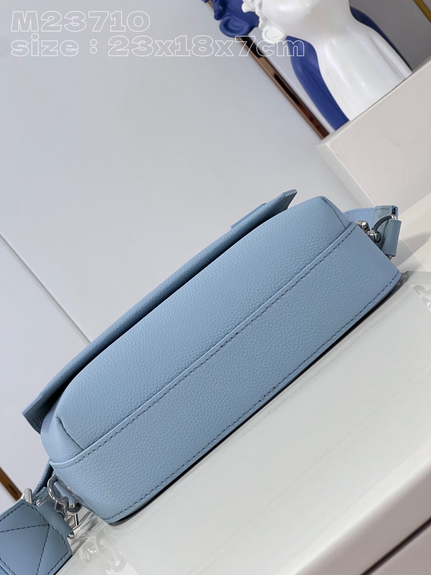 [Exclusive real shot M23710 Glacier Blue] This Fastline messenger bag is made of cow leather and bright metal parts. The metal LV letters and the beveled corners of the flip cover highlight the identity of the LV Aerogram series. The Louis Vuitton logo fabric shoulder strap is removable and adjustable for comfortable carrying. 23.5 x 18 x 7 cm (length x height x width)