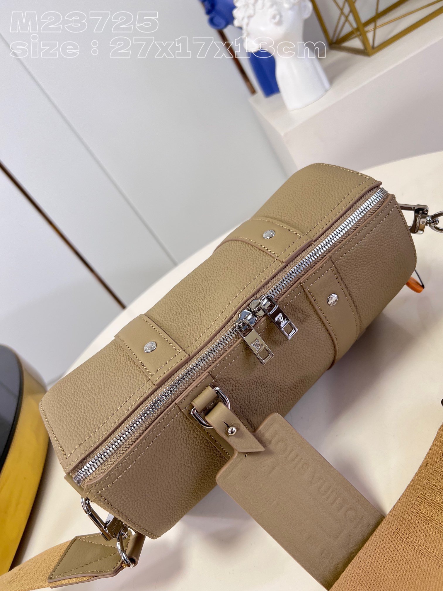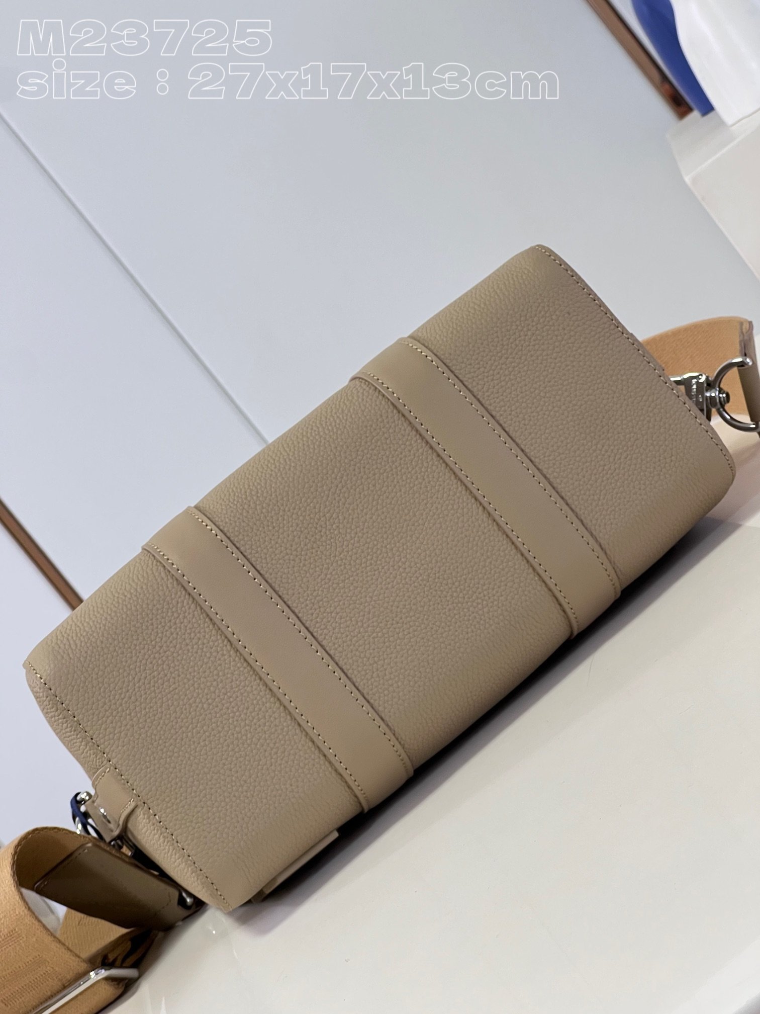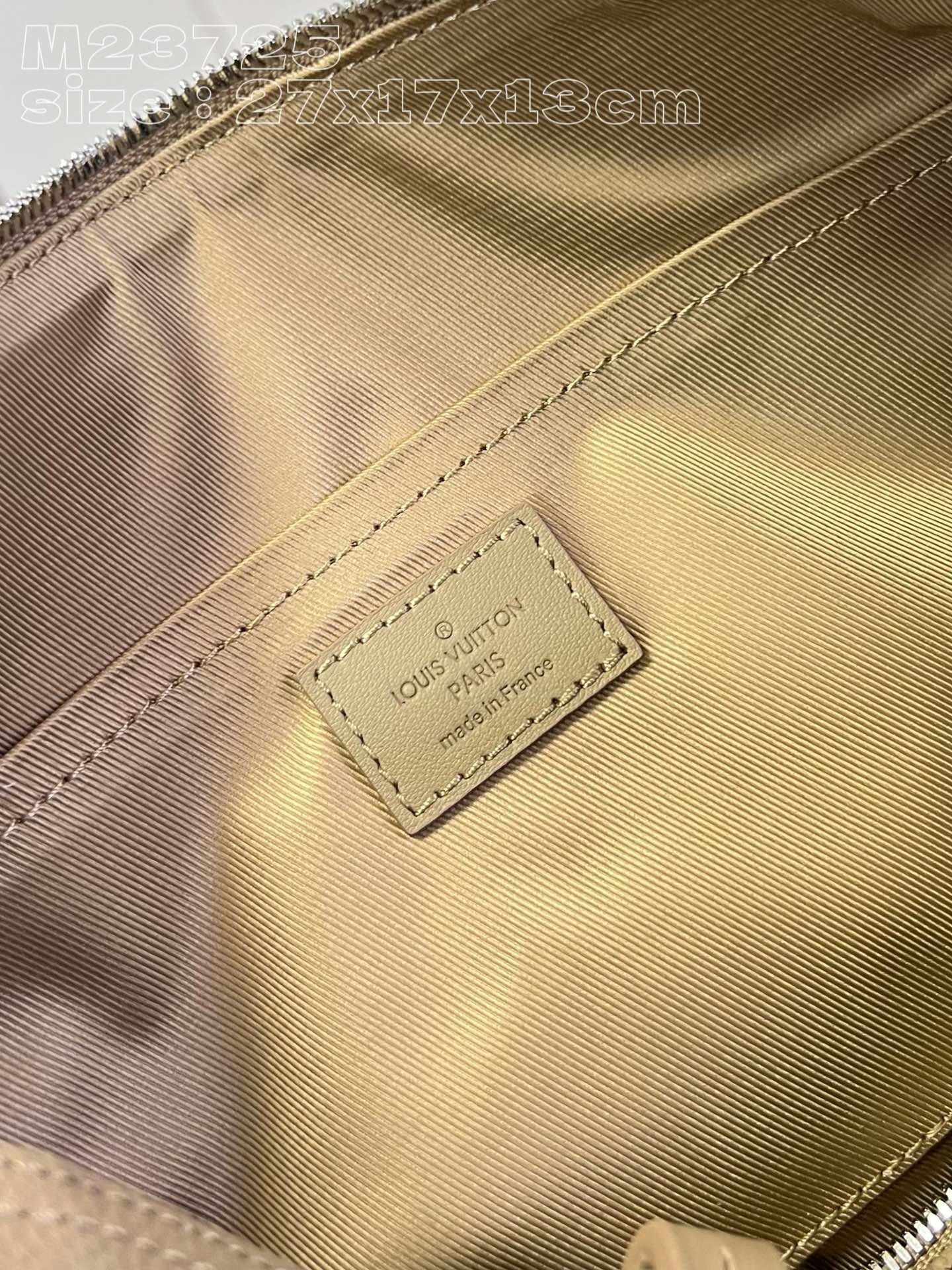 [Exclusive real shot M23725 Apricot] This City Keepall handbag is from the LV Aerogram series. Its exquisite shape is embellished with metal LV letters, and the Louis Vuitton logo is woven into the wide fabric shoulder strap for a comfortable shoulder or cross-body experience. The iconic nameplate of the Aerogram bag collection exudes chic flair. 27 x 17 x 13 cm (length x height x width)