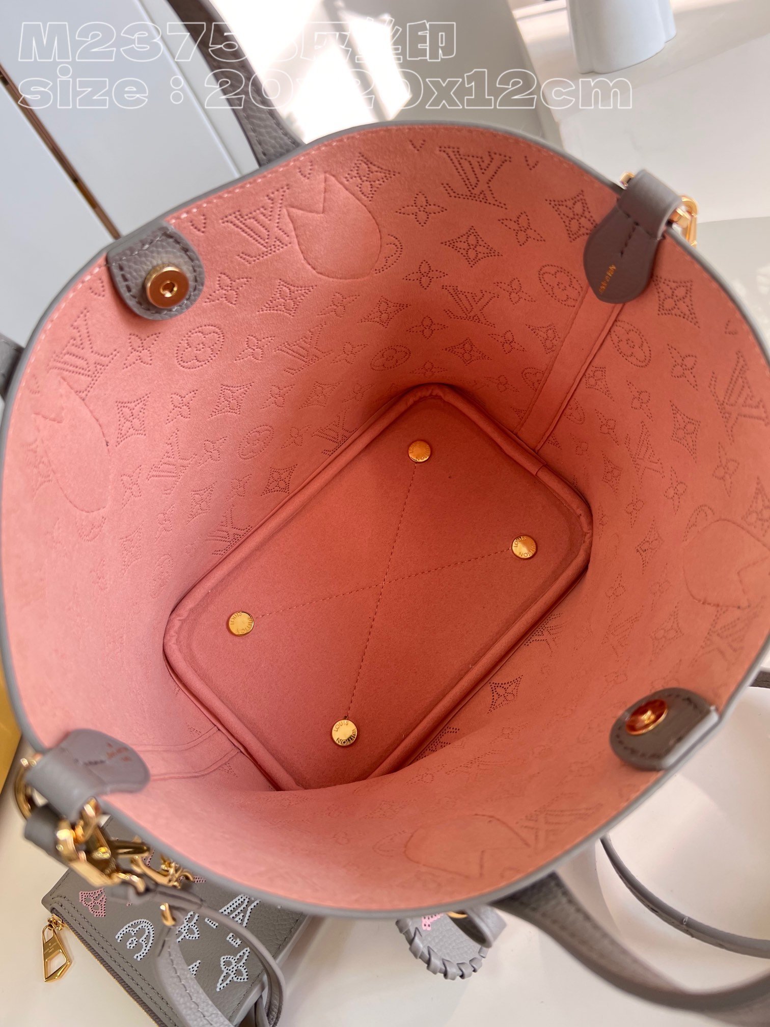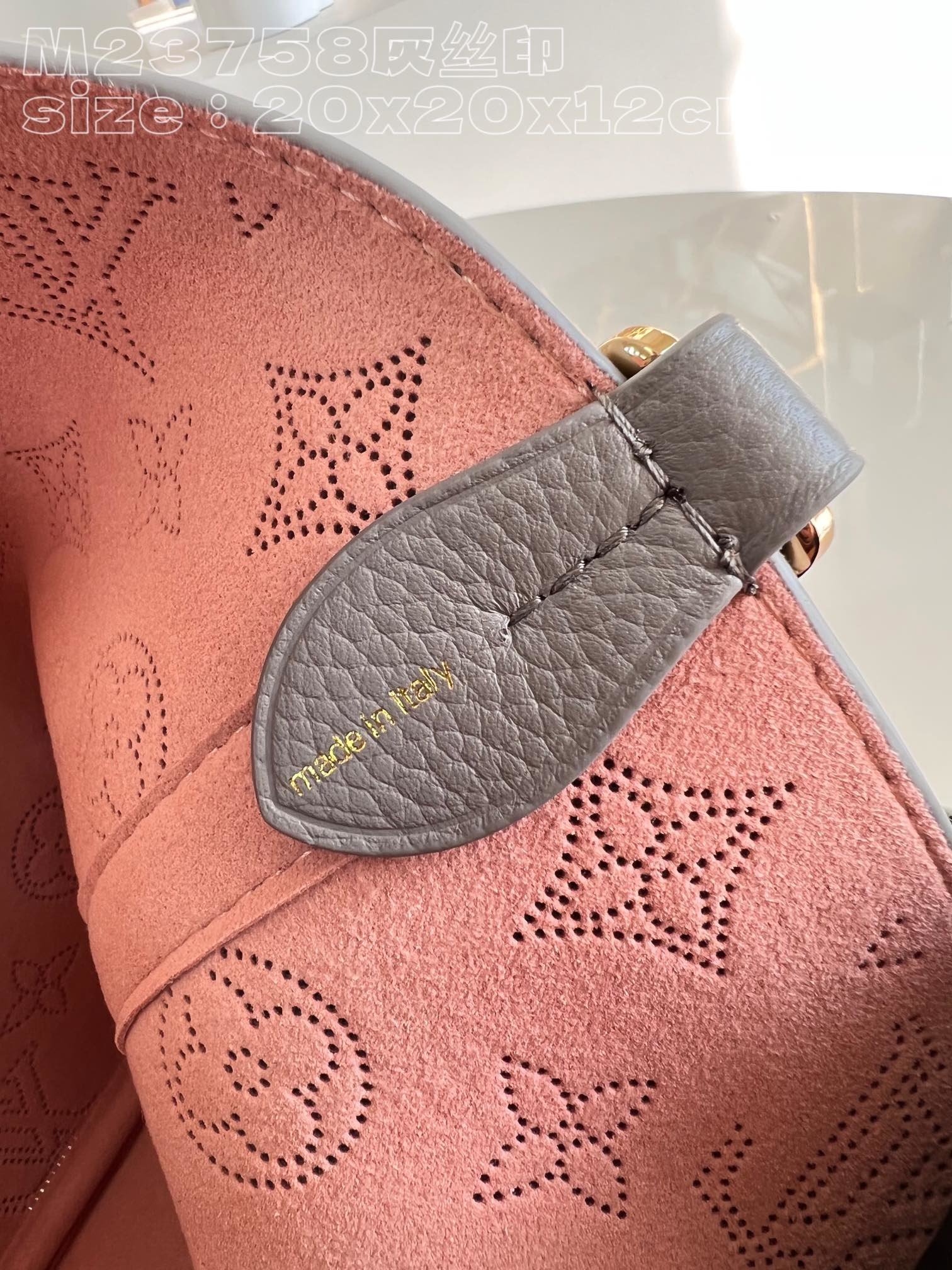 [Exclusive real shot M23758 gray silk screen] This Blossom small tote bag comes from the Mahina Flight Mode series and is made of soft engraved cow leather to create a drape effect. Subtle gradient tones on the Monogram perforated pattern adorn the leather body, paired with woven leather trim for a sophisticated look. Internal compartments and removable zipper pockets store daily essentials. 20 x 20 x 12.5 cm (length x height x width)