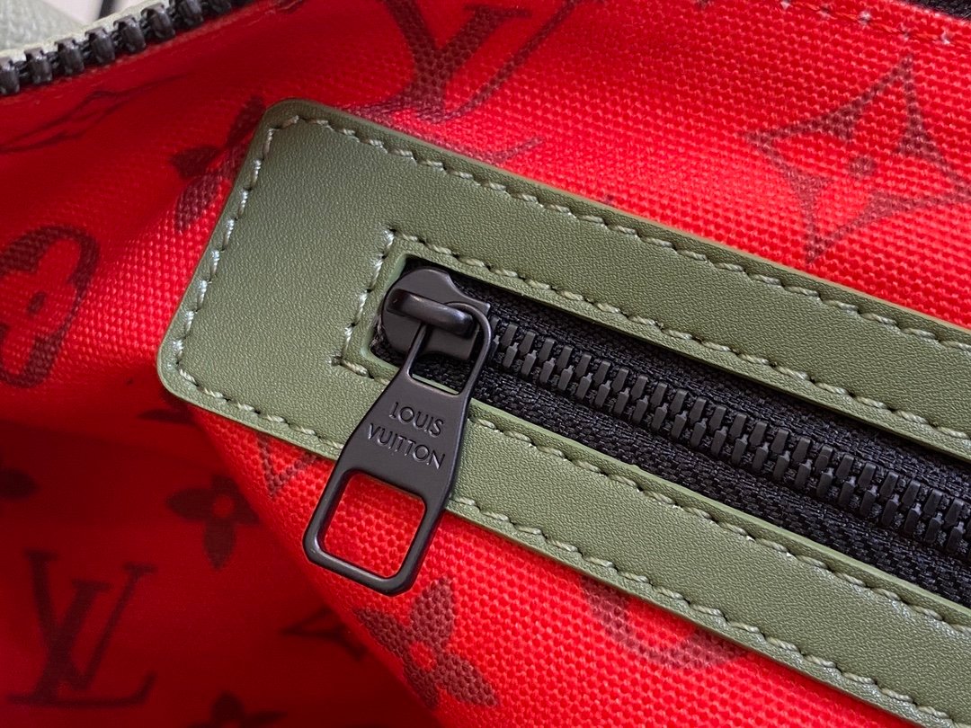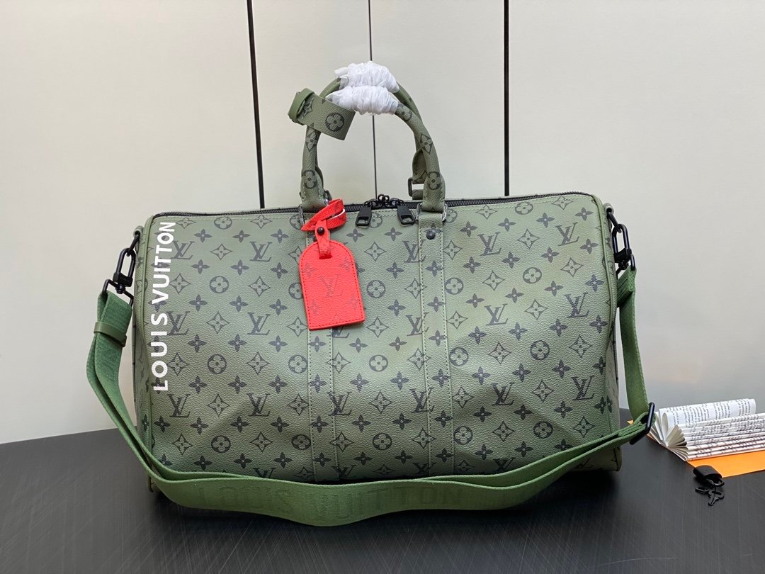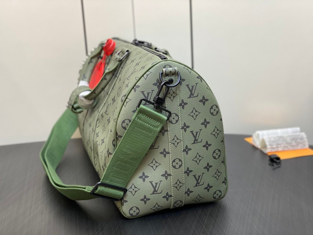 Top original order ✨M23962 green silk screen travel bag series Zly Keepall Bandoulière 45 travel bag from the Monogram Tones series, green flower font silk screen red tag travel bag, with fresh autumn colors and bright Monogram pattern, injecting trendy style into Monogram canvas. The vertical Louis Vuitton logo is marked with the brand’s imprint, and the detachable and adjustable shoulder strap makes it comfortable to carry on the shoulder. Dimensions: 45.0 x 27.0 x 20.0 cm.
