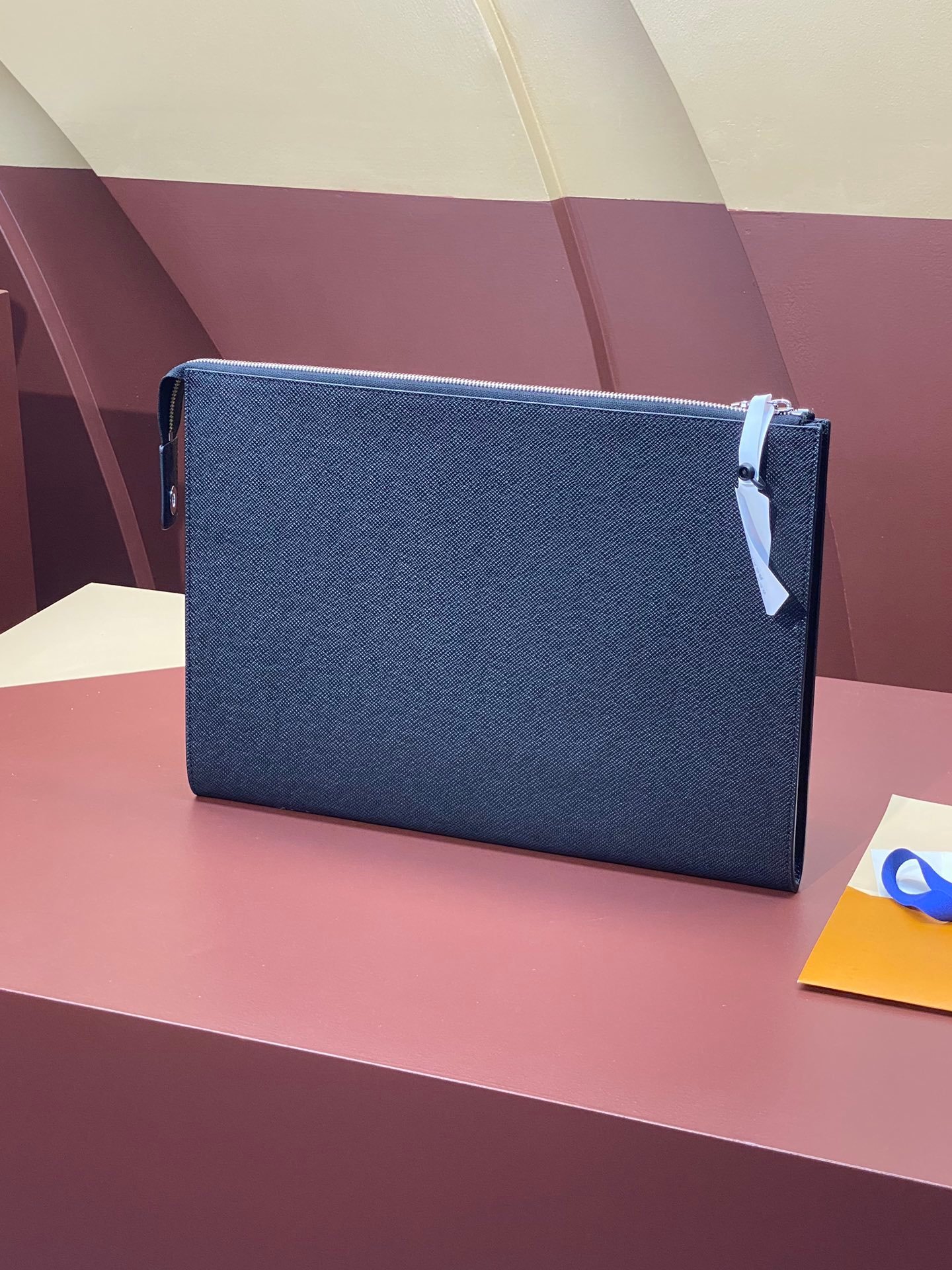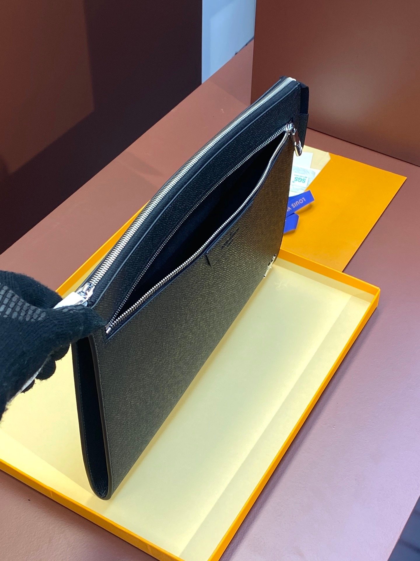 M30965 cross pattern black! This Pochette 24H clutch is made of Taïga cow leather with a slim and round shape. It has a bellows structure and an internal patch pocket. It can hold a 13-inch laptop, notepad and other small items, providing a portable alternative to the classic briefcase. size:36x25x2.5cm