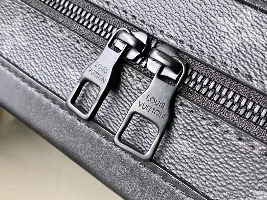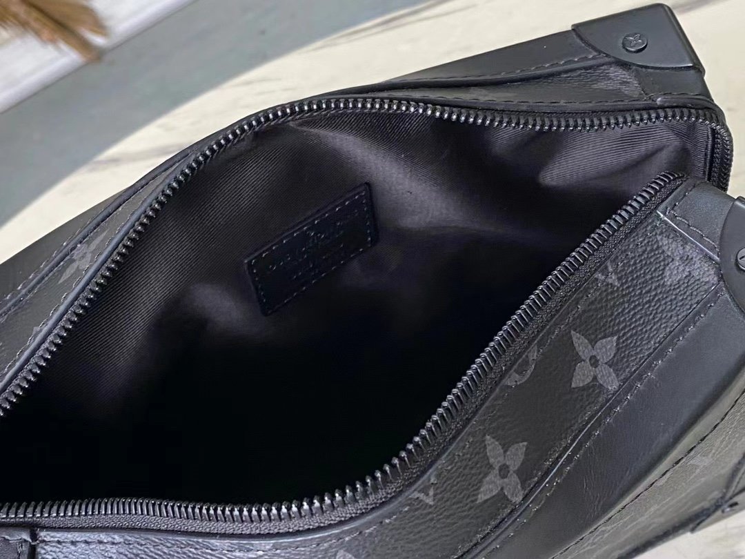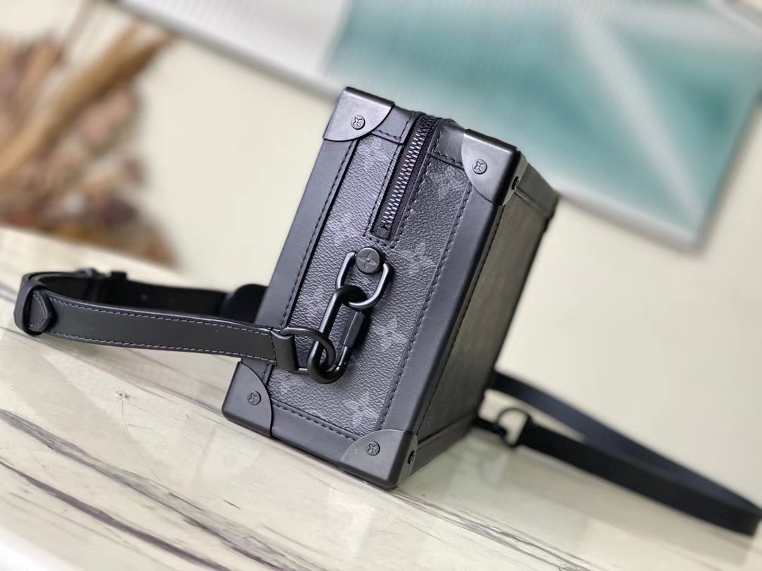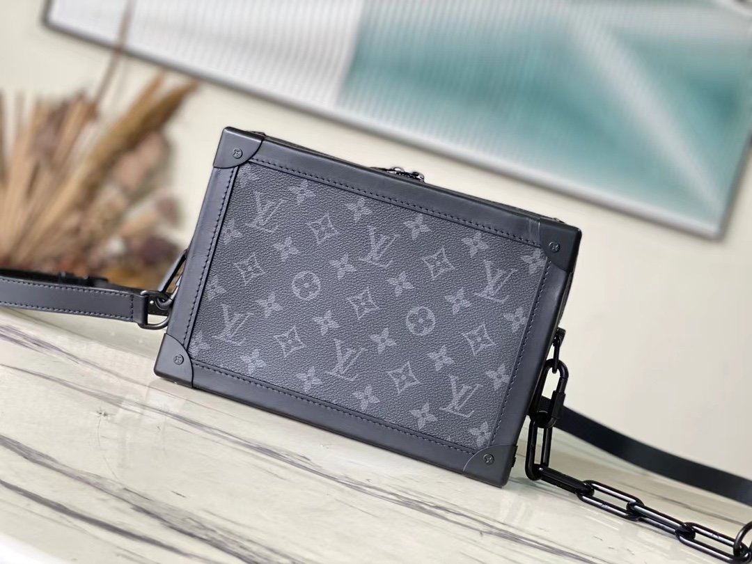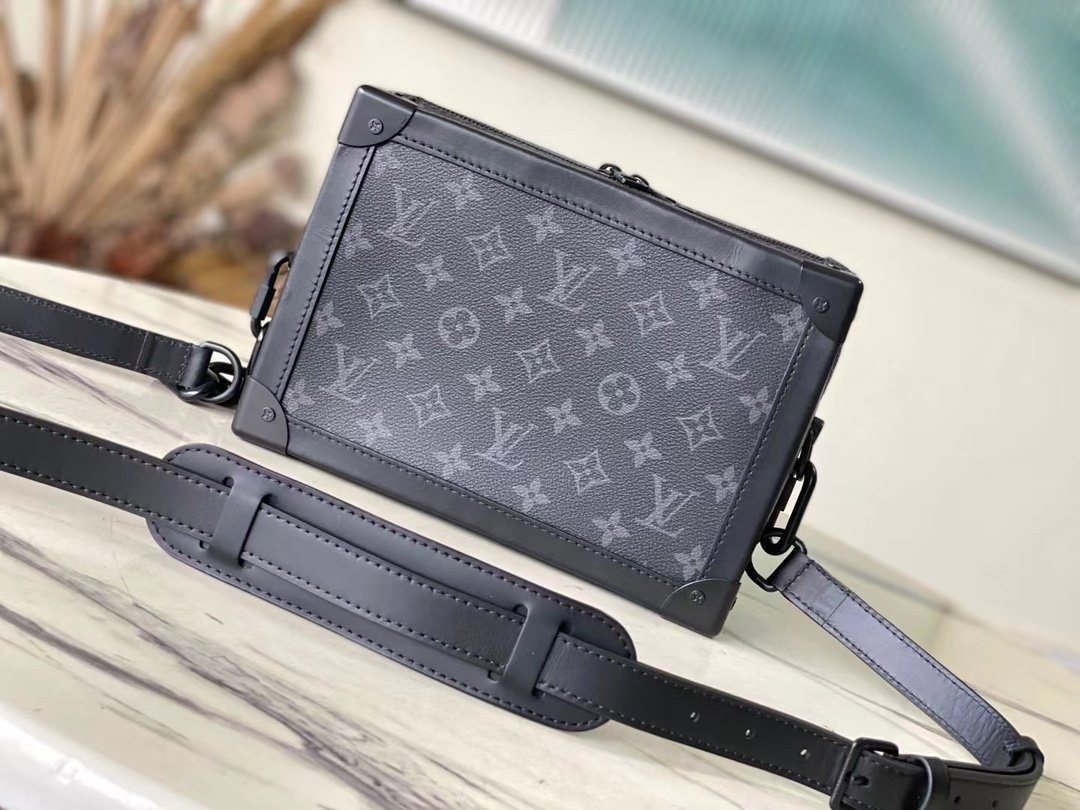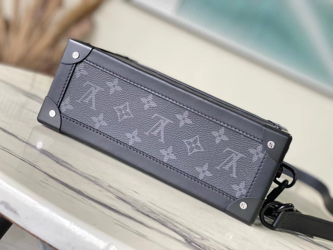 The top original M44730 Soft Trunk handbag is made of Monogram Eclipse canvas and matte black metal parts, with an adjustable black leather shoulder strap to achieve a soft messenger bag shape. The reinforced corners slowly convey the charm of the brand’s classic hard case, the wide-mouth design makes it easy to access items, and the soft texture brings a portable carrying experience. Dimensions: 25.0 x 18.0 x 10.0 cm