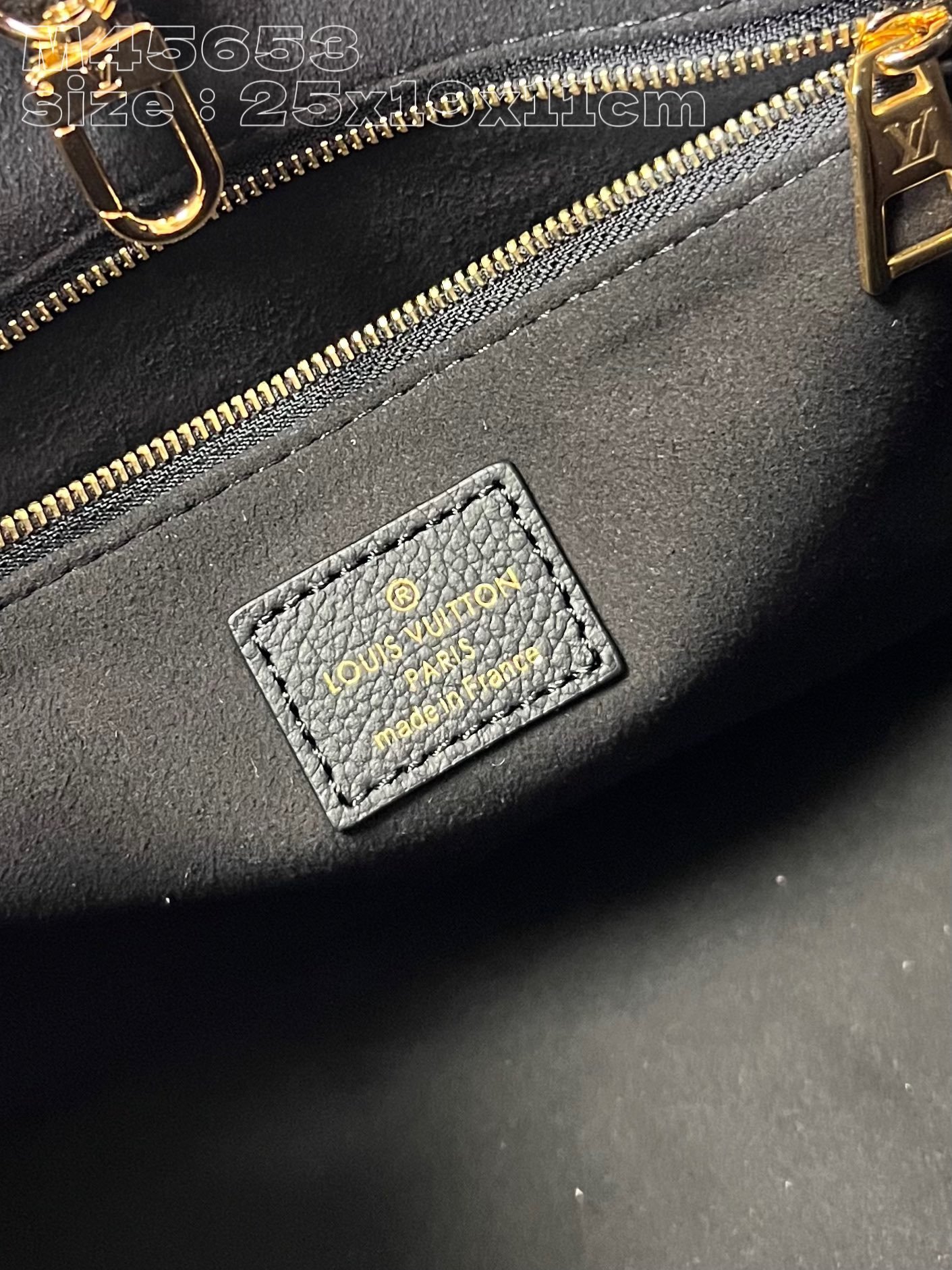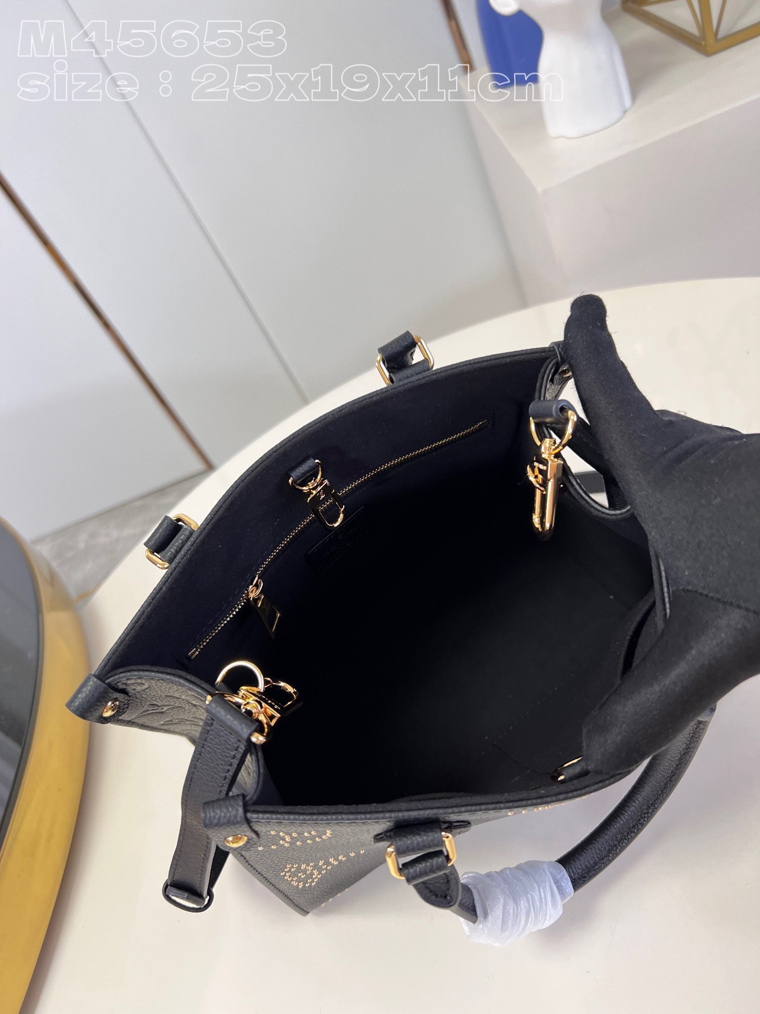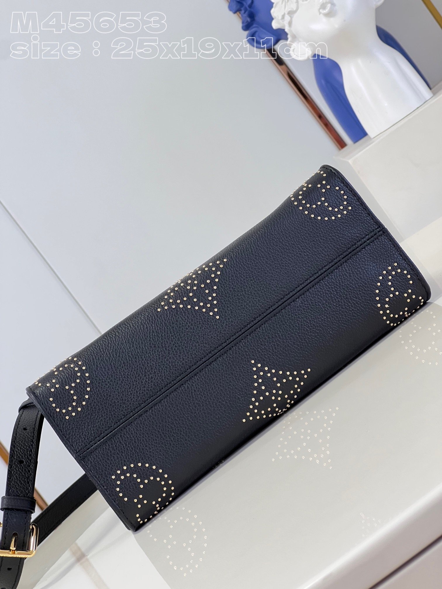[Exclusive real shot of M45653 black studded] M46733 This OnTheGo small tote bag is made of grained cow leather decorated with a Giant Monogram pattern composed of studs, which contrasts with the rivets at the corners. Use the top handle and detachable and adjustable shoulder strap to switch between shoulder and cross-body wear. 25 x 19 x 11.5 cm (length x height x width)