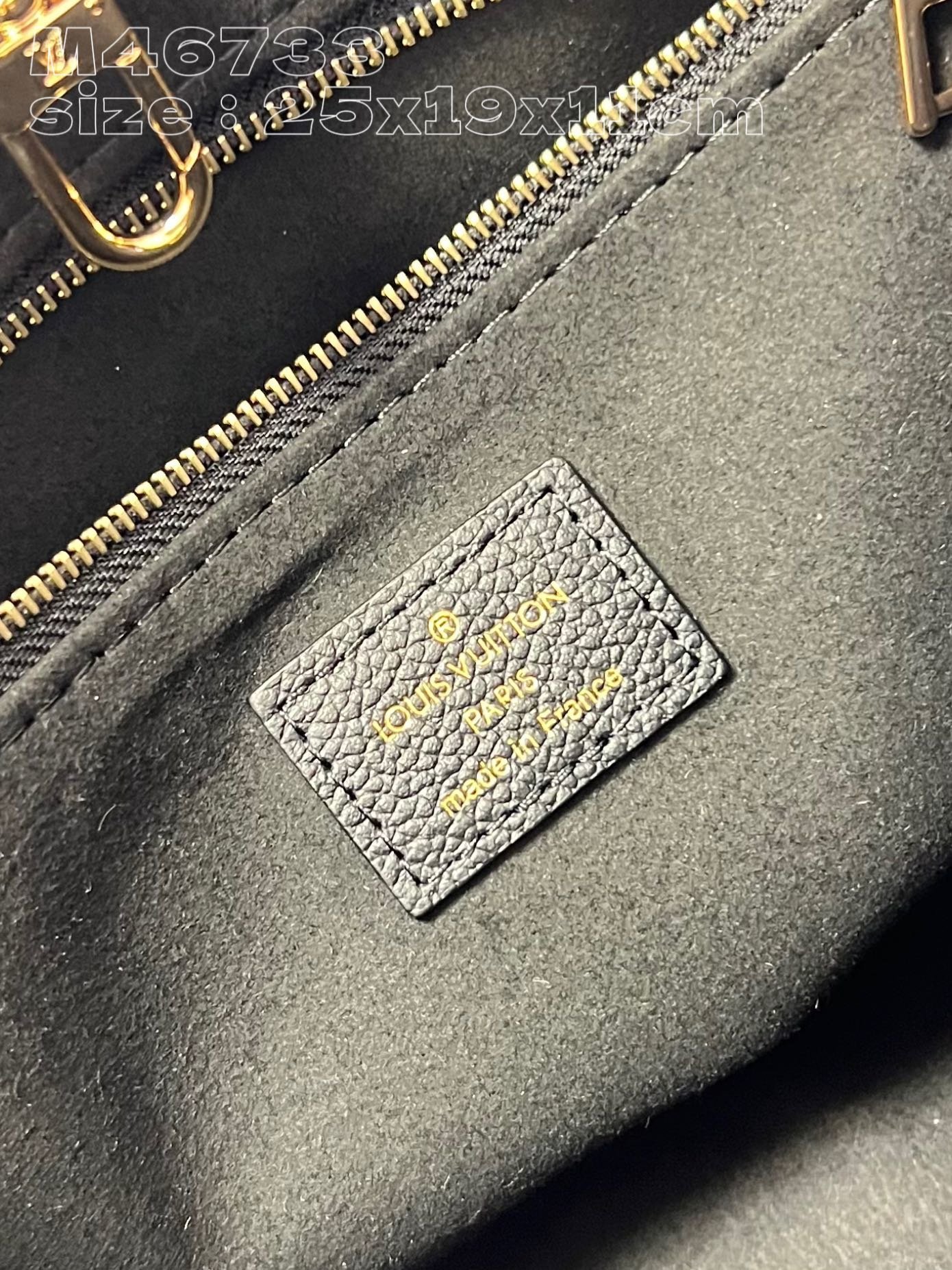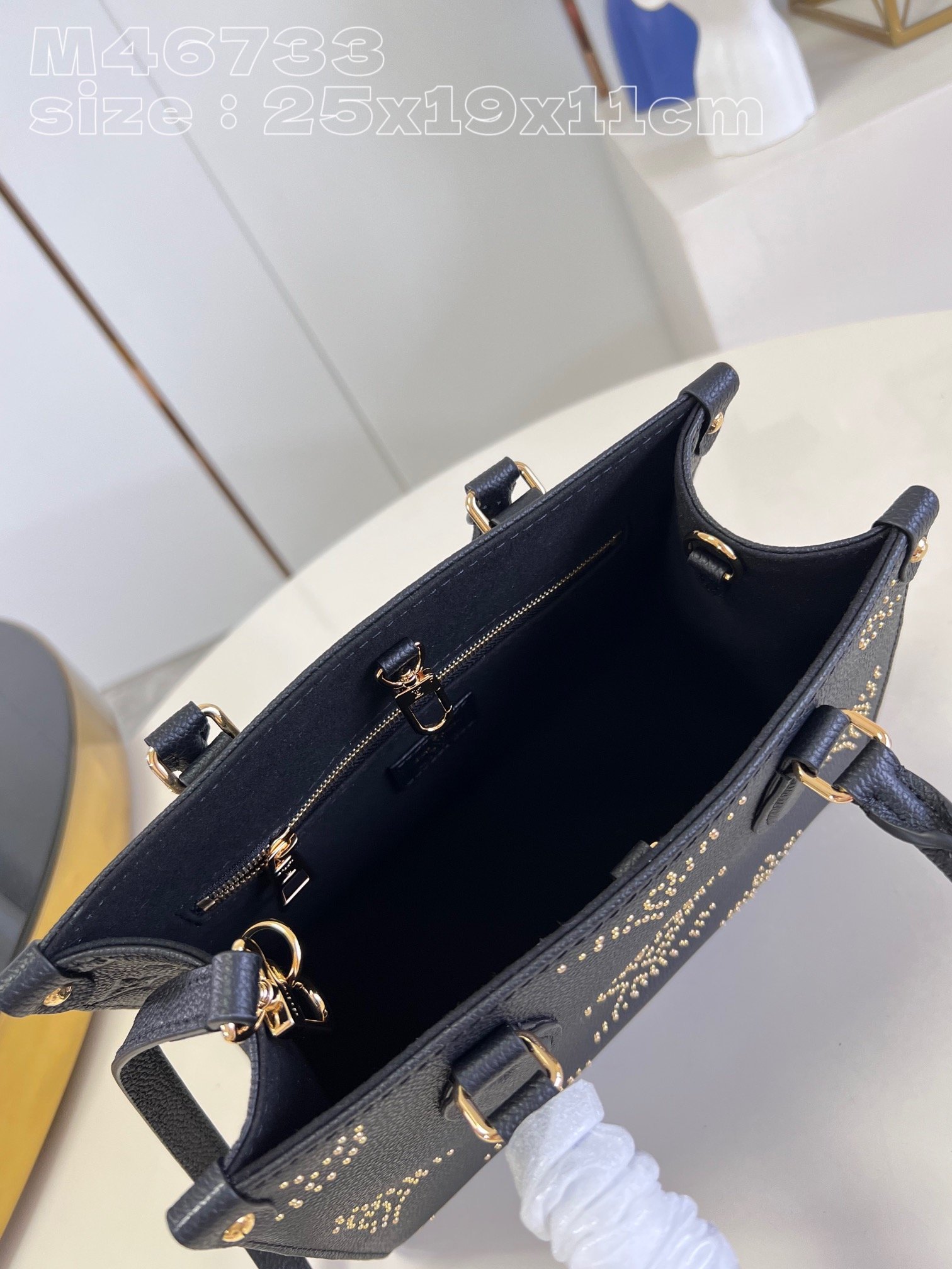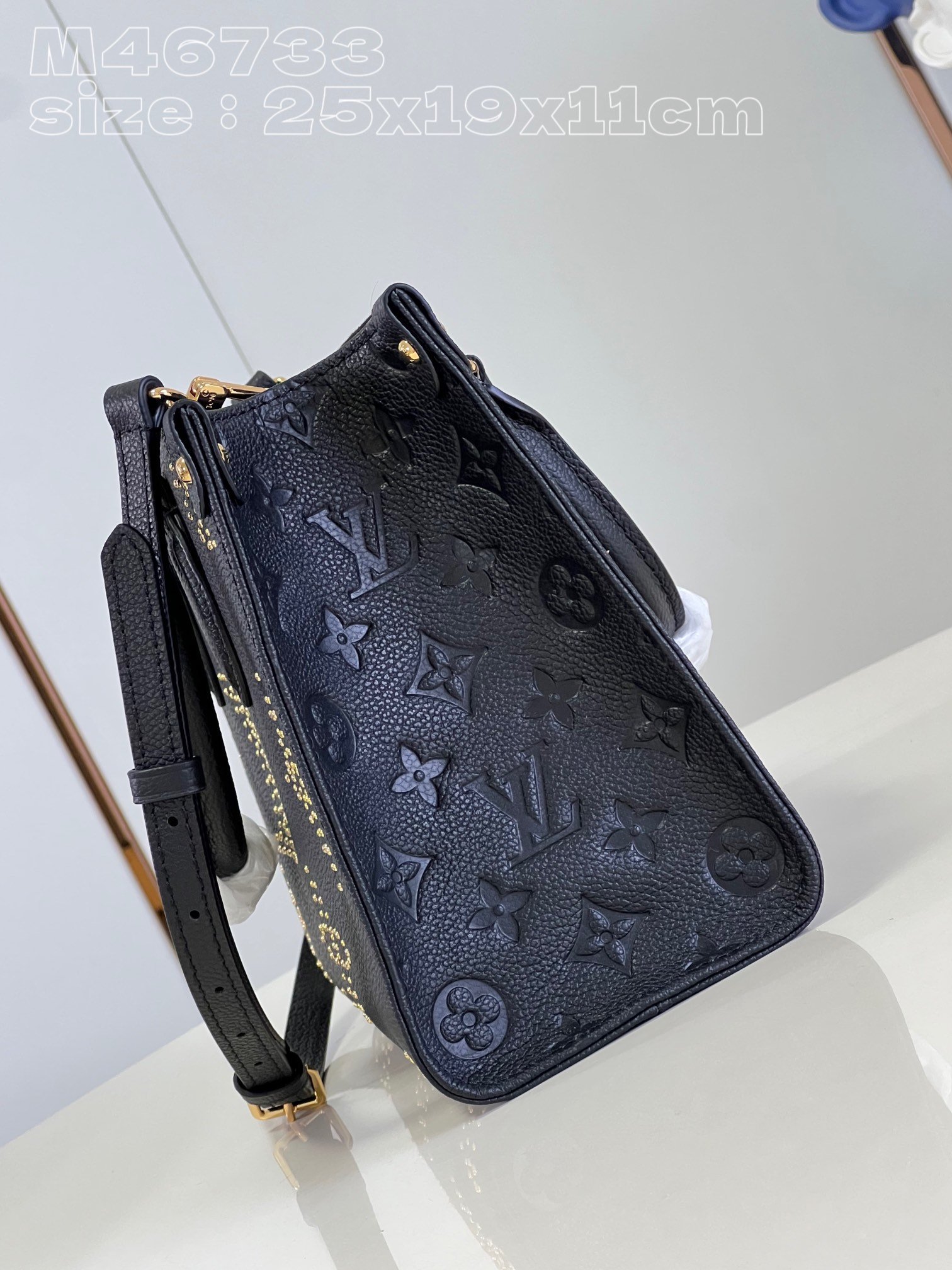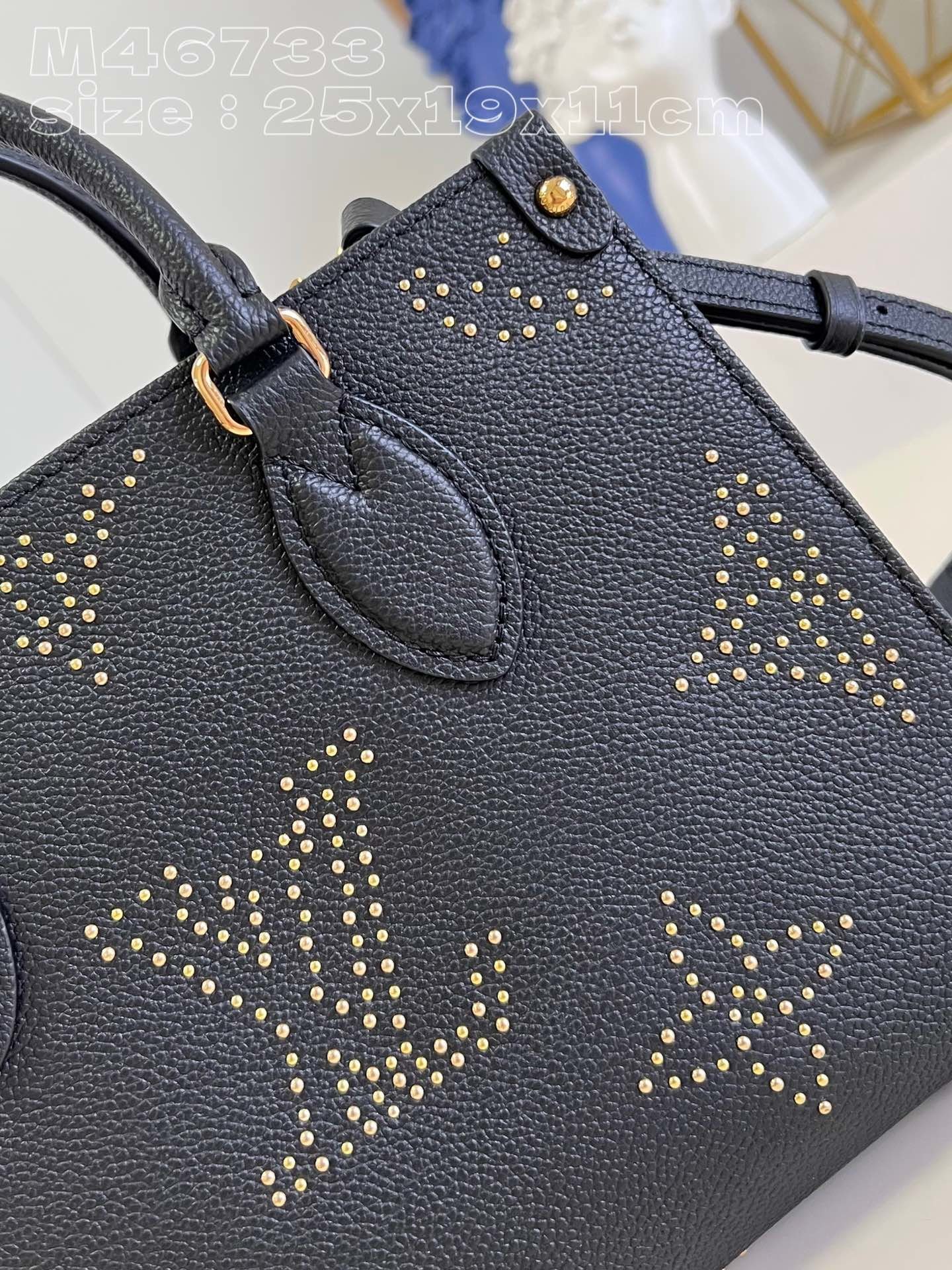 [Exclusive real shot M46733 black studded] This OnTheGo small tote bag is made of grained cow leather and decorated with a Giant Monogram pattern composed of studs, which contrasts with the rivets at the corners of the bag. Use the top handle and detachable and adjustable shoulder strap to switch between shoulder and cross-body wear. 25 x 19 x 11.5 cm (length x height x width)