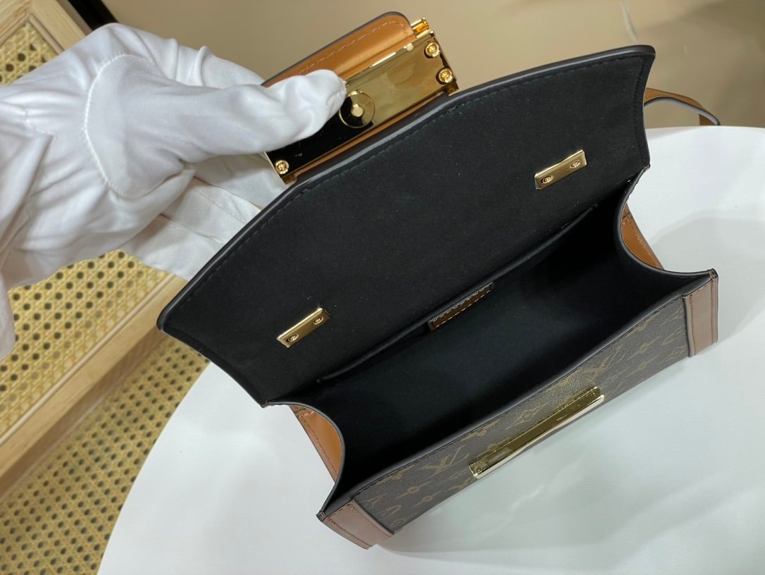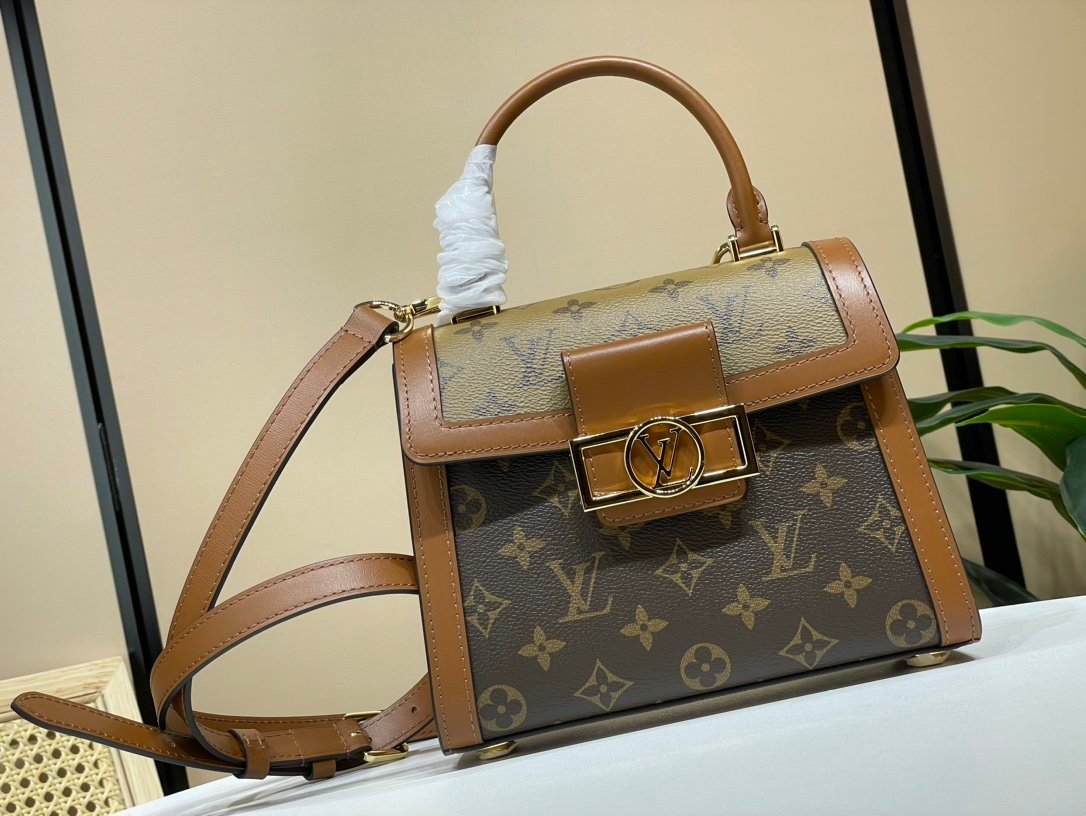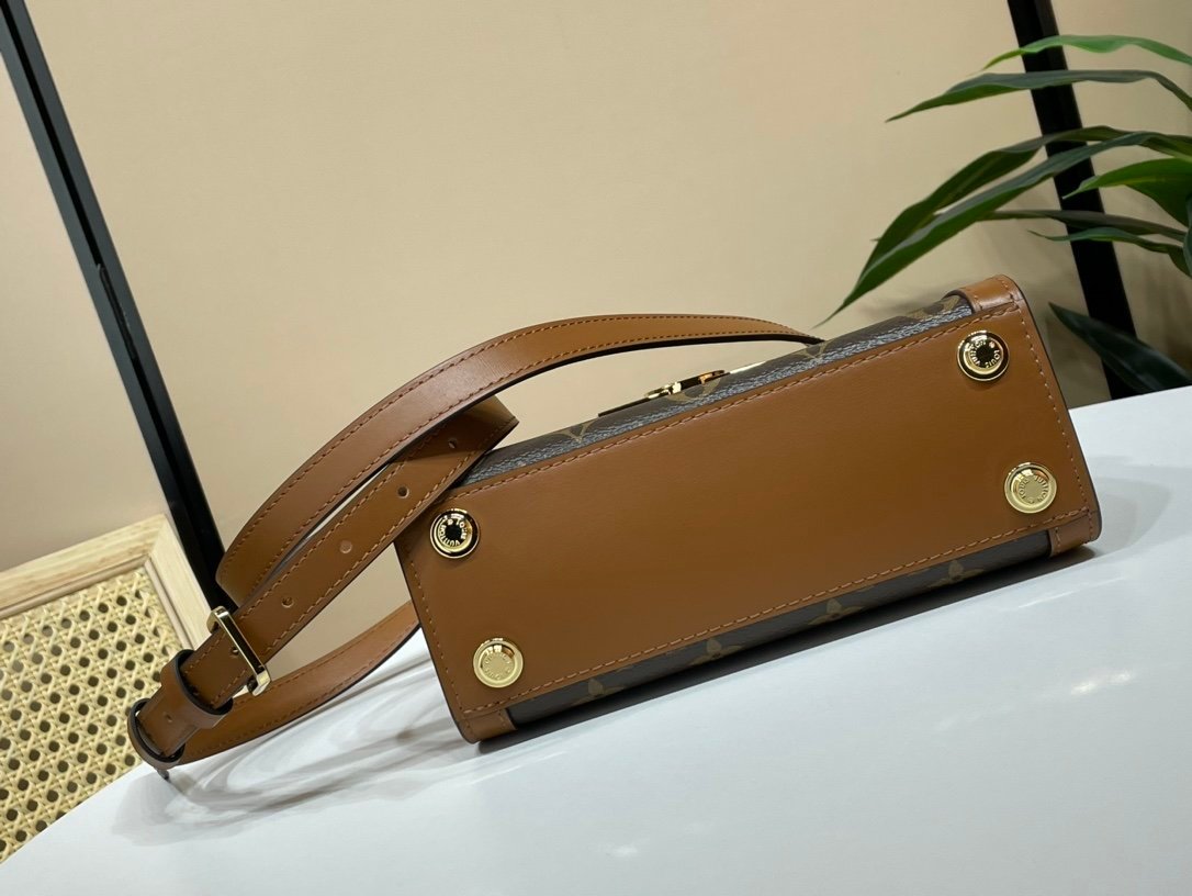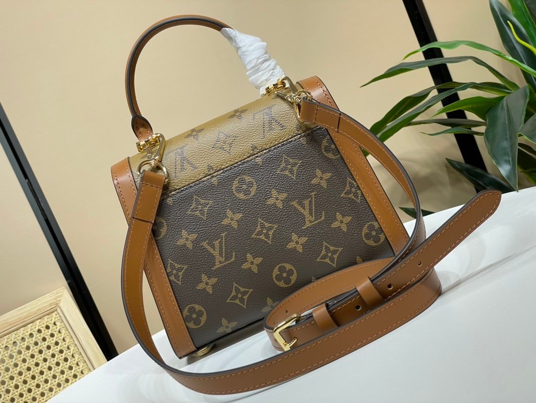 A fusion of Monogram and Monogram Reverse coated canvas with cowhide leather trim. The trapezoidal design exudes a retro feel, and the extended LV magnetic buckle is a unique detail.