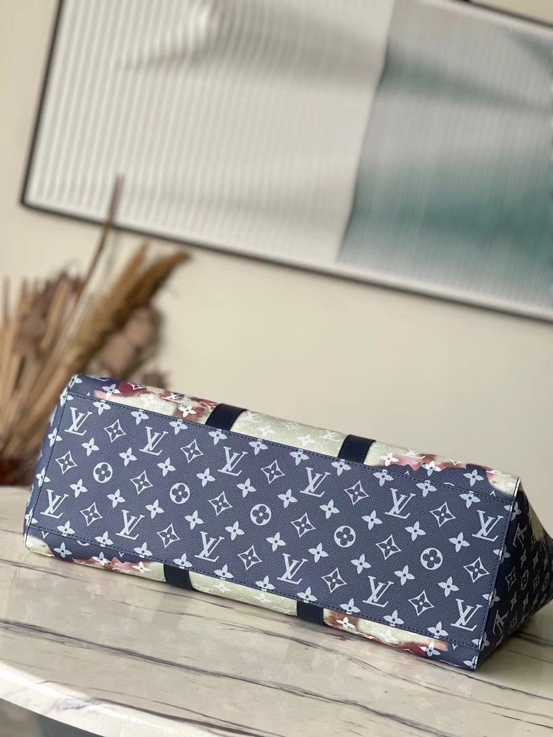 The top original M46812 blue handbag is hand-painted and slightly faded, and then embossed with the Monogram pattern. Generous capacity combined with flat handles and adjustable shoulder straps. Detailed features 43 x 34 x 17.5 cm (length x height x width)