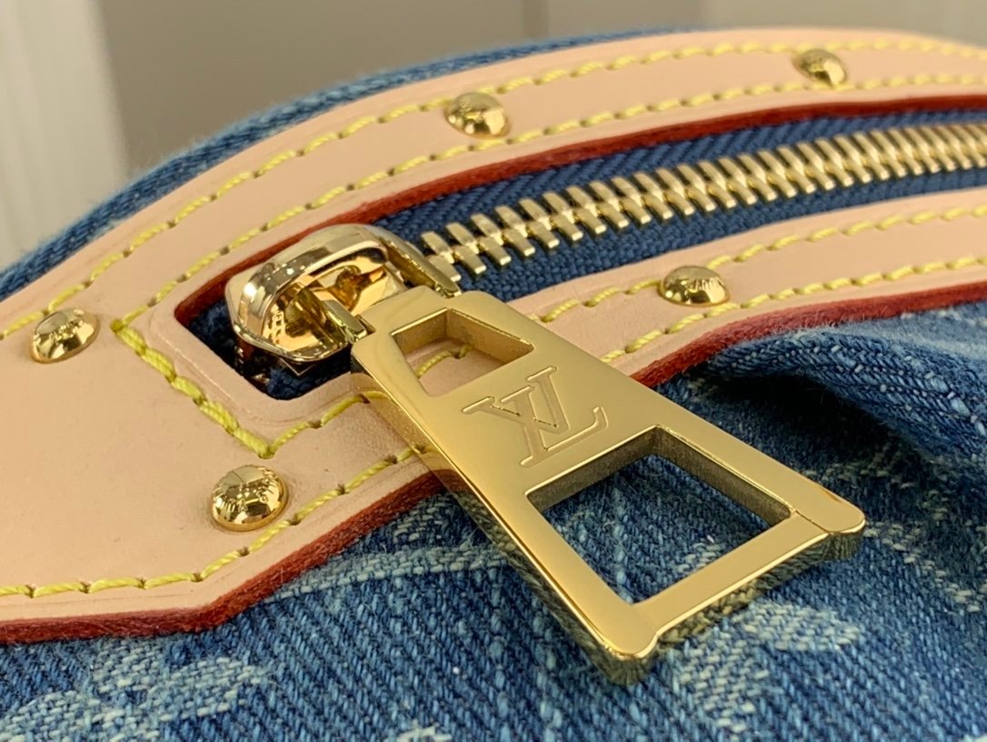 The definition of casual chic, the High Rise belt bag is crafted from Monogram denim canvas with details including a removable name tag and crafted from the brand’s signature natural cowhide leather. The removable textile strap brings a sporty feel. Soft canvas feels soft against the body, while the ultra-thin design allows for undercoat wear