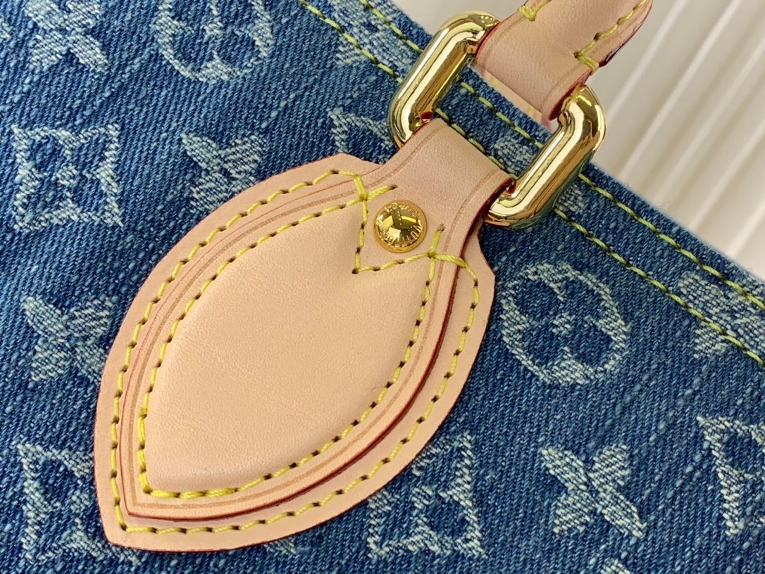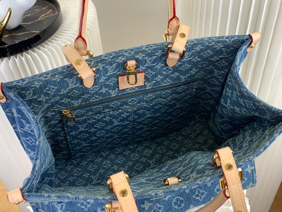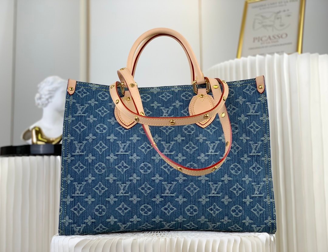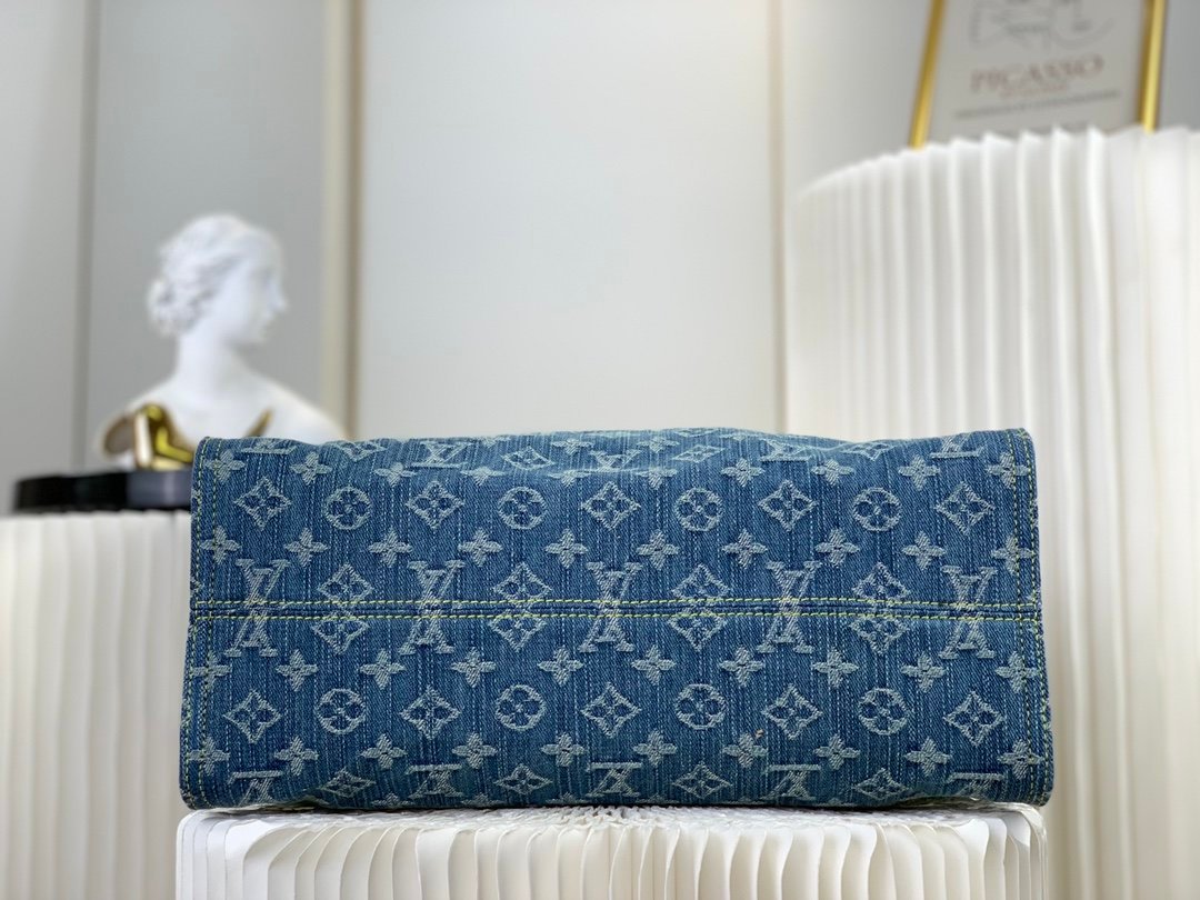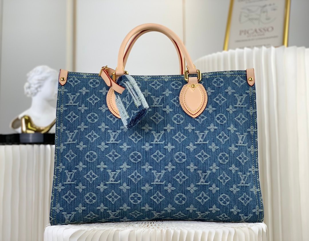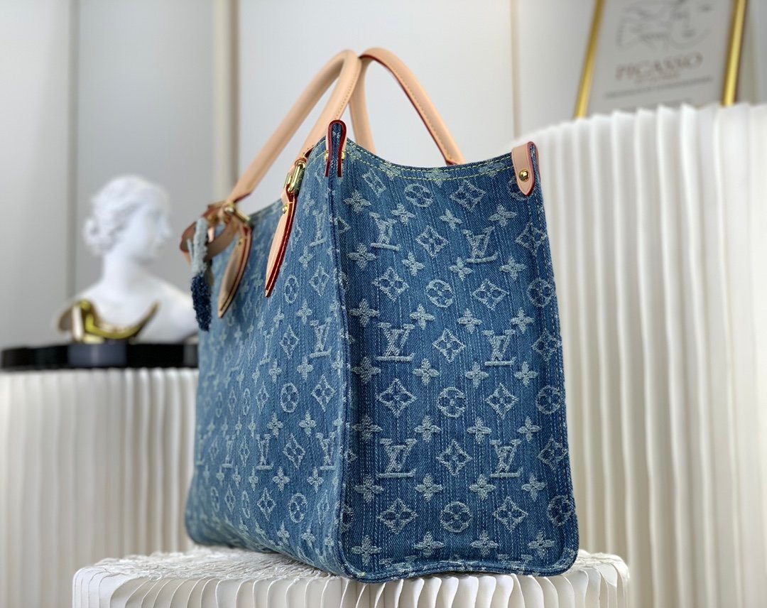 The medium Onthego bag is updated in sandwashed Monogram jacquard denim with leather trim and contrast stitching. Generous capacity meets business or leisure needs, exquisite handles and long shoulder straps unlock multiple carrying methods