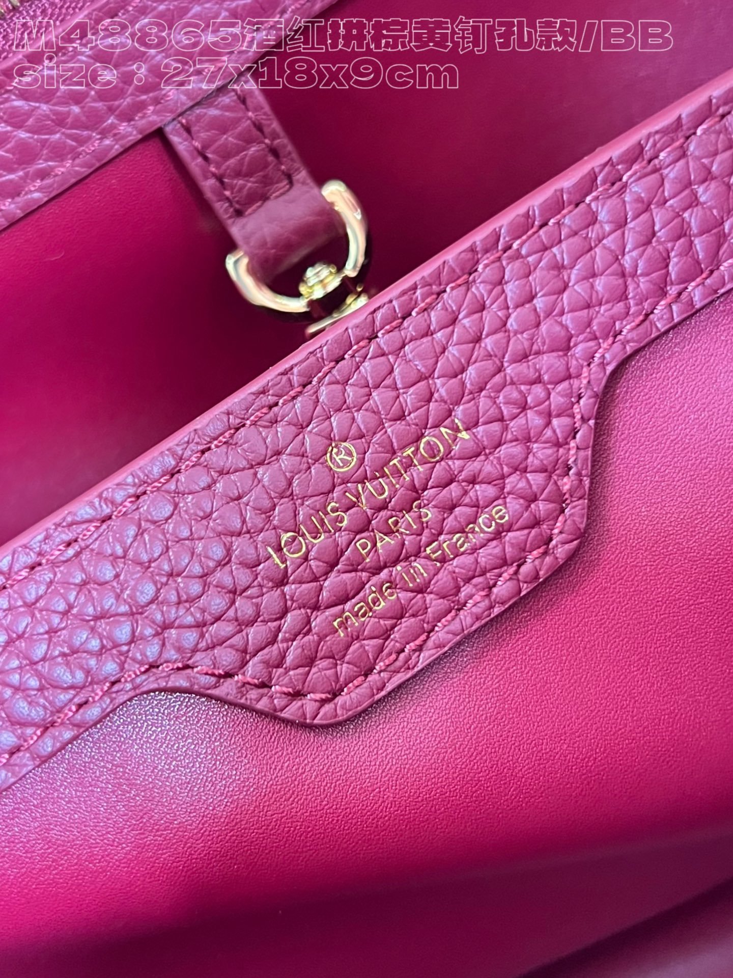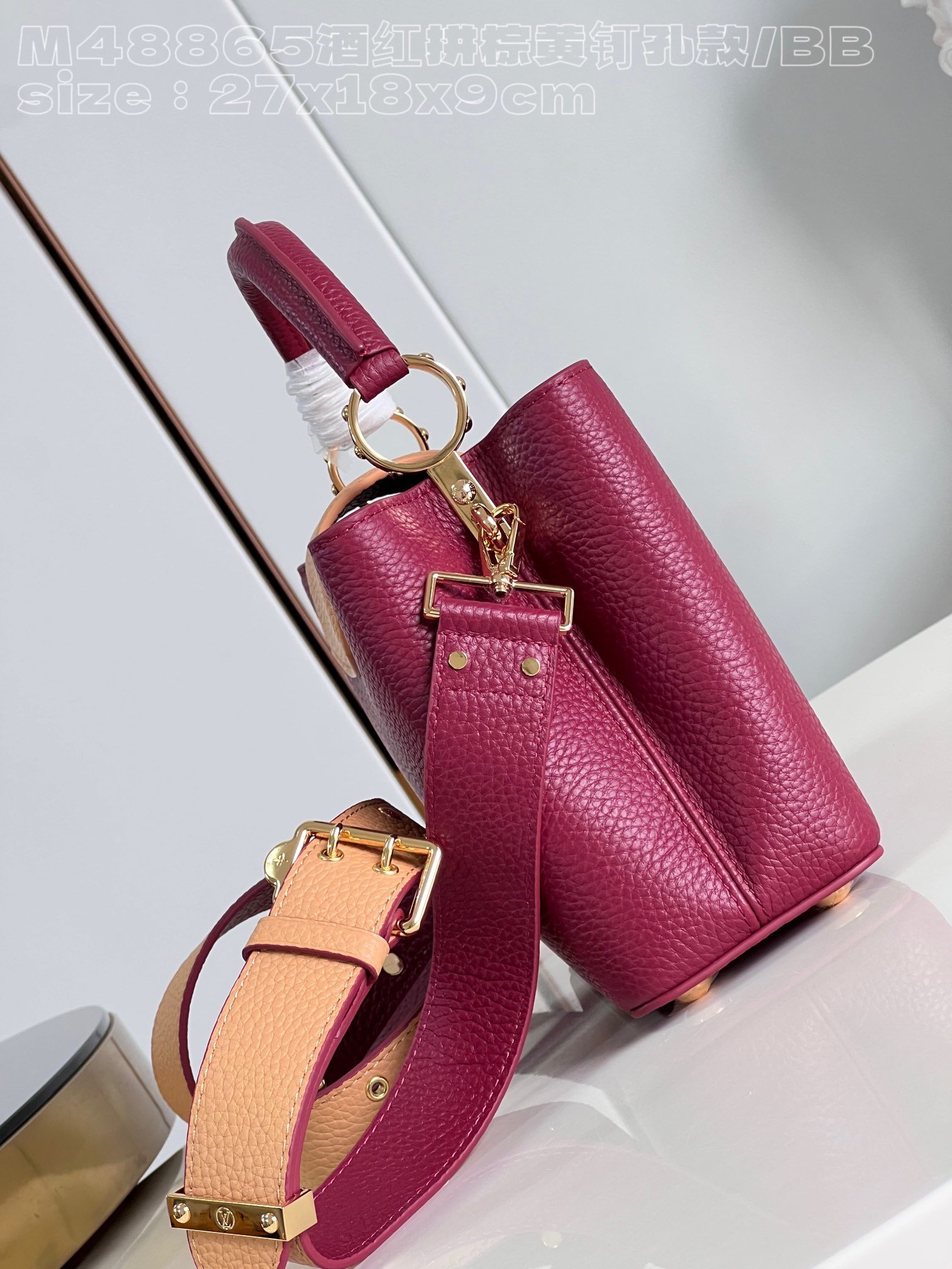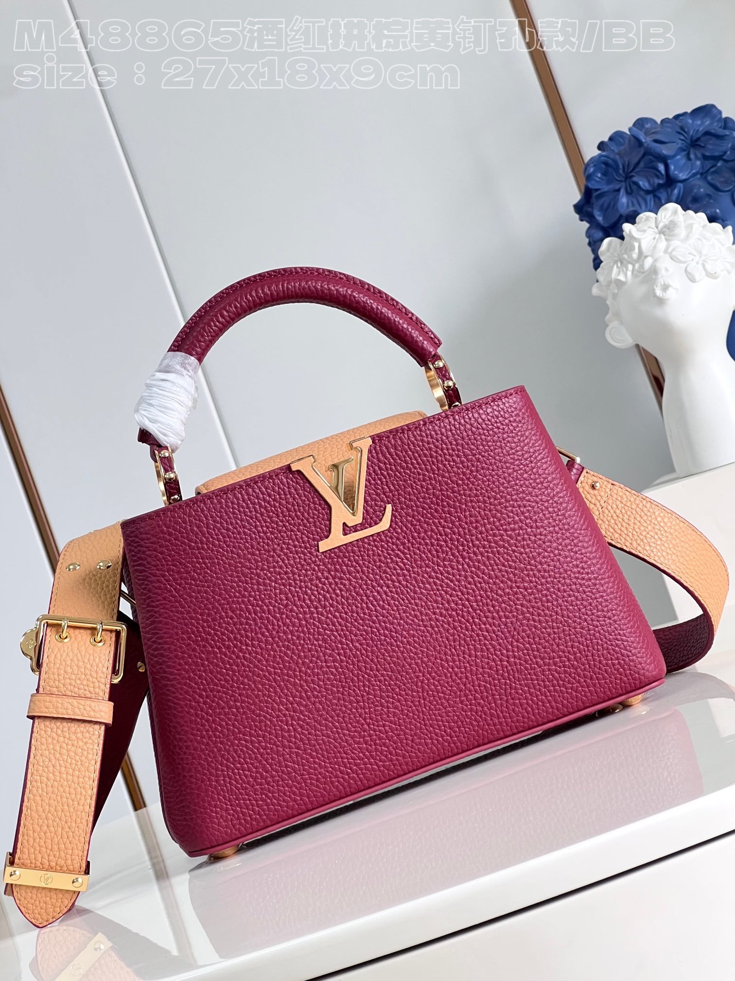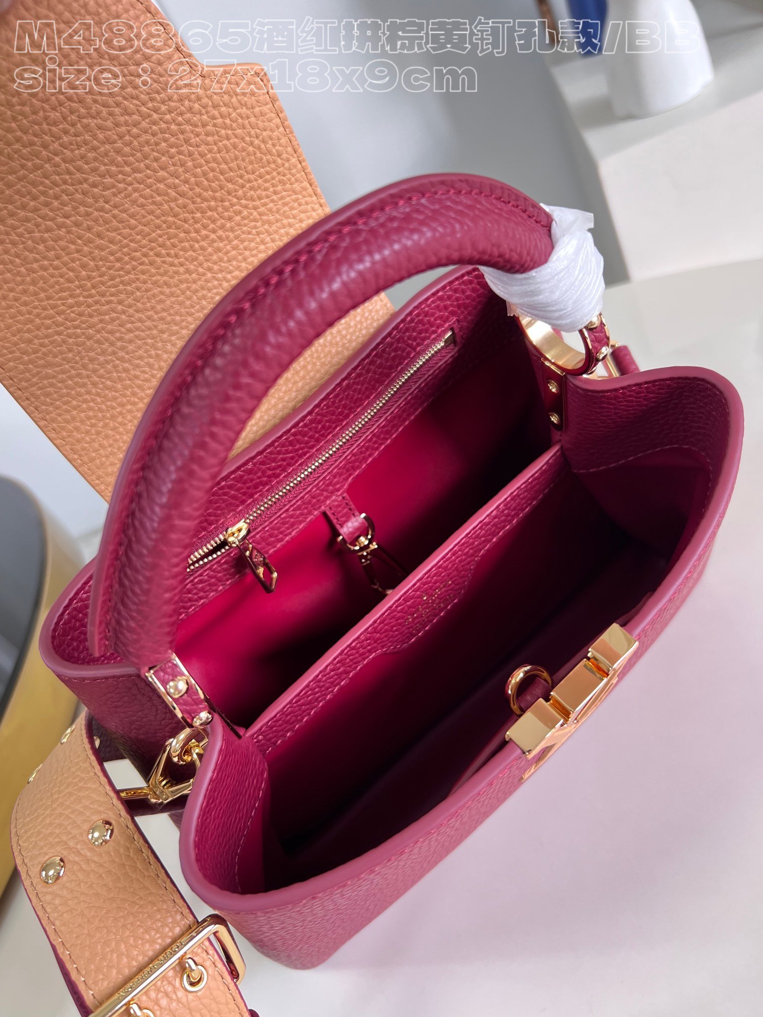 [Exclusive real shot of M48865 burgundy with brown and yellow nail hole small size] Capucines BB handbag is made of calfskin imported from France, with shiny metal accessories. The unique Capucines cover can be stored in the bag to display the letter logo, and can be turned out for presentation. Monogram Flower pattern size: 27x18x9cm
