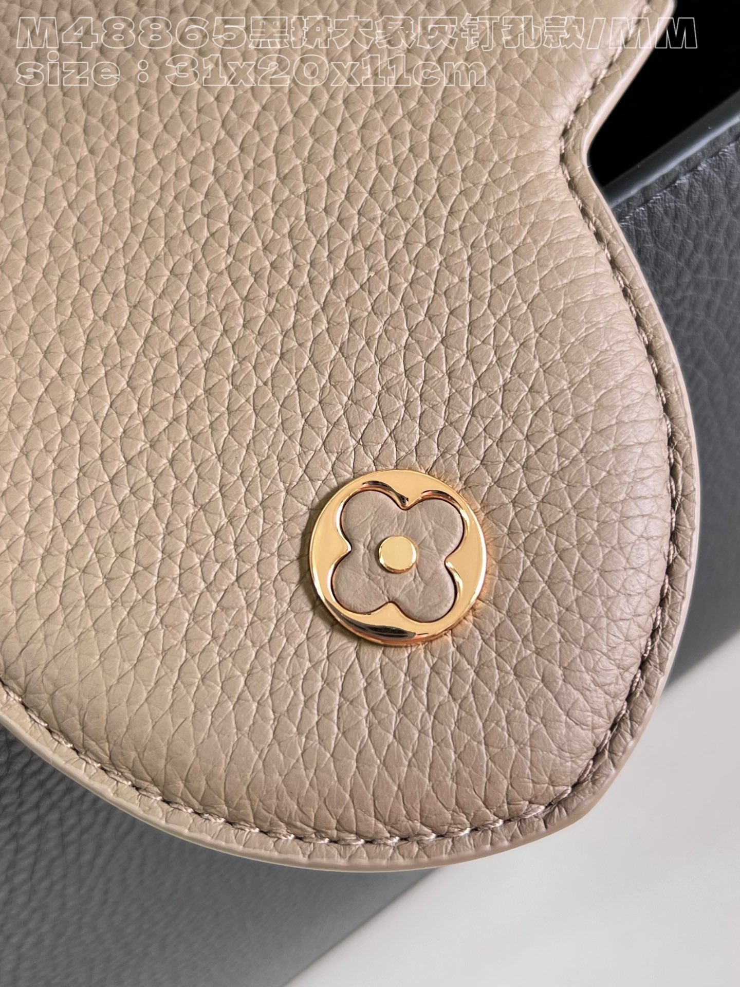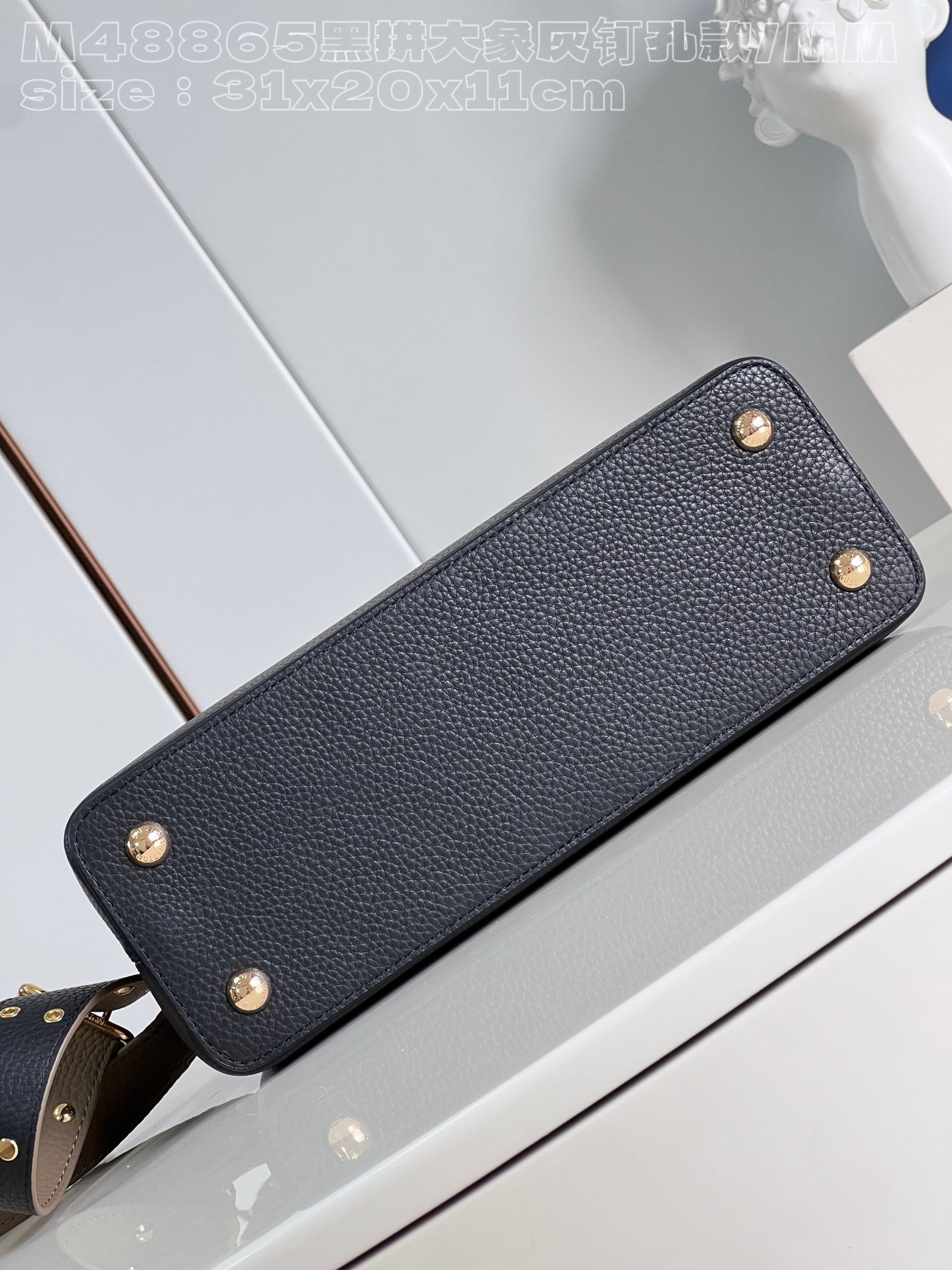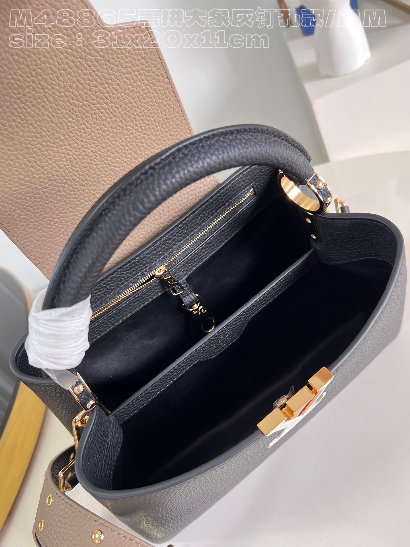 [Exclusive real shot M48865 black with elephant gray nail holes, medium size] Capucines MM handbag is made of calfskin imported from France, with shiny metal accessories. The unique Capucines cover can be stored in the bag to display the letter logo, and can also be turned out to present it. Monogram Flower pattern size: 31.5x20x11cm