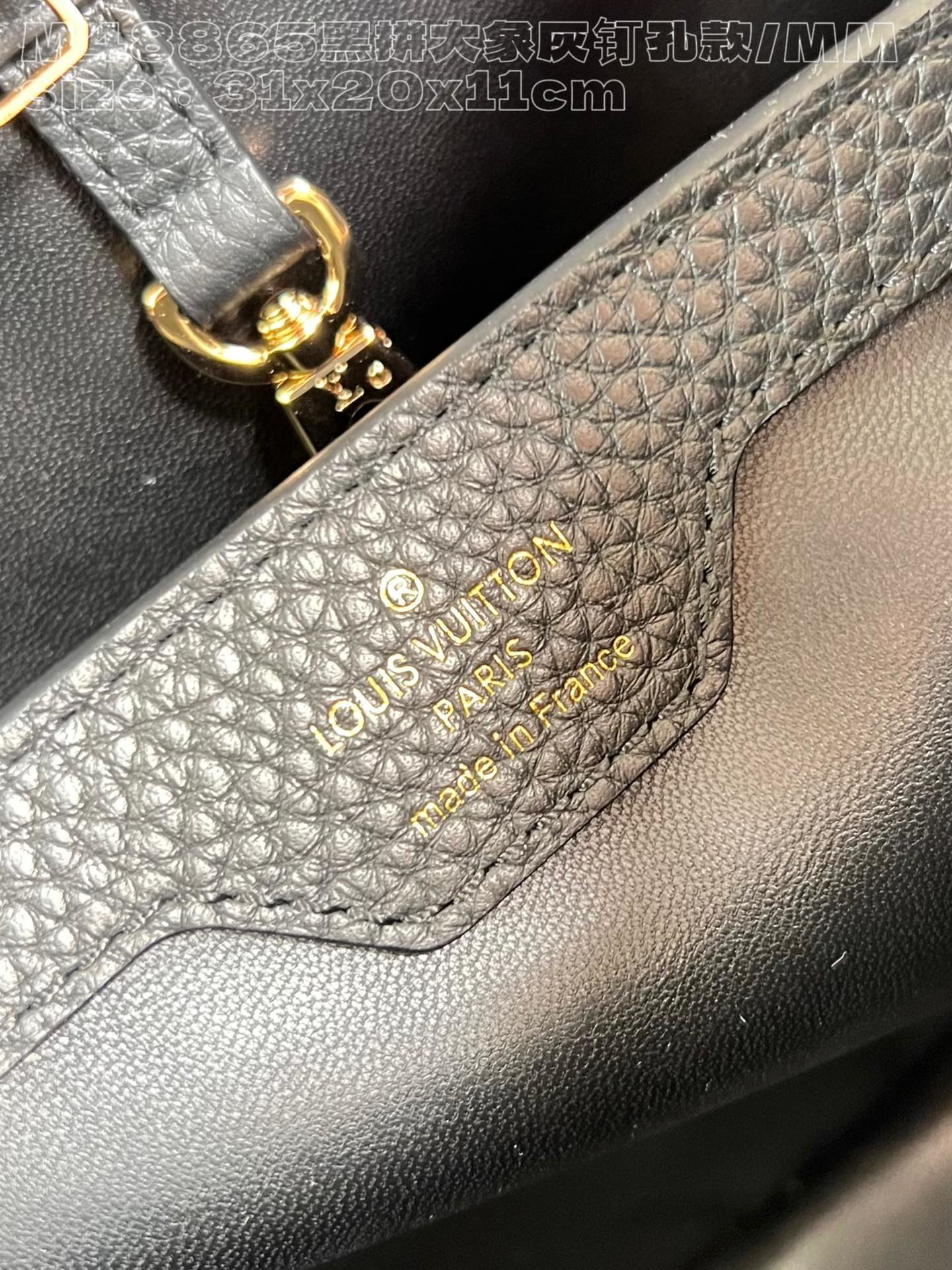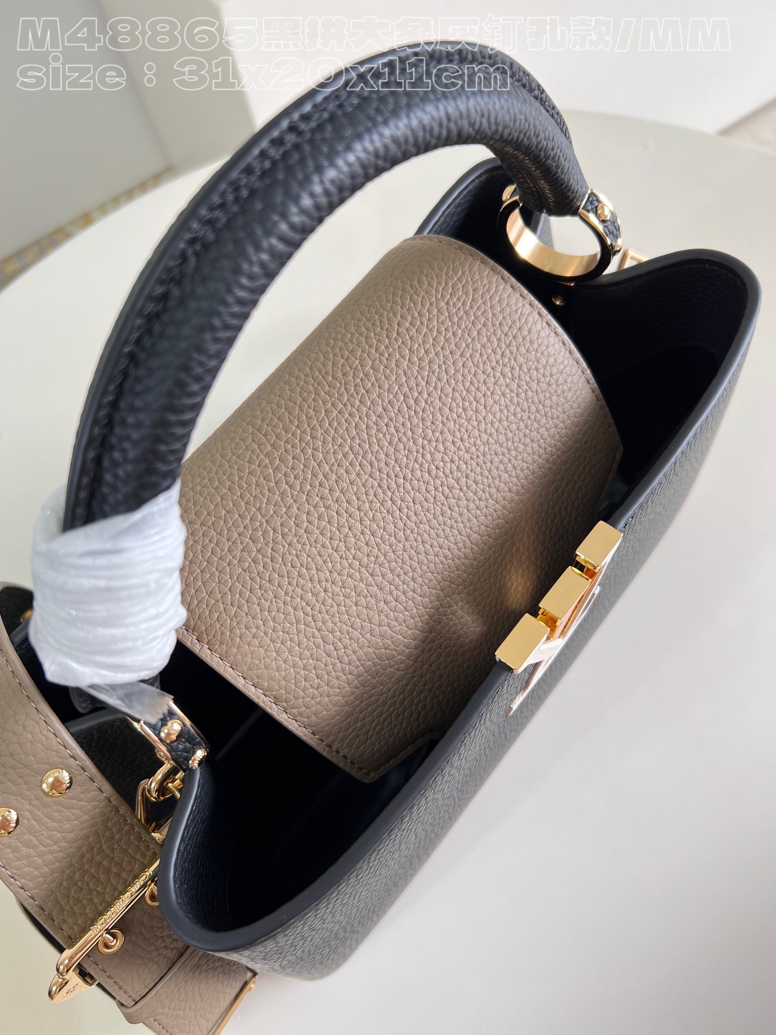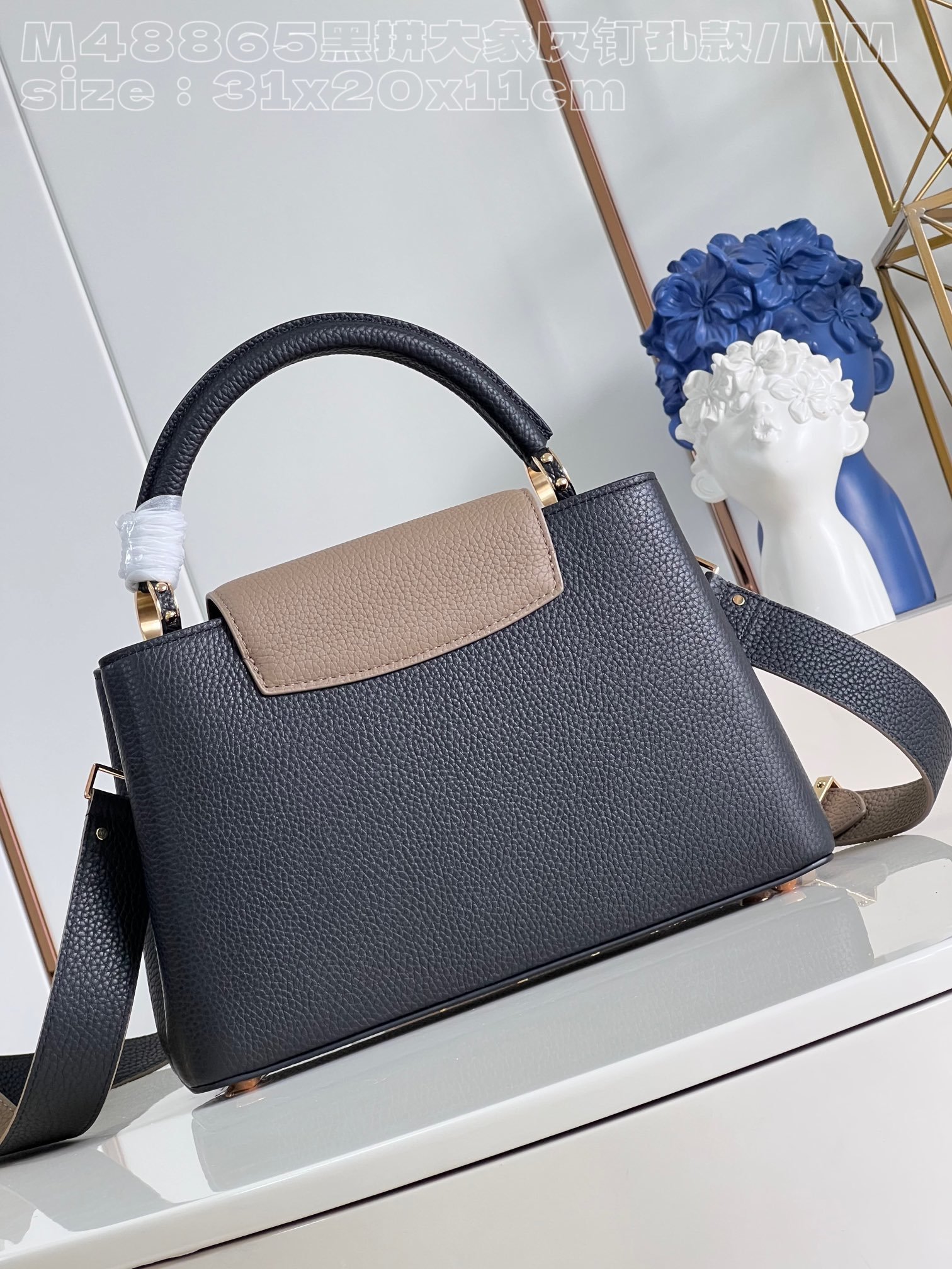 [Exclusive real shot M48865 black with elephant gray nail holes, medium size] Capucines MM handbag is made of calfskin imported from France, with shiny metal accessories. The unique Capucines cover can be stored in the bag to display the letter logo, and can also be turned out to present it. Monogram Flower pattern size: 31.5x20x11cm