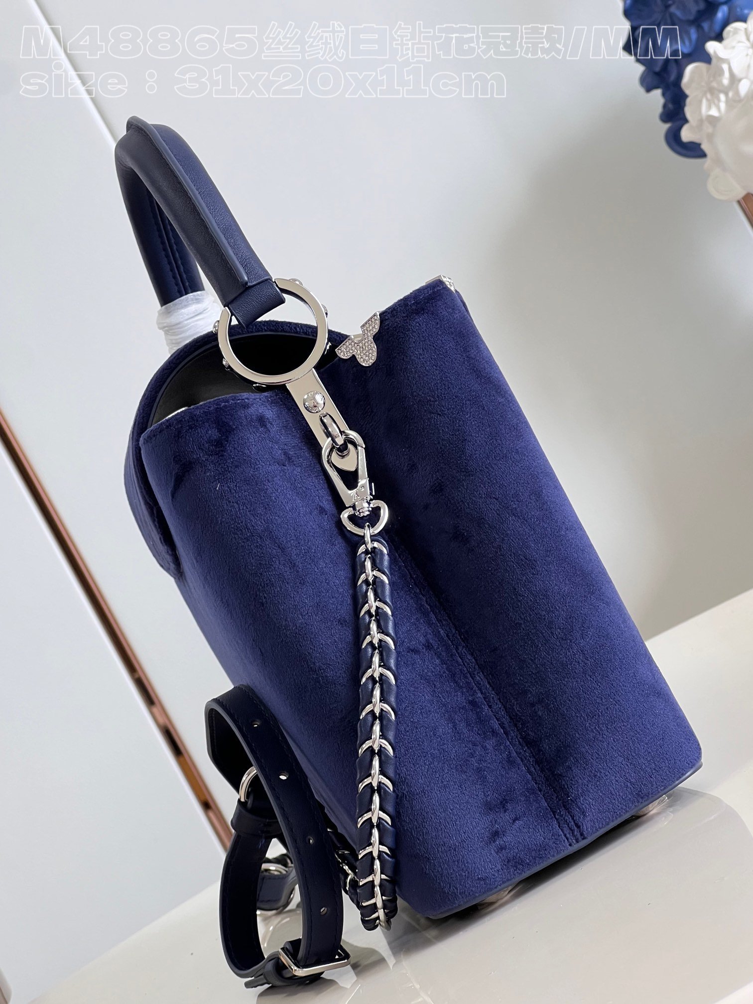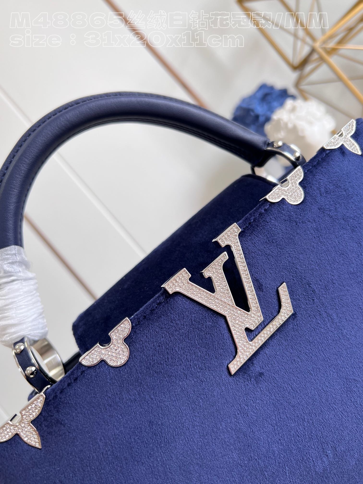 [Exclusive real shot M48865 Velvet White Diamond Corolla Style/Medium Size] This Capucines Flower Crown MM handbag looks up at the starry night sky, and the deep velvet fabric is decorated with Monogram flowers. Each one is inlaid with imitation crystal, releasing eye-catching light. Comes with a woven chain shoulder strap, which can be worn as a shoulder or cross-body bag. It adds eye-catching color to a glamorous evening look. size:31.5x20x11cm