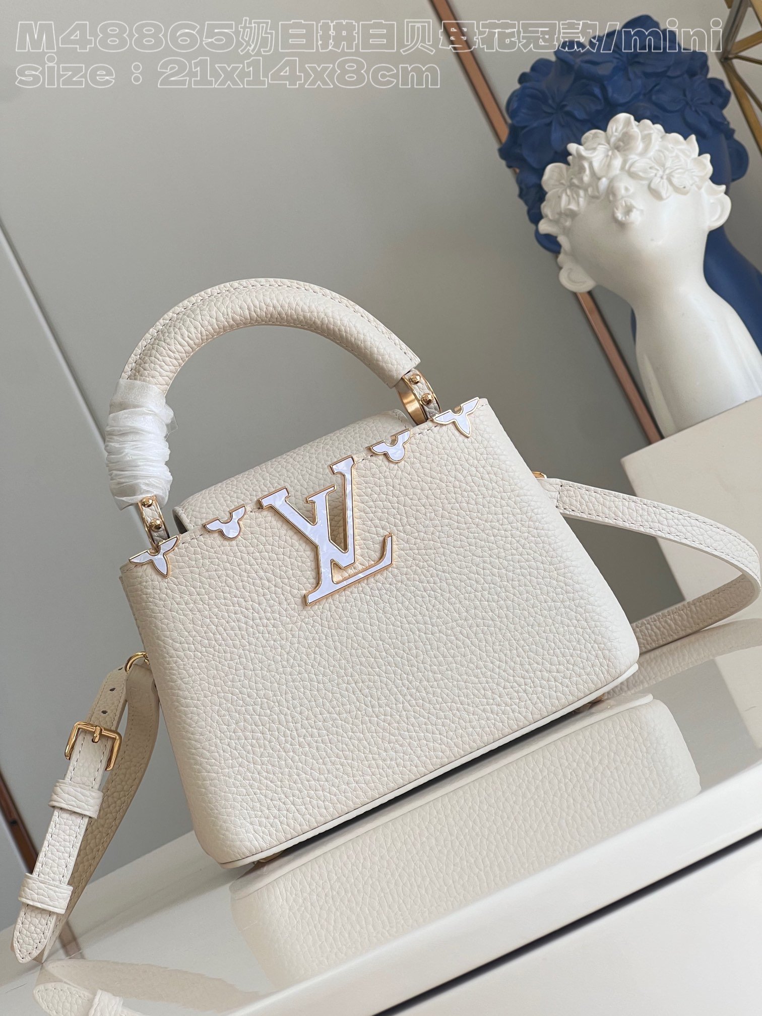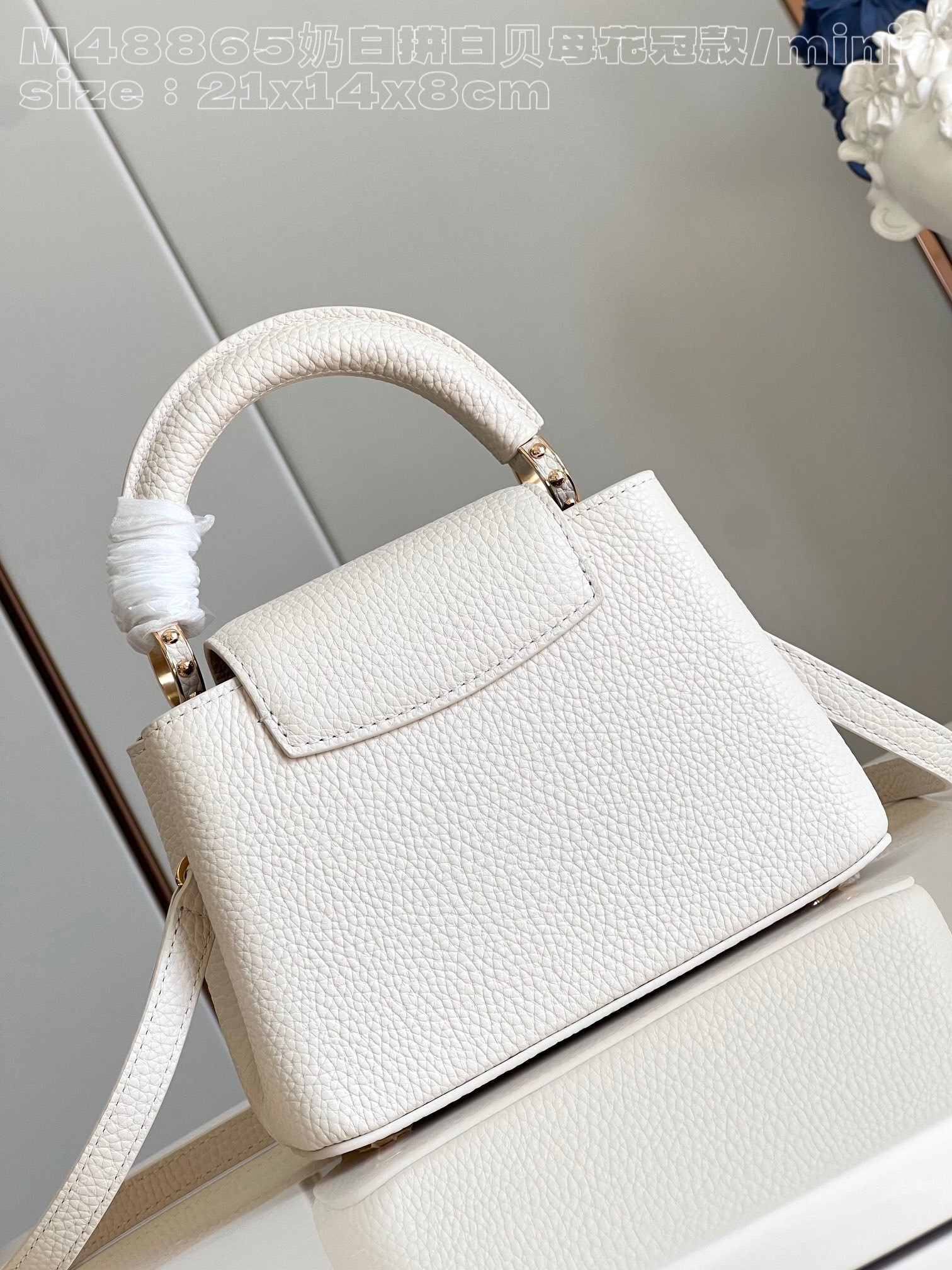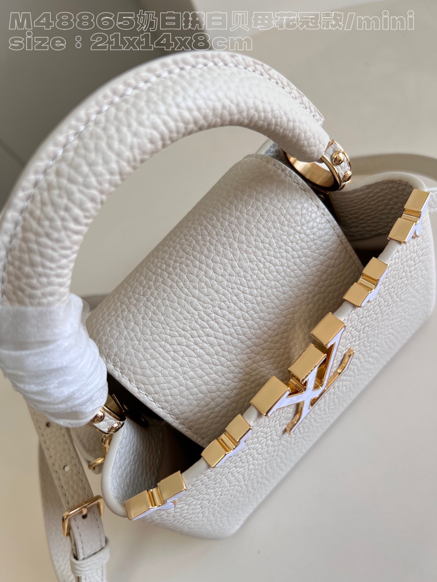 [Exclusive real shot M48865 milk white and white mother-of-pearl corolla mini] Capucines mini handbag imported from France calfskin, shiny metal accessories, unique Capucines cover can be stored in the bag to display the letter logo, and can be turned out to display the Monogram Flower pattern size:21x14x8 cm