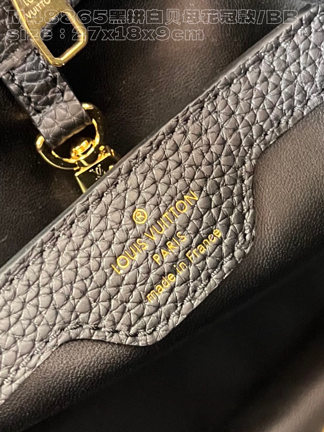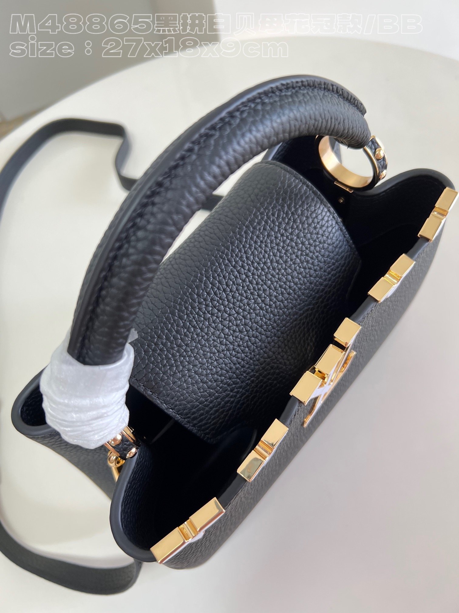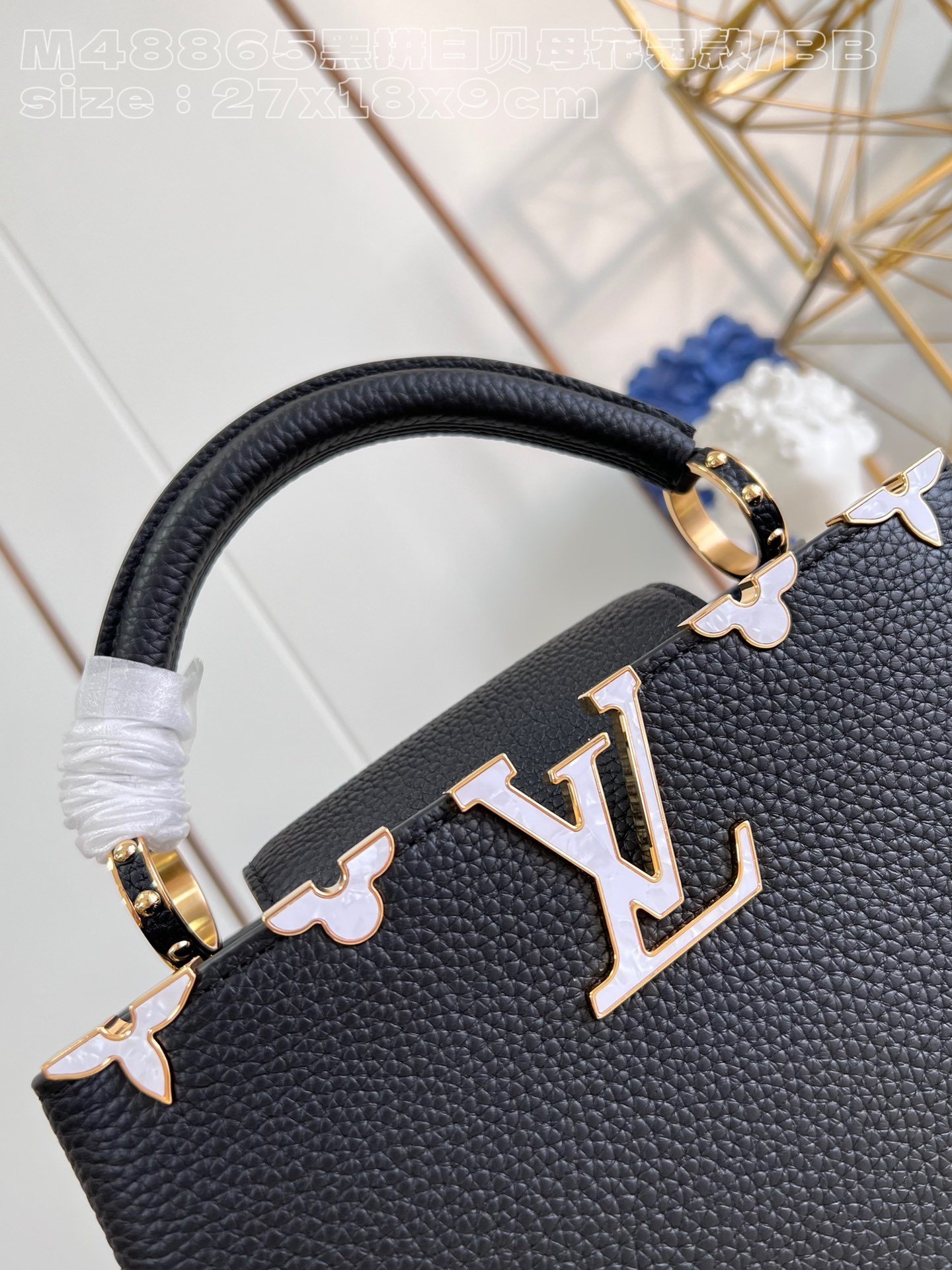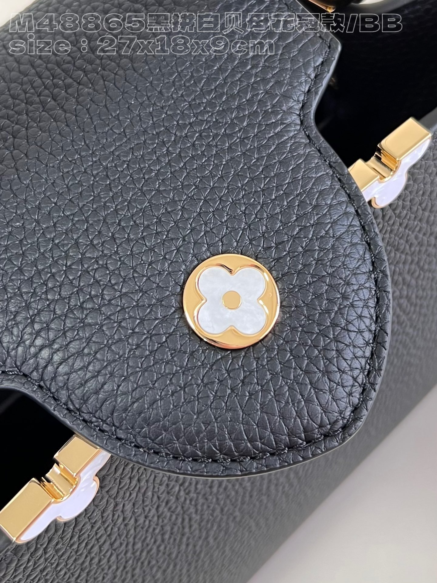 [Exclusive real shot M48865 black and white mother-of-pearl corolla small size] Capucines BB handbag is made of calfskin imported from France, with shiny metal accessories. The unique Capucines cover can be stored in the bag to display the letter logo, and can be turned out to display the Monogram. Flower pattern size: 27x18x9cm