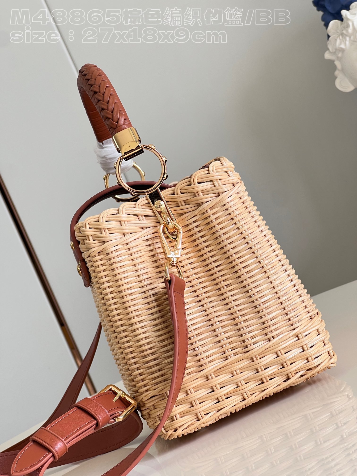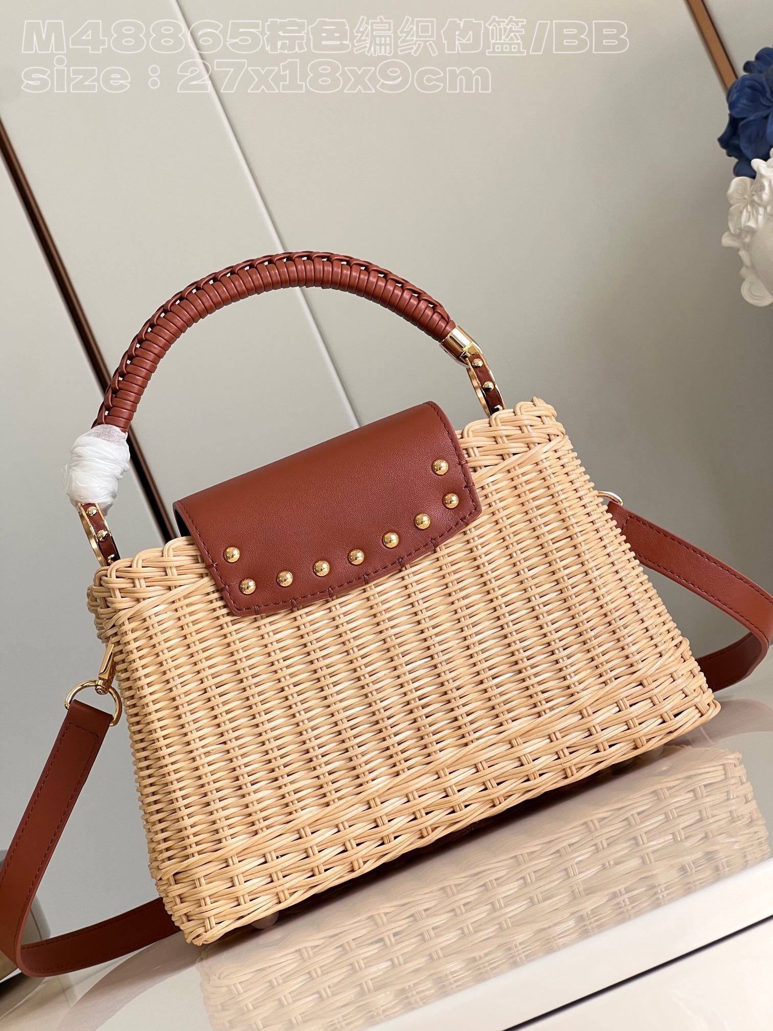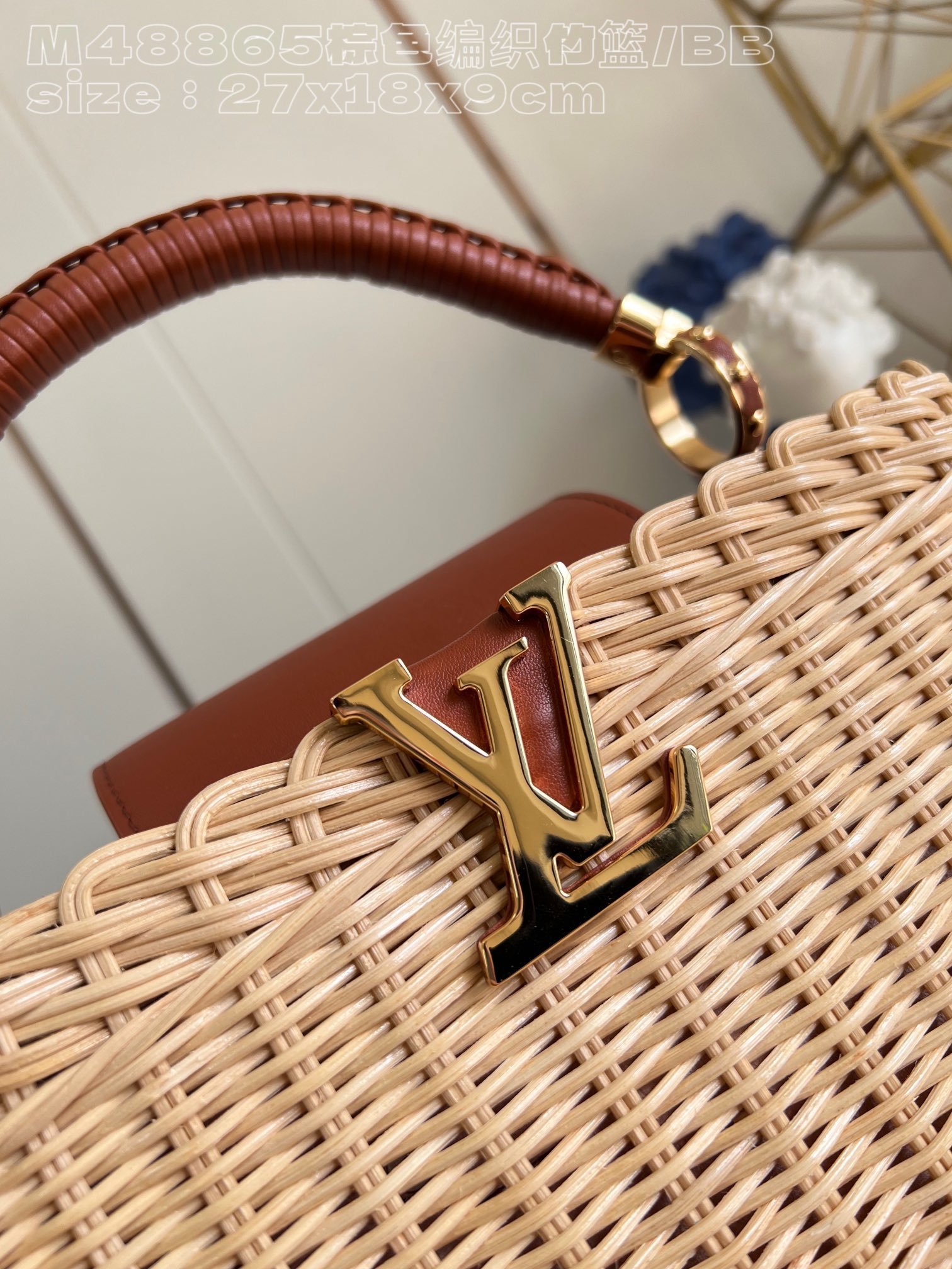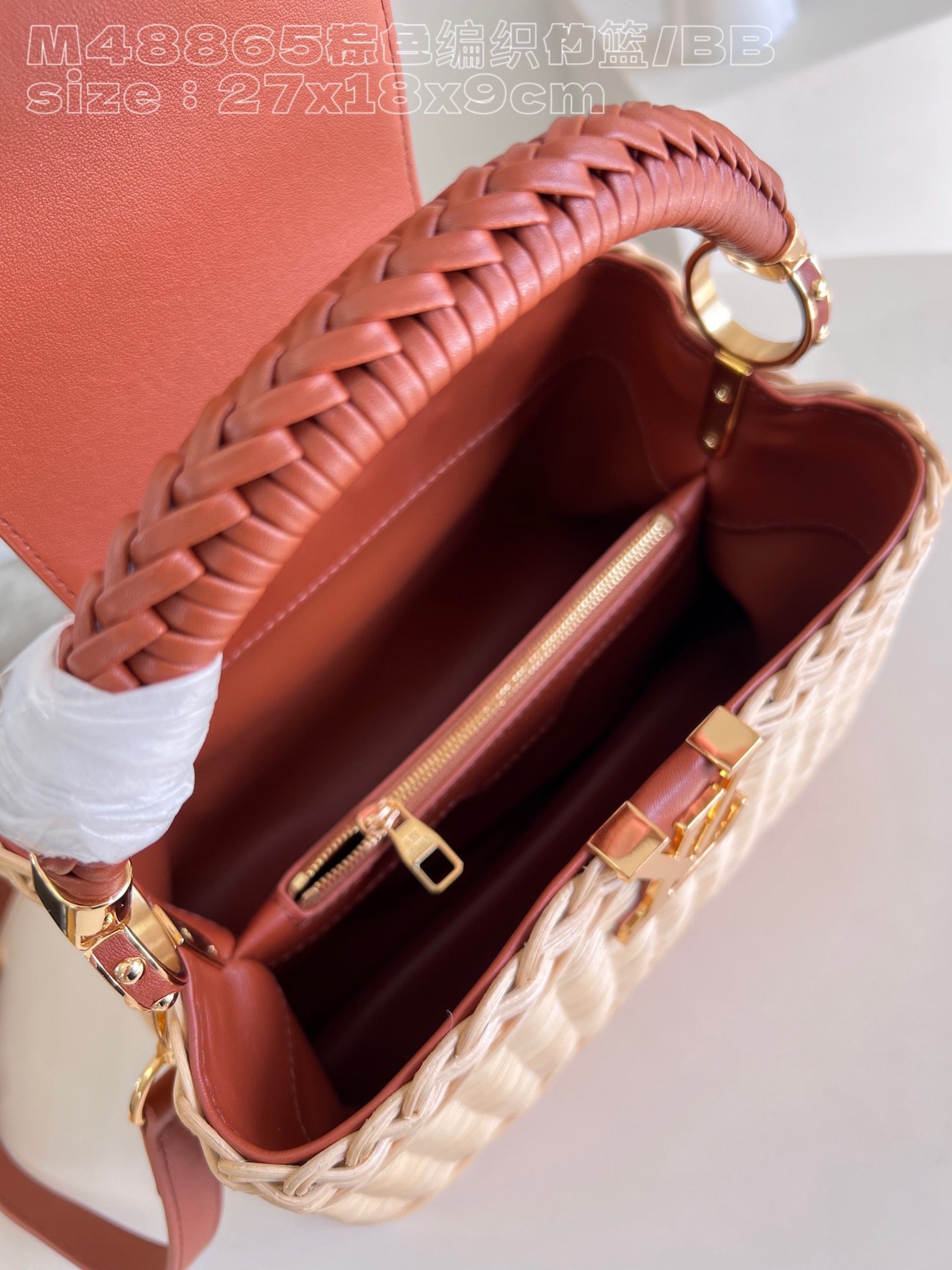 [Exclusive real shot M48865 brown woven bamboo basket/small size] This Capucines BB handbag uses rattan soaked in water to soften it, and then hand-woven for three hours to achieve a classic configuration. It has a calfskin-shaped flap and top handle, and a slim, detachable and adjustable leather strap for easy shoulder or cross-body wear. 27 x 17 x 14 cm (length x height x width)