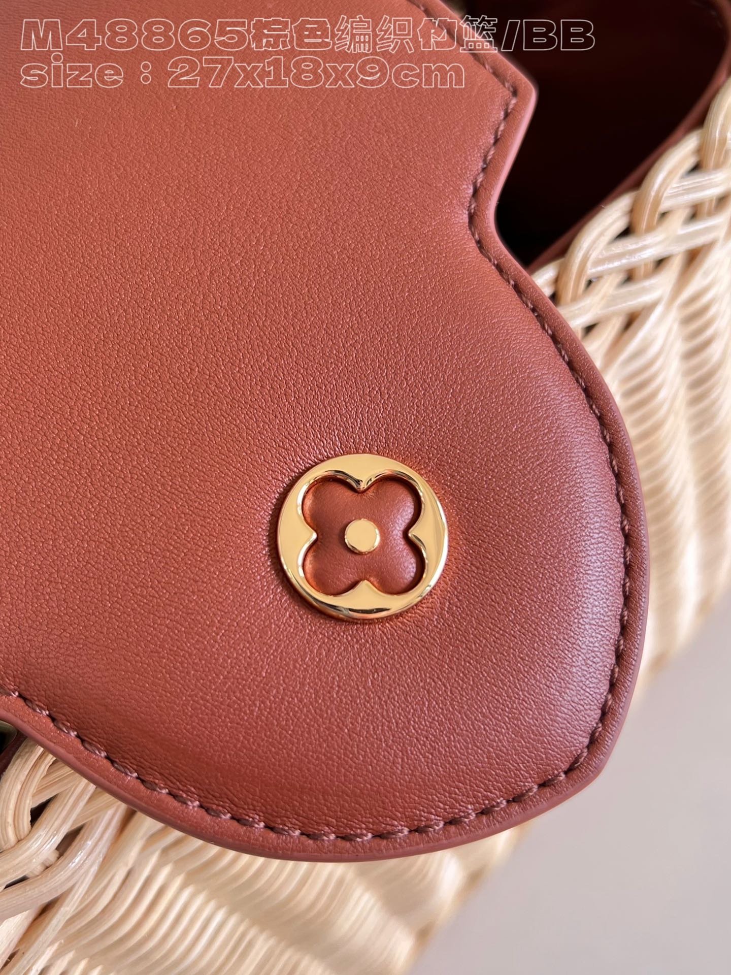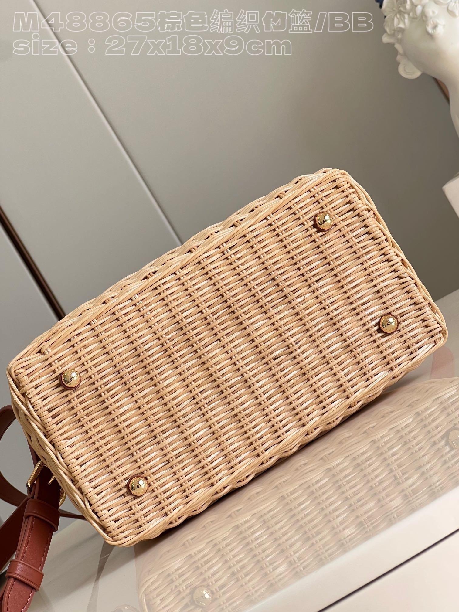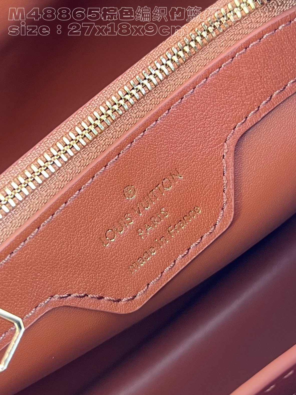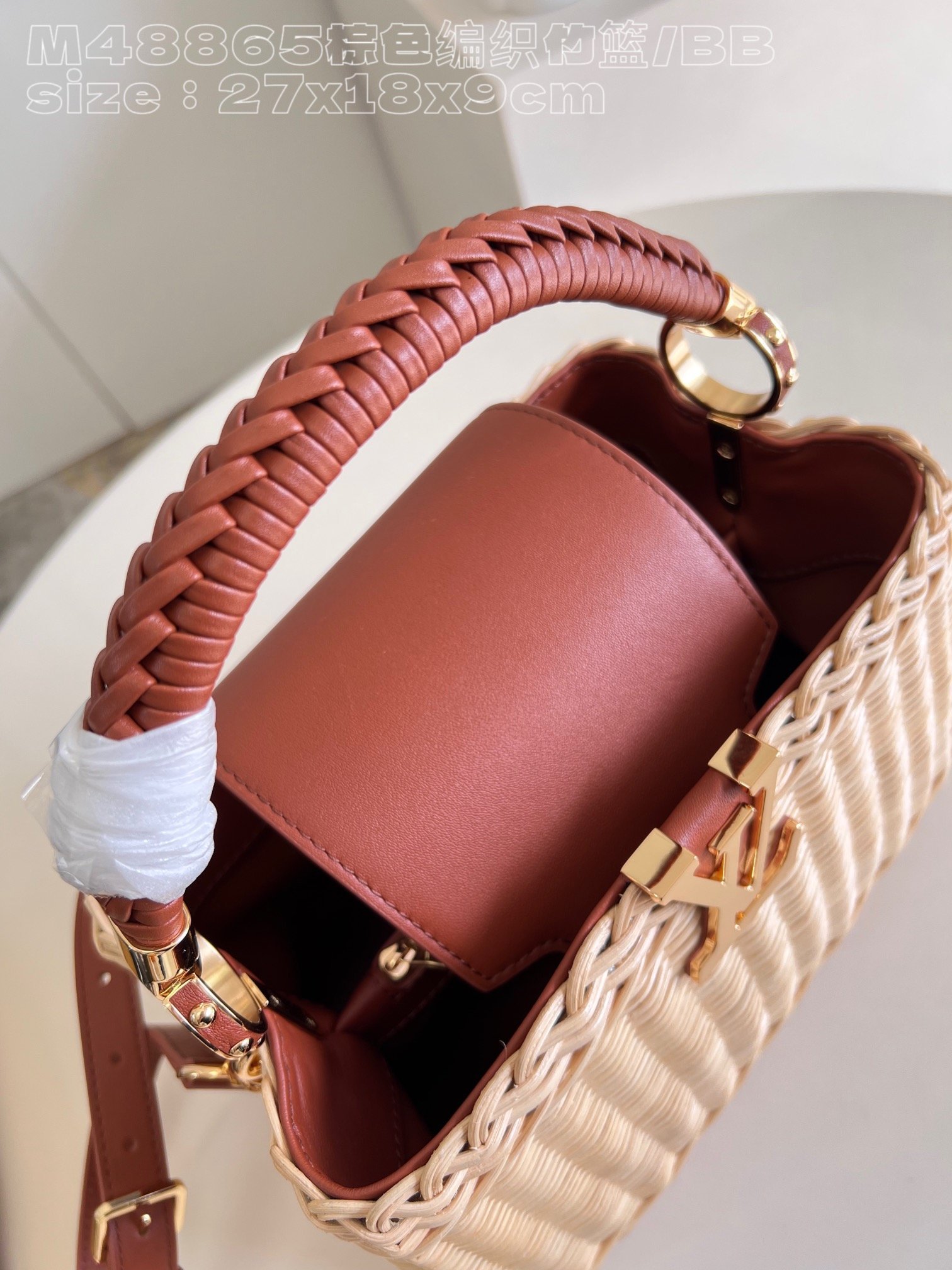 [Exclusive real shot M48865 brown woven bamboo basket/small size] This Capucines BB handbag uses rattan soaked in water to soften it, and then hand-woven for three hours to achieve a classic configuration. It has a calfskin-shaped flap and top handle, and a slim, detachable and adjustable leather strap for easy shoulder or cross-body wear. 27 x 17 x 14 cm (length x height x width)