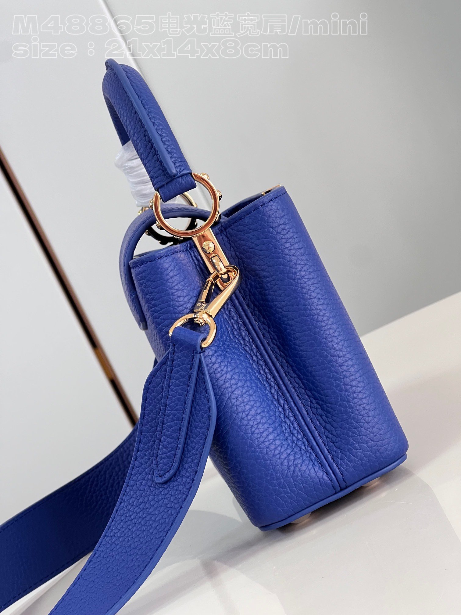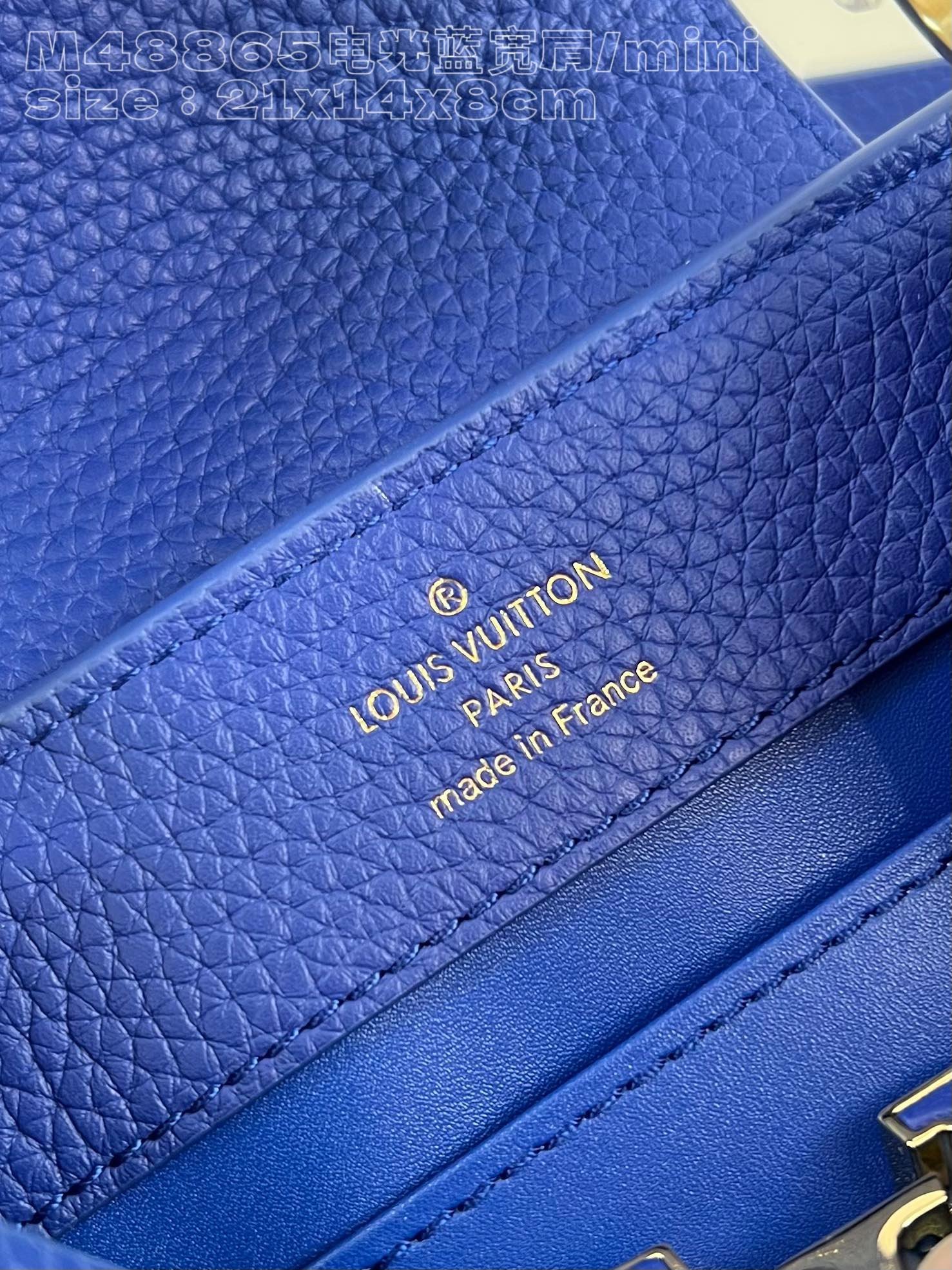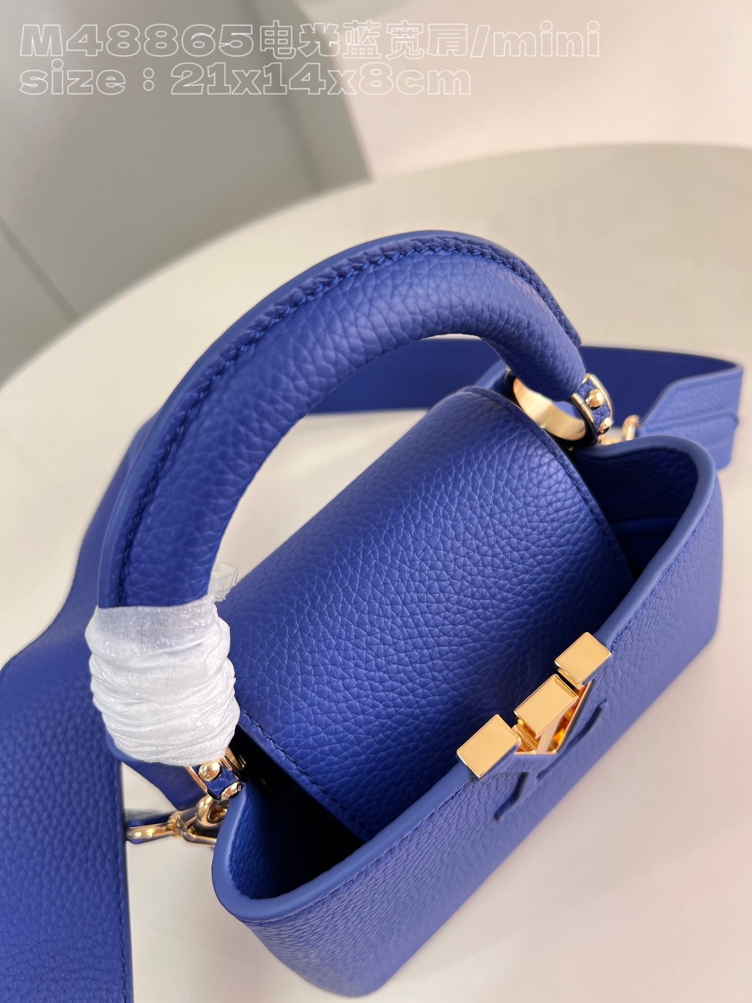 [Exclusive real shot of M48865 electric blue wide shoulder mini] Capucines mini handbag imported from France calfskin, shiny metal accessories, unique Capucines cover can be stored in the bag to display the letter logo, and can be turned out to display the Monogram Flower pattern size: 21x14x8cm