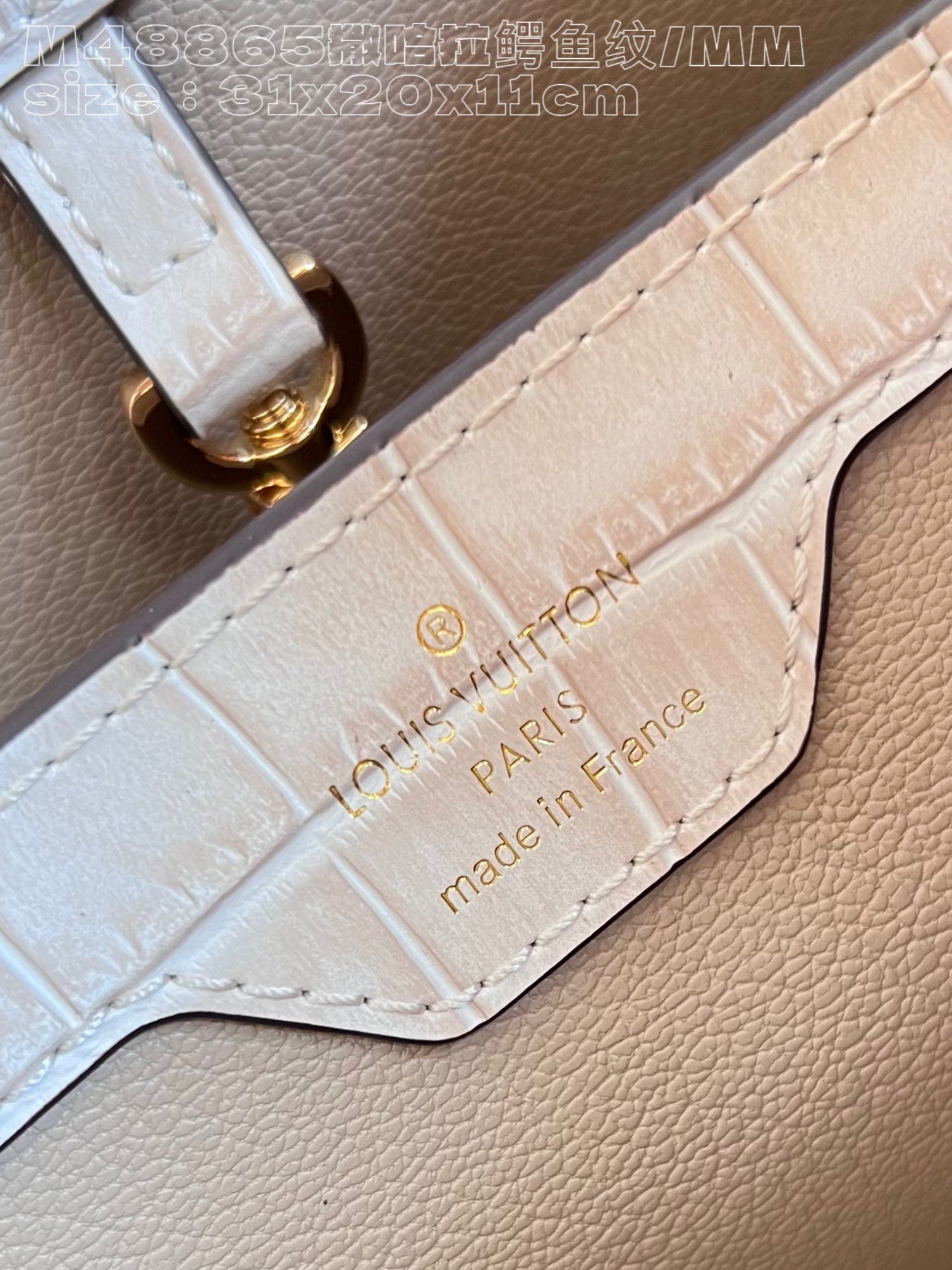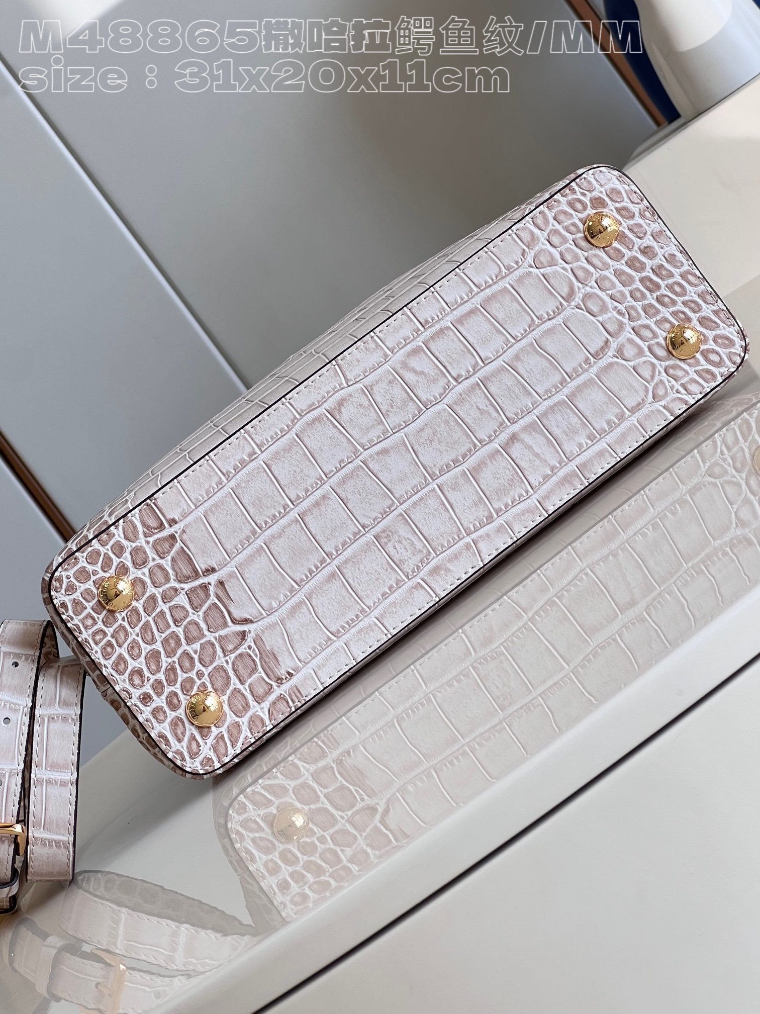 [Exclusive real shot M48865 Sahara crocodile pattern/medium size] Capucines MM handbag is made of crocodile leather and has been polished to make it sparkle and charming. Lined with luxurious goatskin and gleaming metal hardware, the unique Capucines flap can be stored inside the bag to display the monogram, or can be folded out. size:31.5x20x11cm