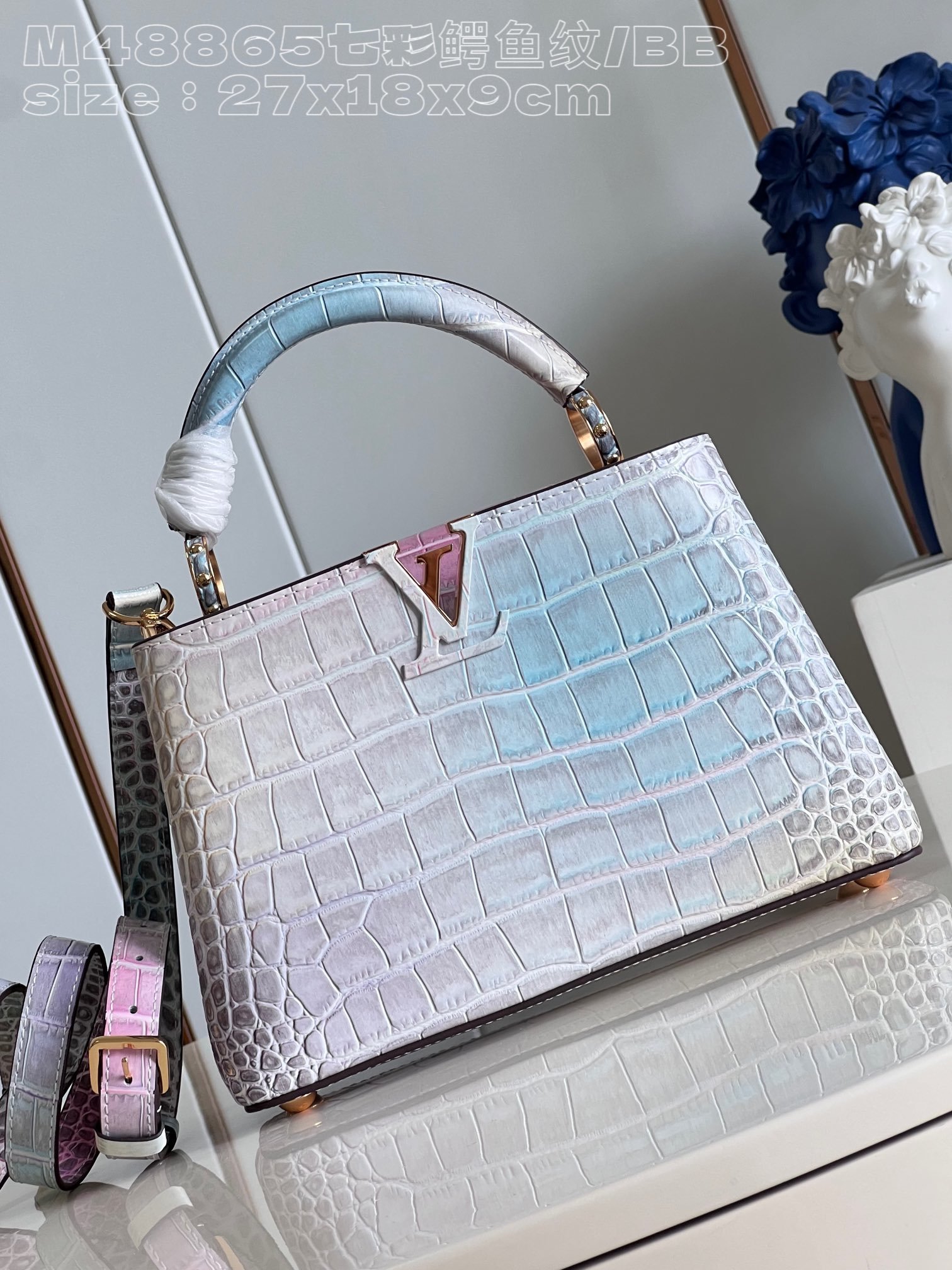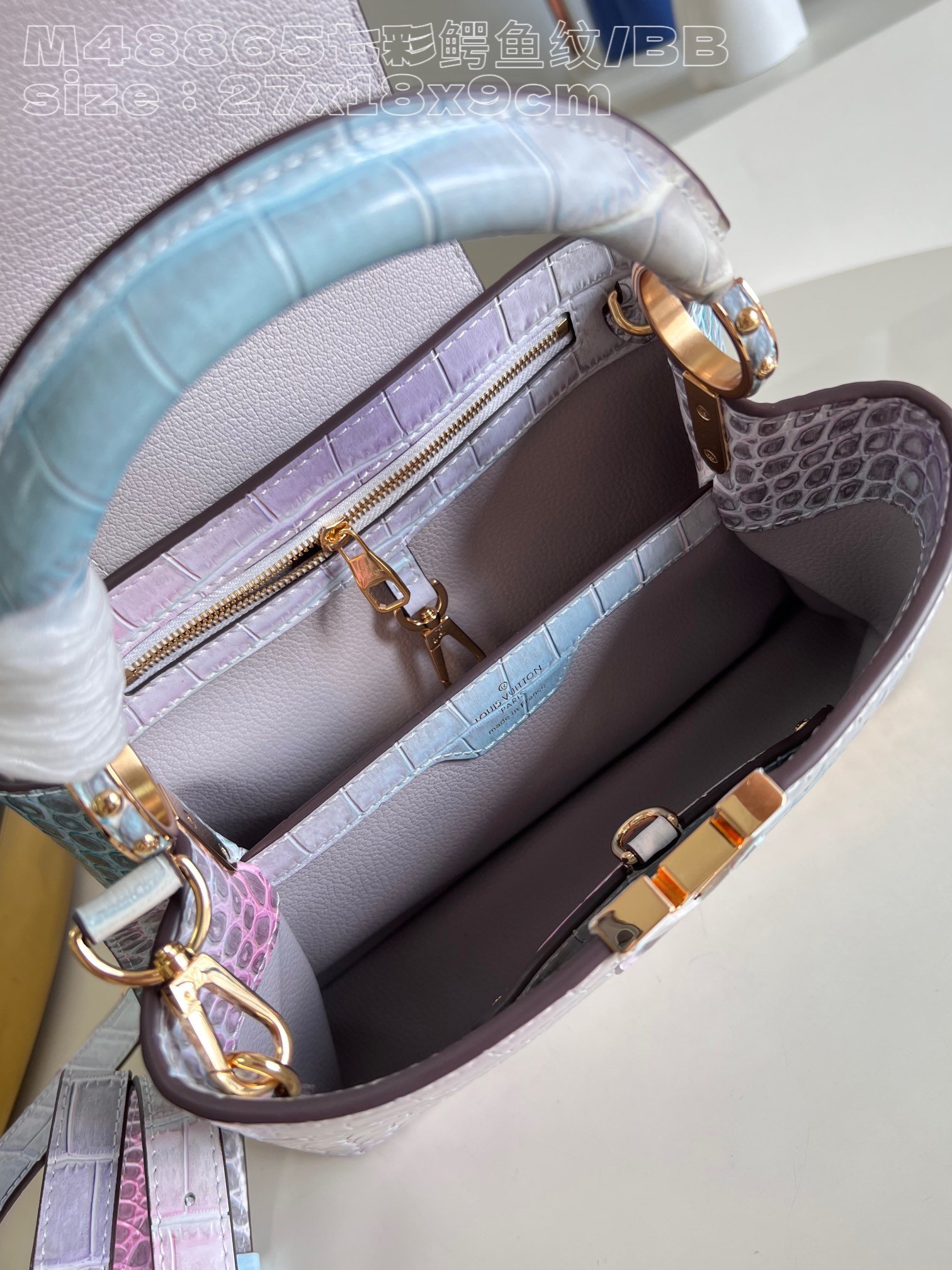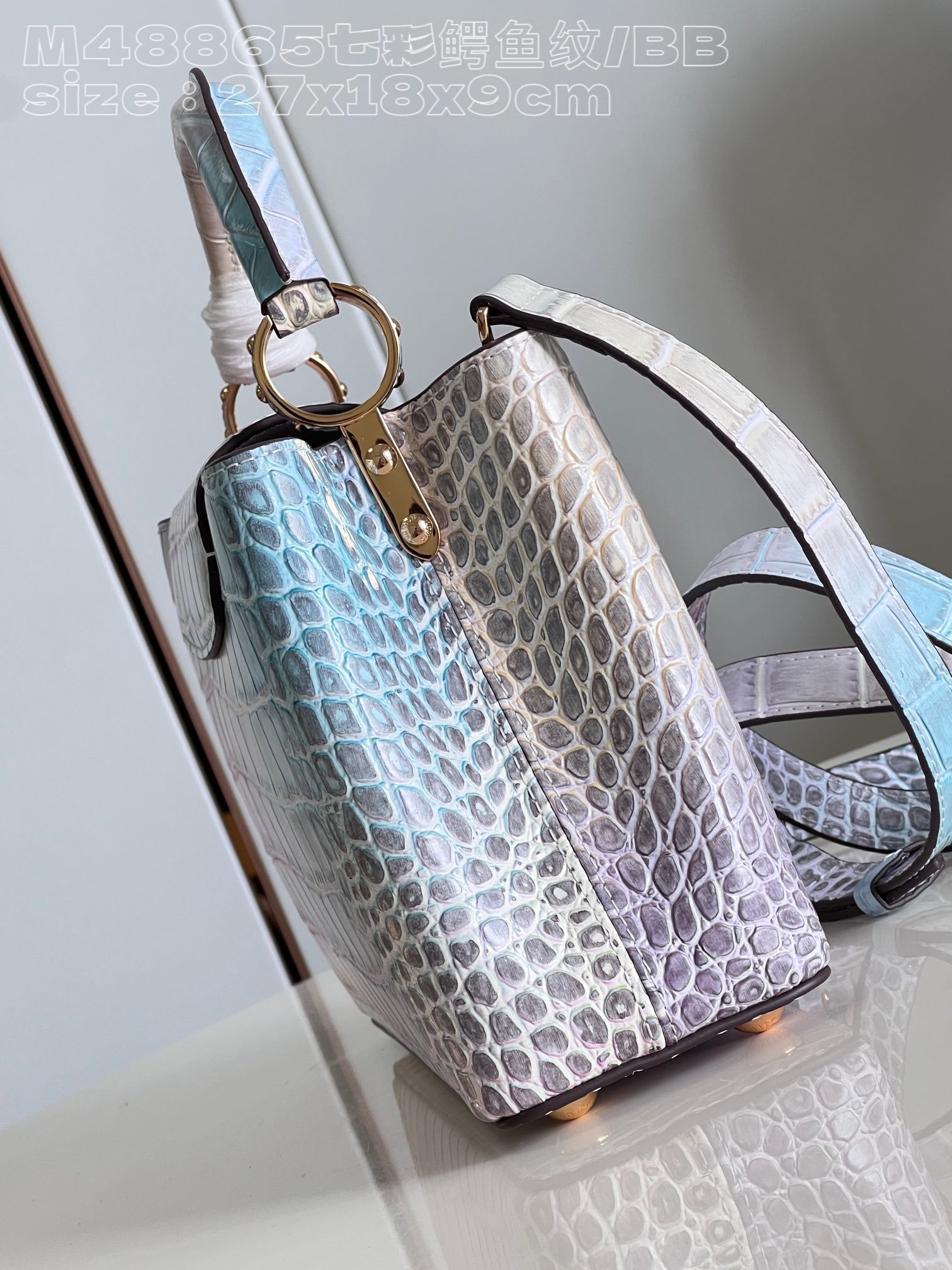 [Exclusive real shot M48865 colorful crocodile pattern/small size] Capucines BB handbag is made of crocodile leather and has been polished to make it sparkle and charming. Lined with luxurious goatskin and gleaming metal hardware, the unique Capucines flap can be stored inside the bag to display the monogram, or can be folded out. size:27x18x9cm