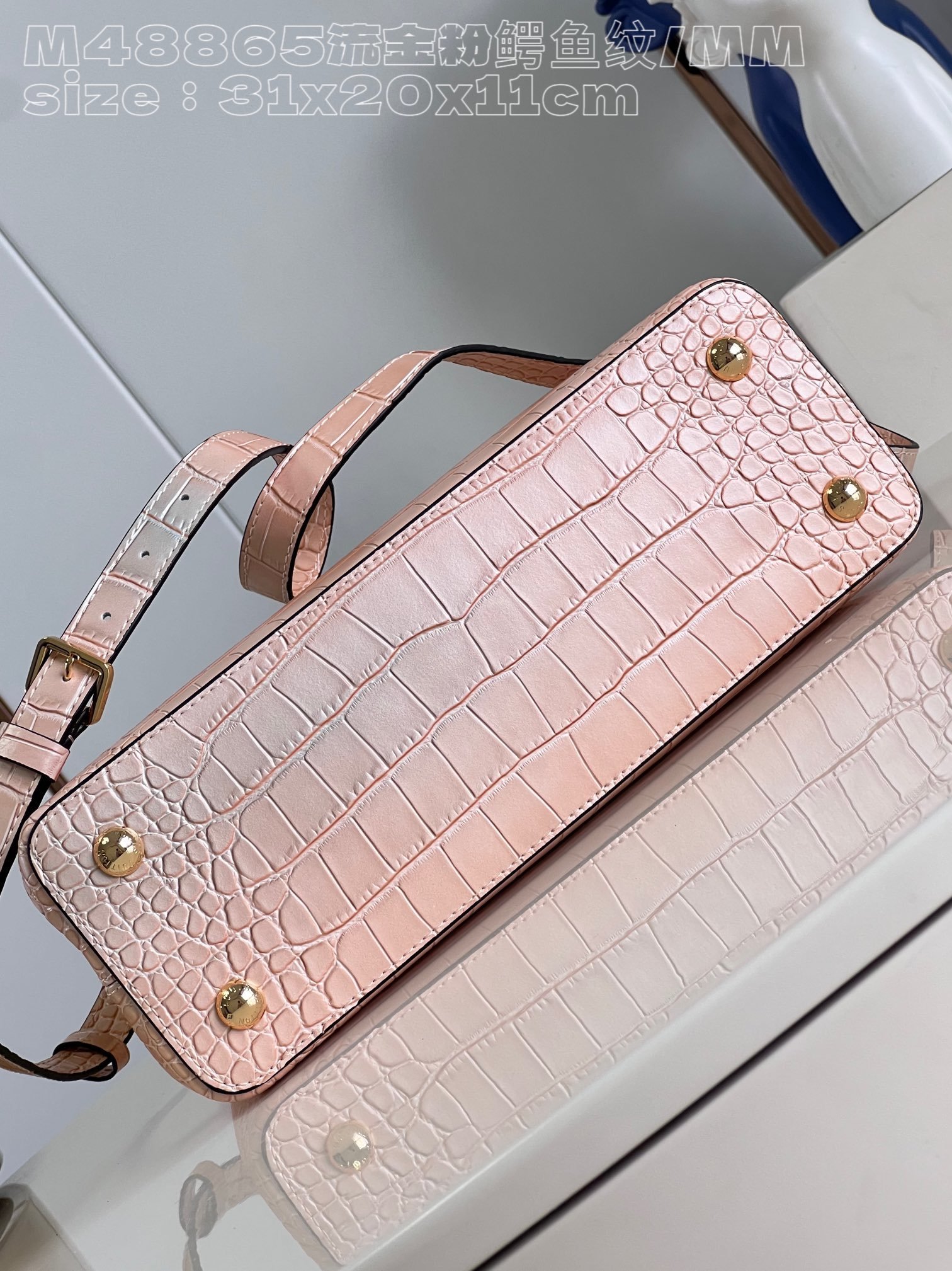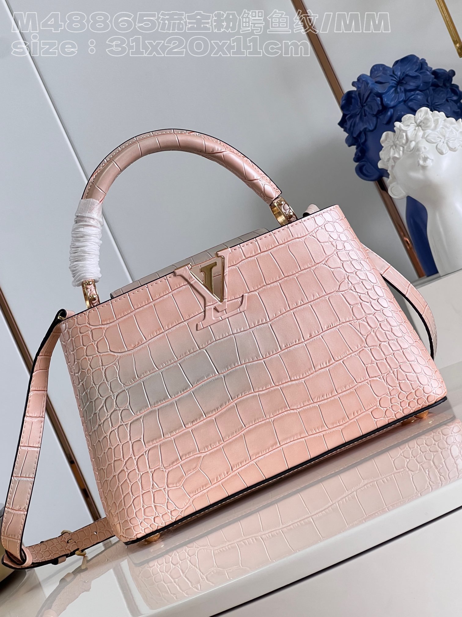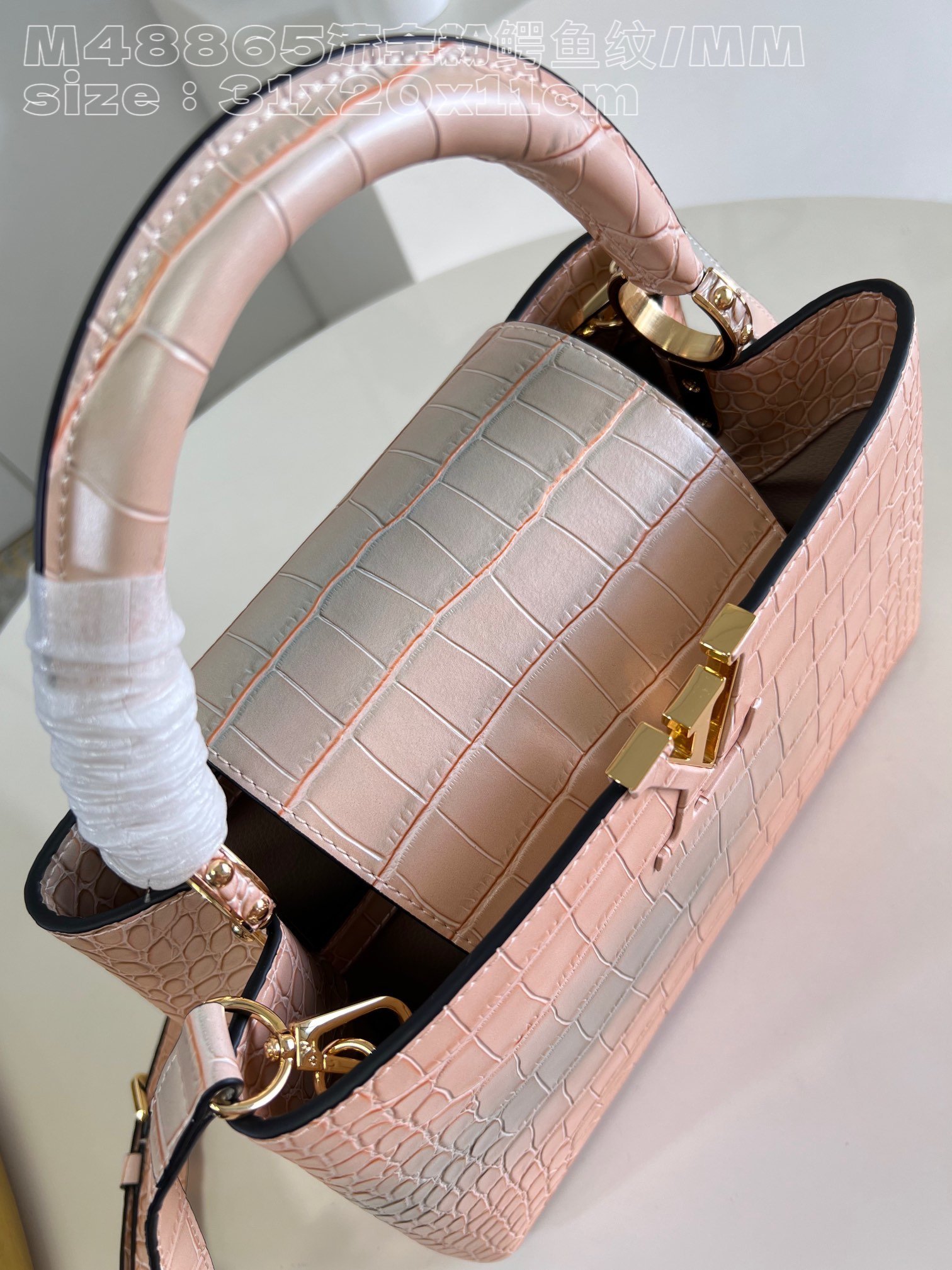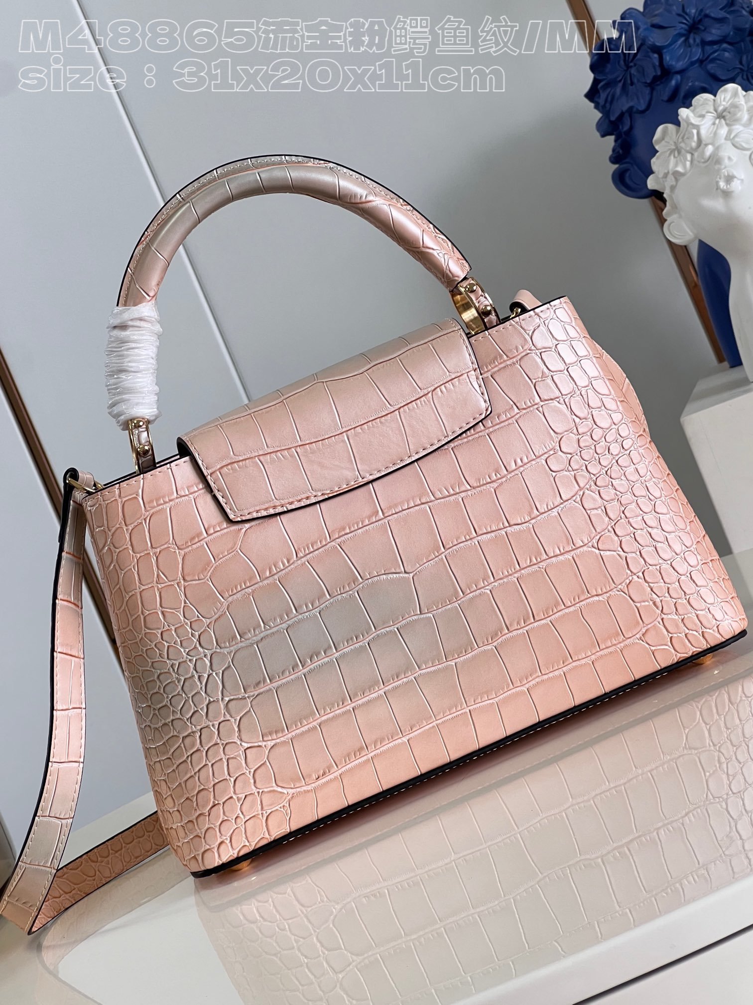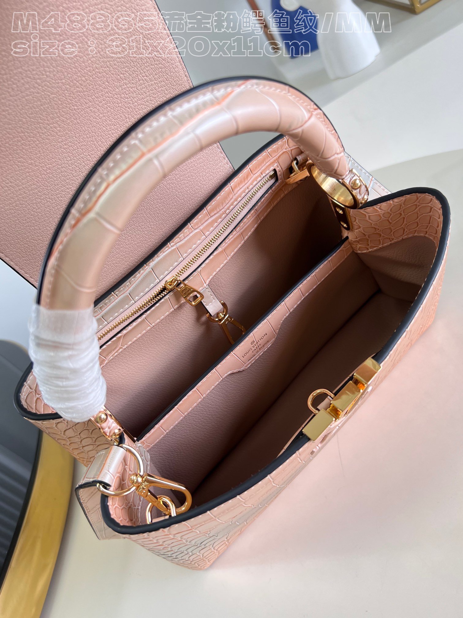 [Exclusive real shot M48865 gold powder crocodile pattern/medium size] Capucines MM handbag is made of crocodile leather and has been polished to make it sparkle and charming. Lined with luxurious goatskin and gleaming metal hardware, the unique Capucines flap can be stored inside the bag to display the monogram, or can be folded out. size:31.5x20x11cm