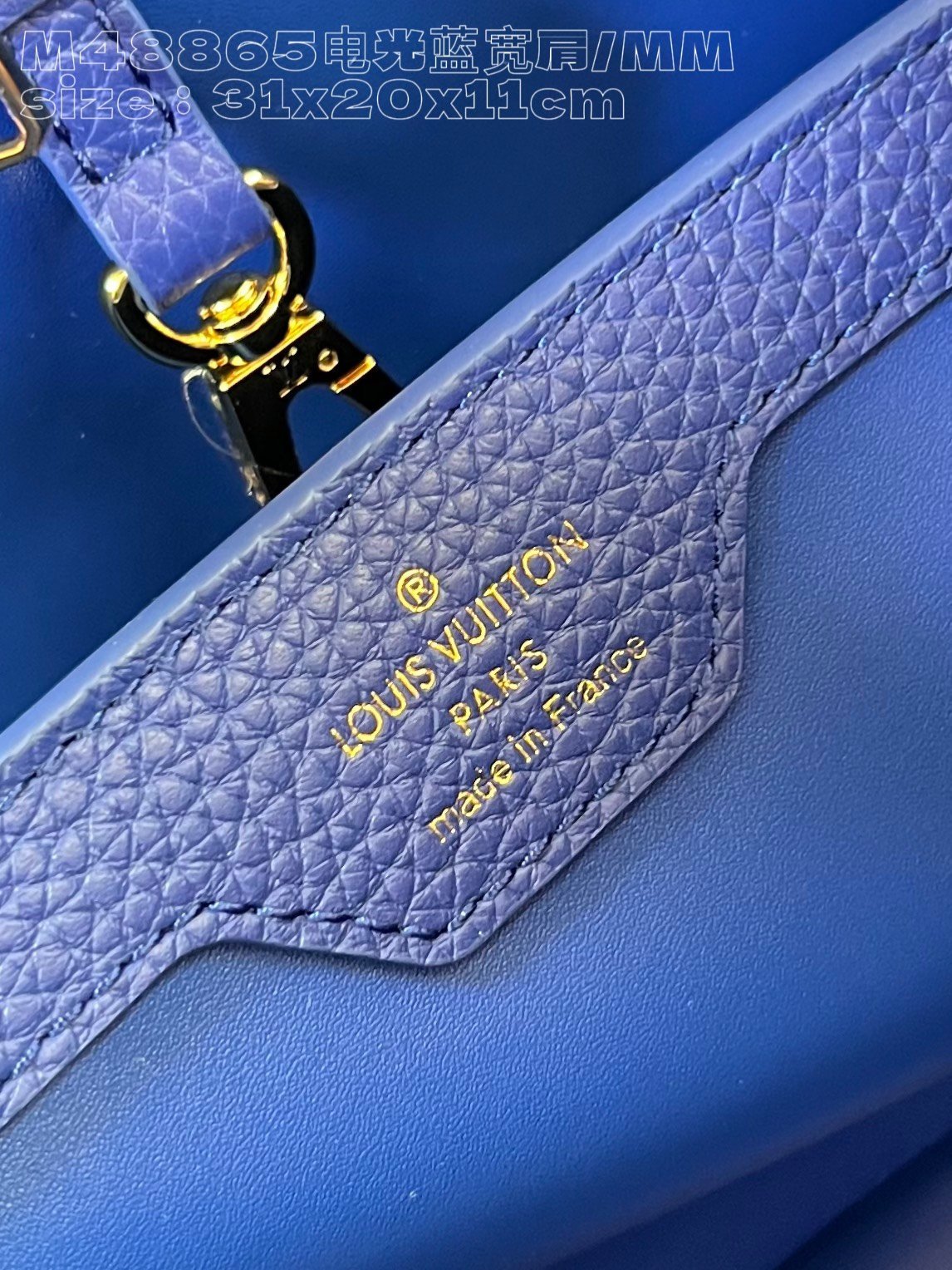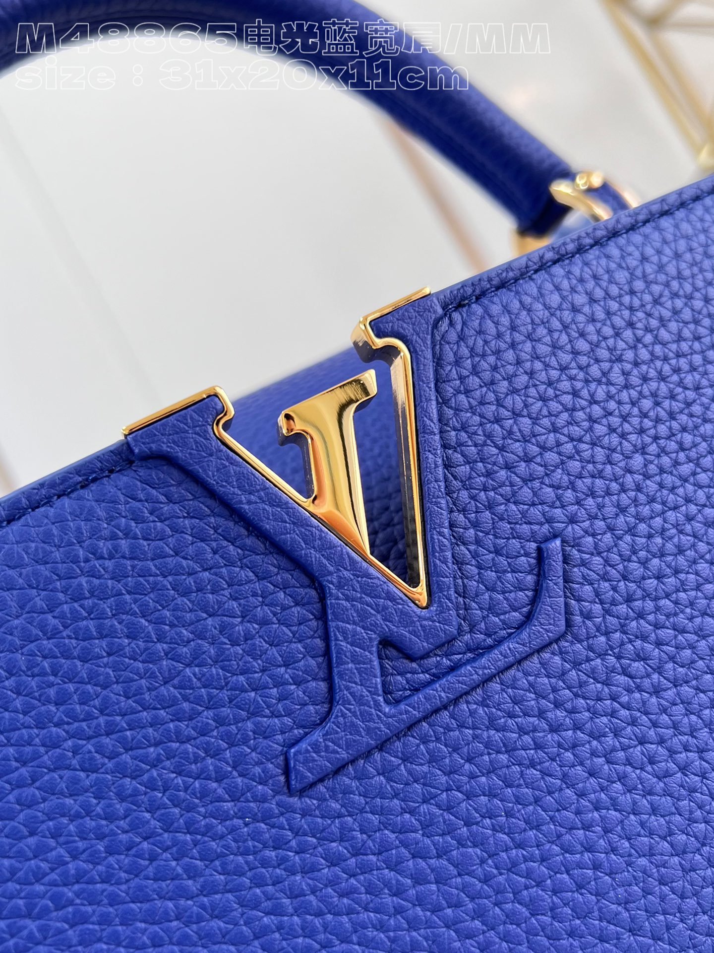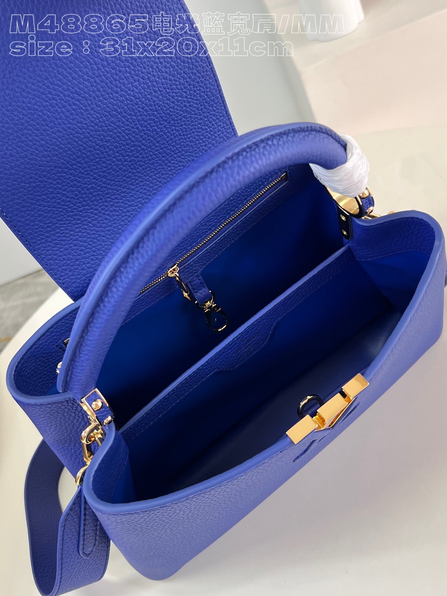 [Exclusive real shot M48865 Electro-Optical Blue Broad Shoulder Medium] Capucines MM handbag is made of French imported calfskin, shiny metal accessories, and the unique Capucines cover can be stored in the bag to display the letter logo, and can be turned out to display the Monogram Flower pattern size :31.5x20x11cm