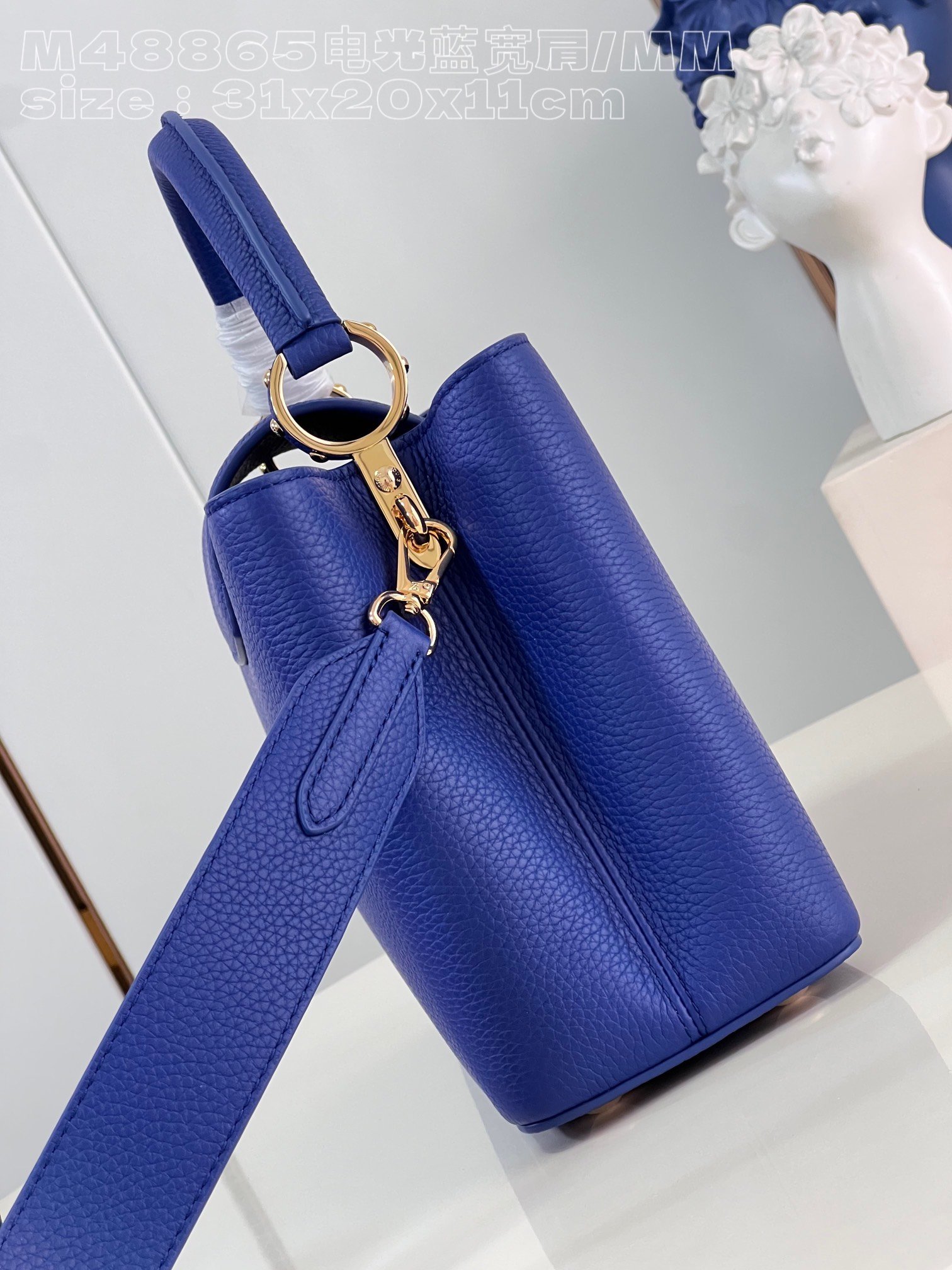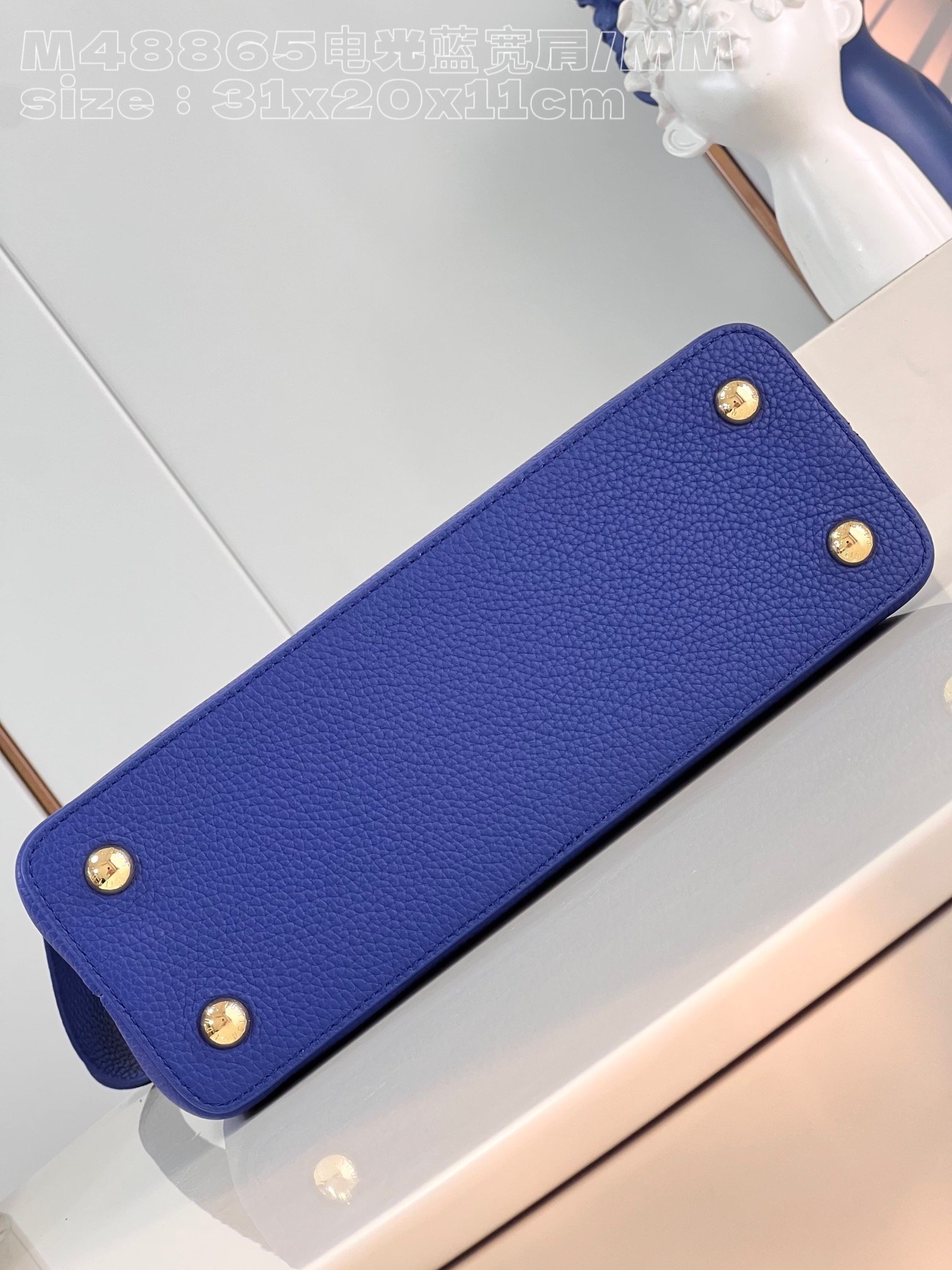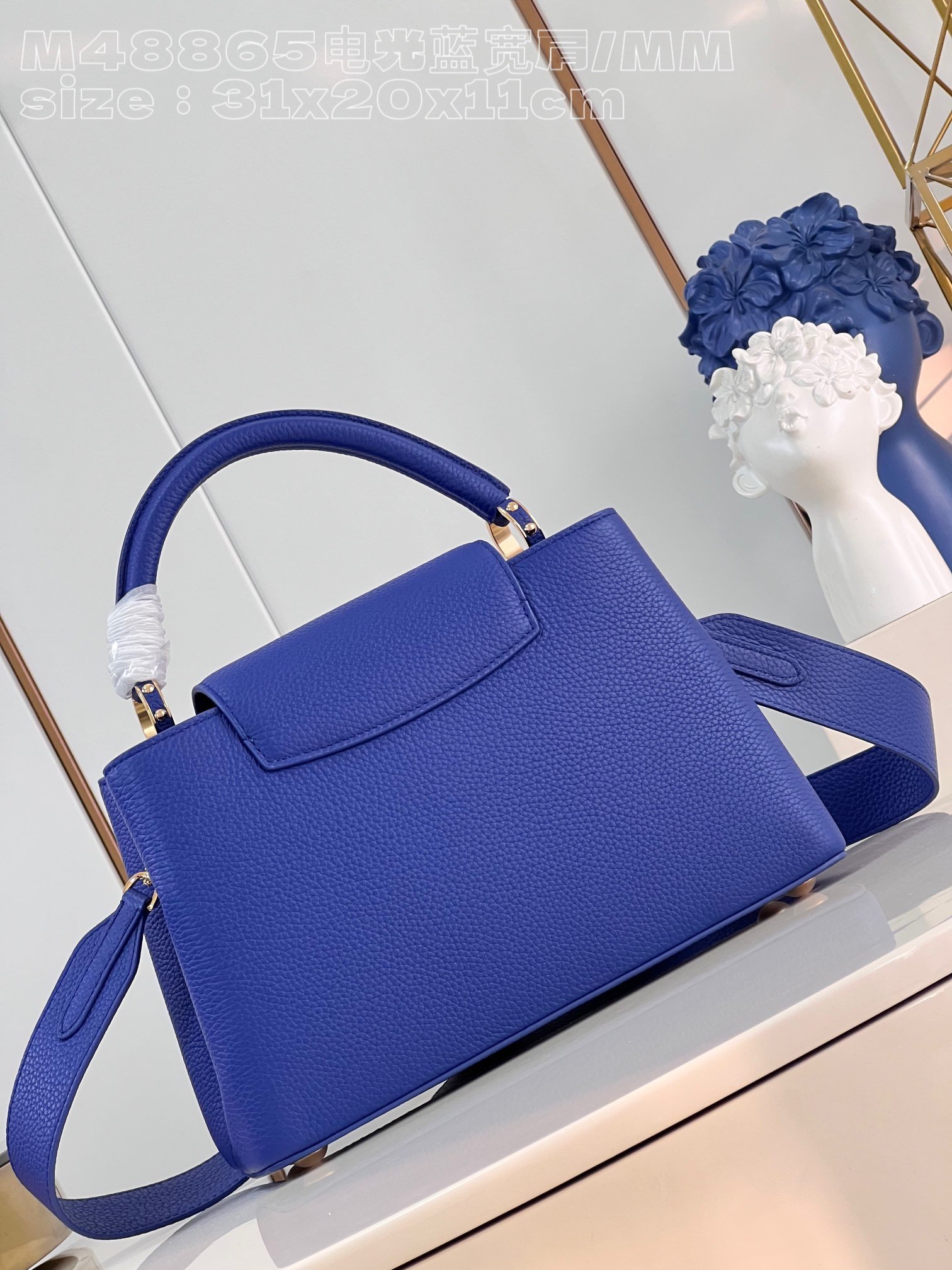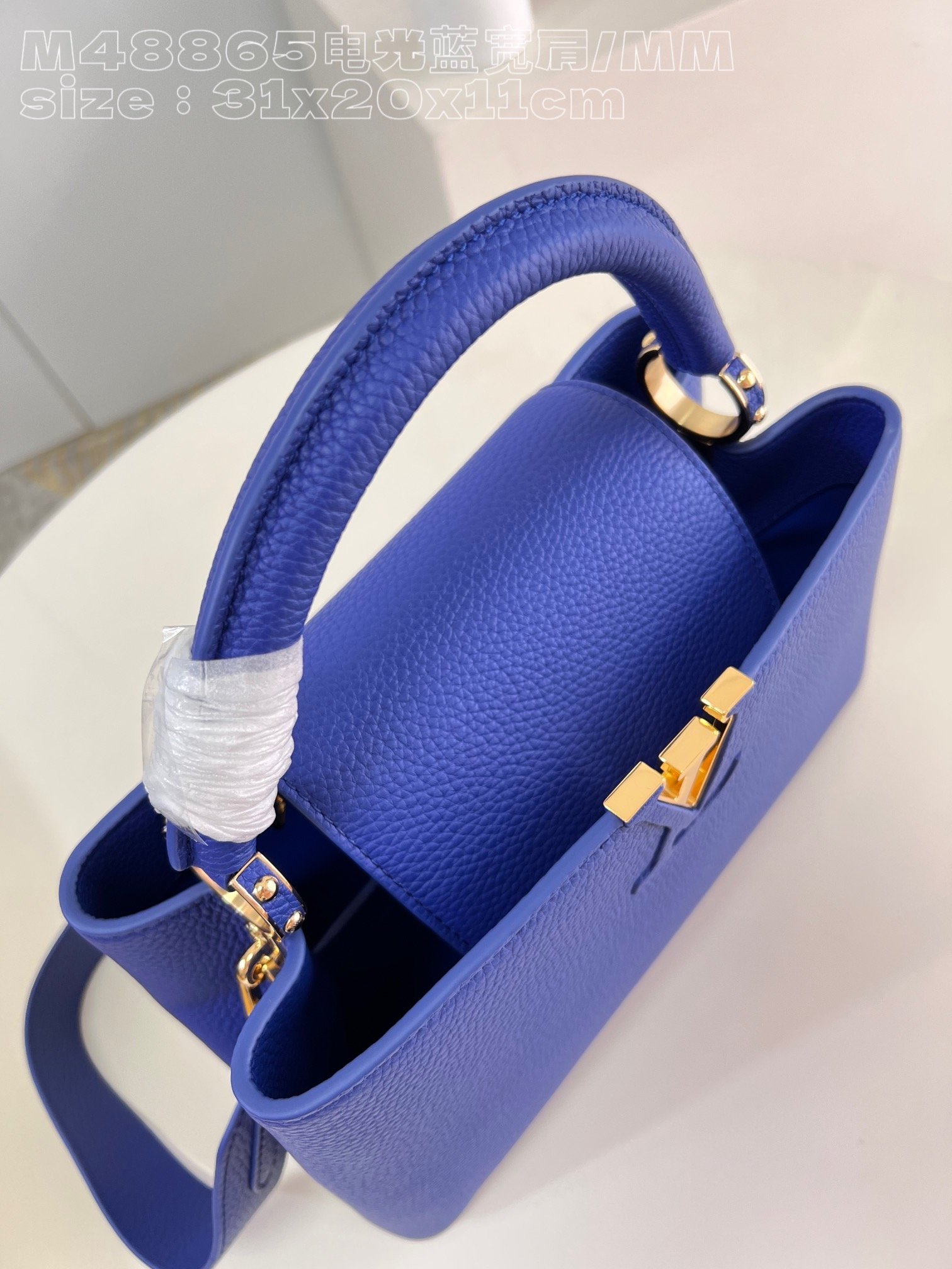 [Exclusive real shot M48865 Electro-Optical Blue Broad Shoulder Medium] Capucines MM handbag is made of French imported calfskin, shiny metal accessories, and the unique Capucines cover can be stored in the bag to display the letter logo, and can be turned out to display the Monogram Flower pattern size :31.5x20x11cm