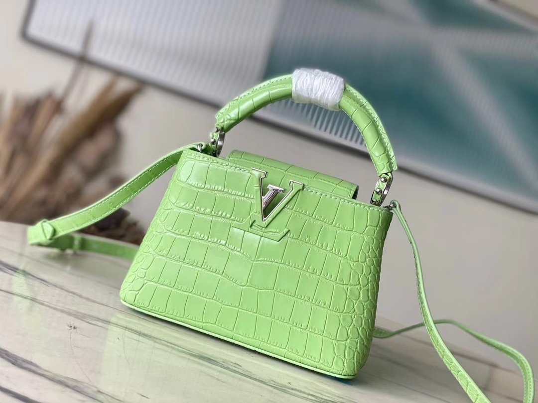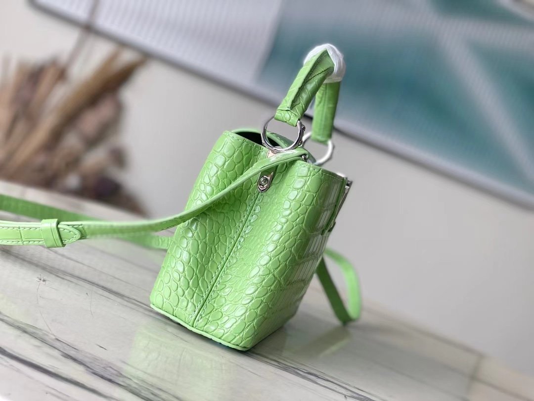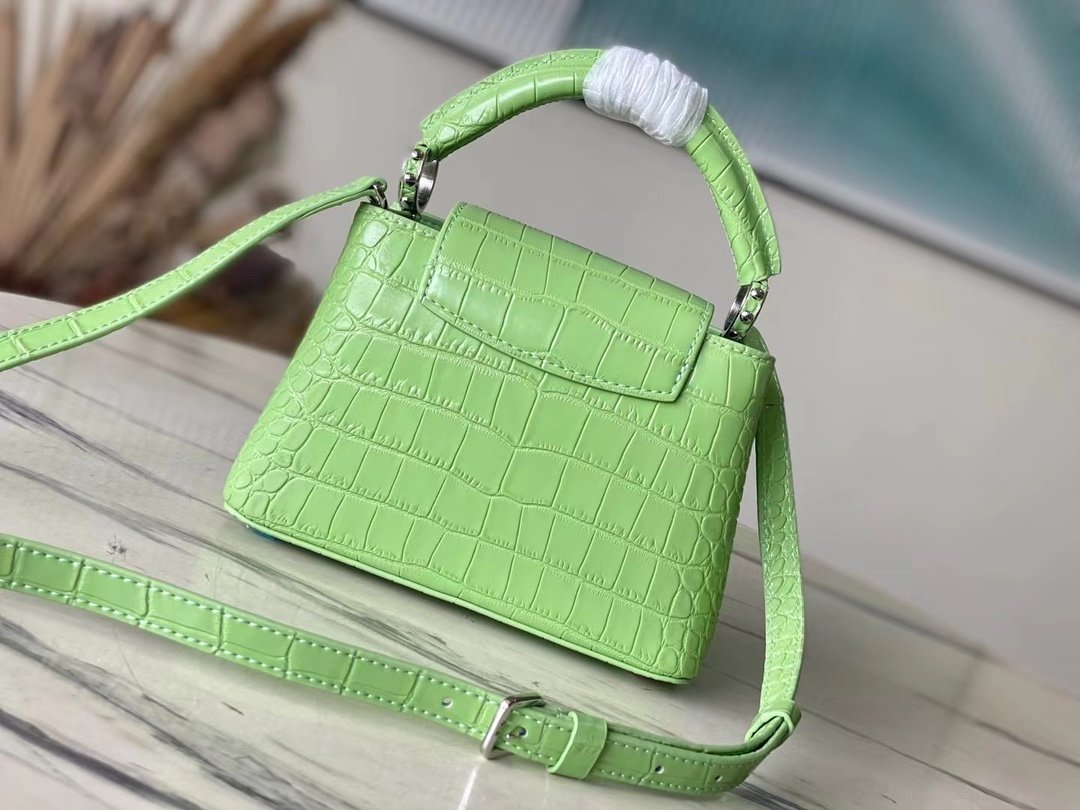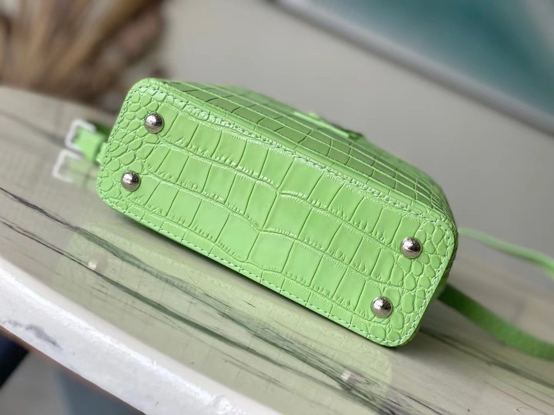 Special original order M48865 green crocodile pattern silver buckle. This precious Capucines mini handbag is made of crocodile leather pattern and has been treated with high gloss. It shines with charming and luxurious goatskin lining and sparkling metal accessories. The unique Capucines cover can be stored in the bag to display the letter logo and Can be folded out to display the Monogram Flower pattern. Compact size. Ideal accessory for night outing. Size: 21*14* 8cm